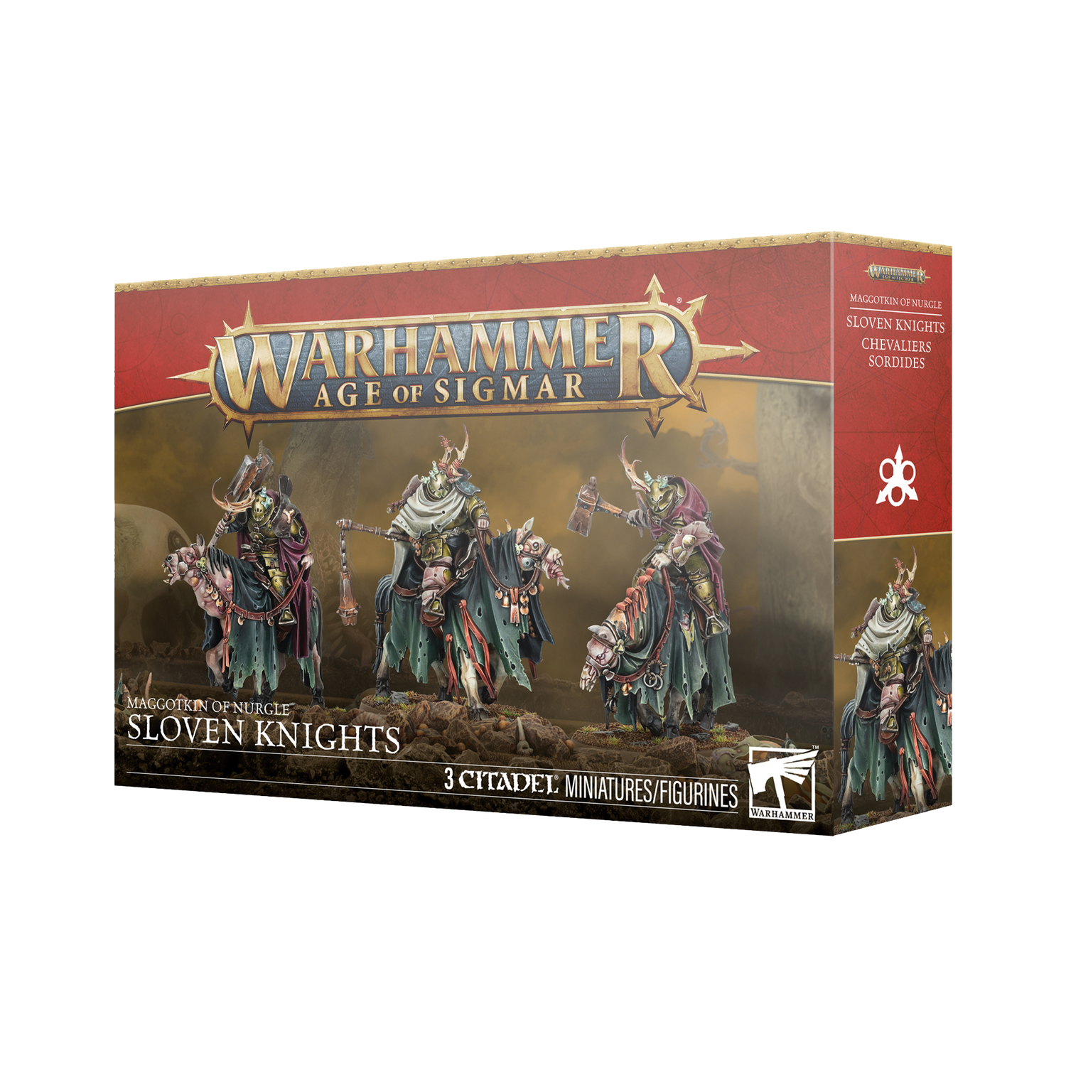 This multipart plastic kit builds 3 Sloven Knights, elite cavalry for Maggotkin of Nurgle armies in Warhammer Age of Sigmar. Fast and hard-hitting, these corrupted cavaliers excel at flanking and rapid engagements, smashing through enemy lines with entropic bludgeons that tear apart even heavily armored foes. Their speed allows them to react quickly to shifting battlefields, making them a powerful complement to slower infantry forces. The kit includes interchangeable heads, with options to build an optional champion, offering flexible customization.