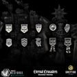 This set includes a selection of decorative shoulder shields, scaled for Space Marine–style armor and designed to mount onto power armor as honorific tilting plates for champions, veterans, and decorated brethren.