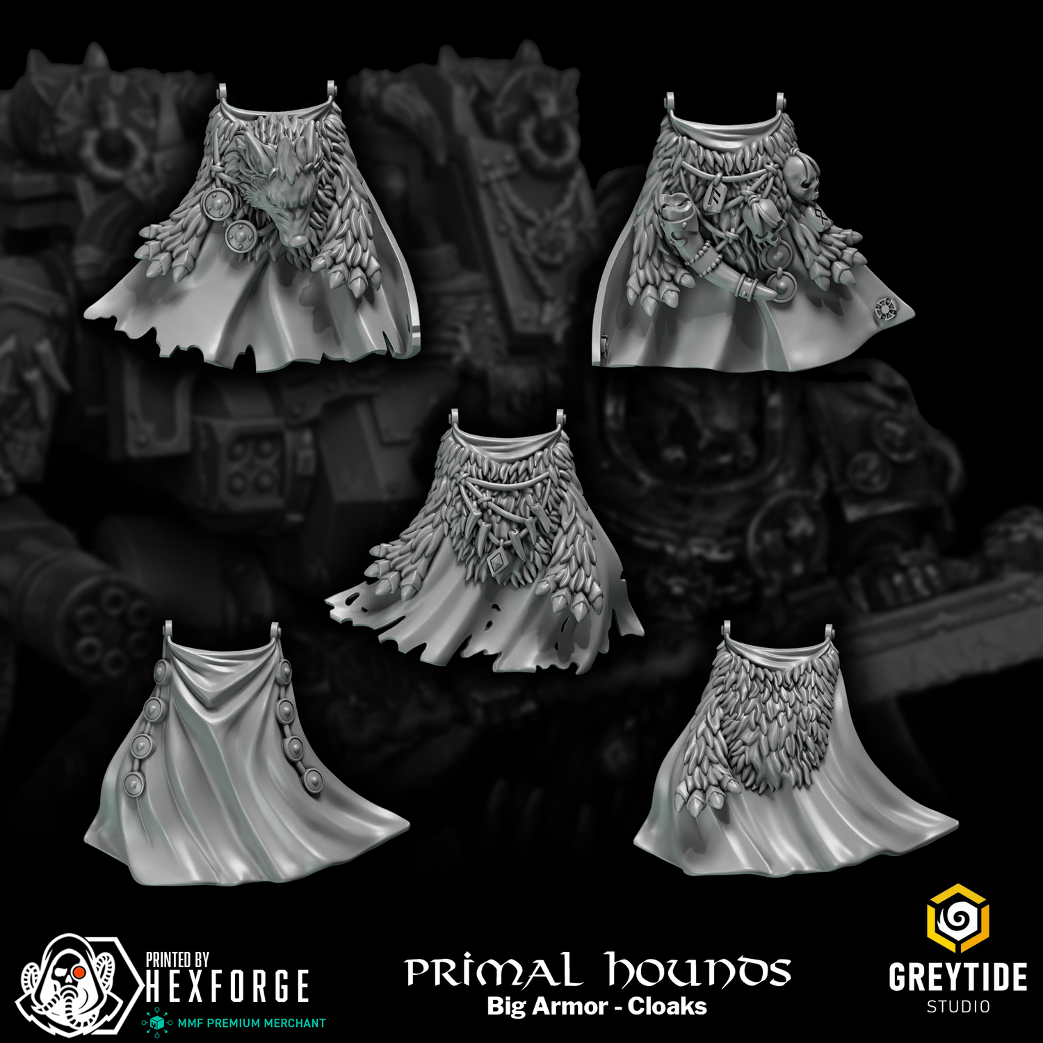 The Big Armor: Cloaks Set includes a selection of richly detailed cloaks designed to adorn your most imposing champions. Each sculpt reflects the feral majesty and ancestral pride of the Primal Hounds—tattered pelts, rune-bound leathers, and war-torn banners flow behind warriors forged in saga and slaughter.