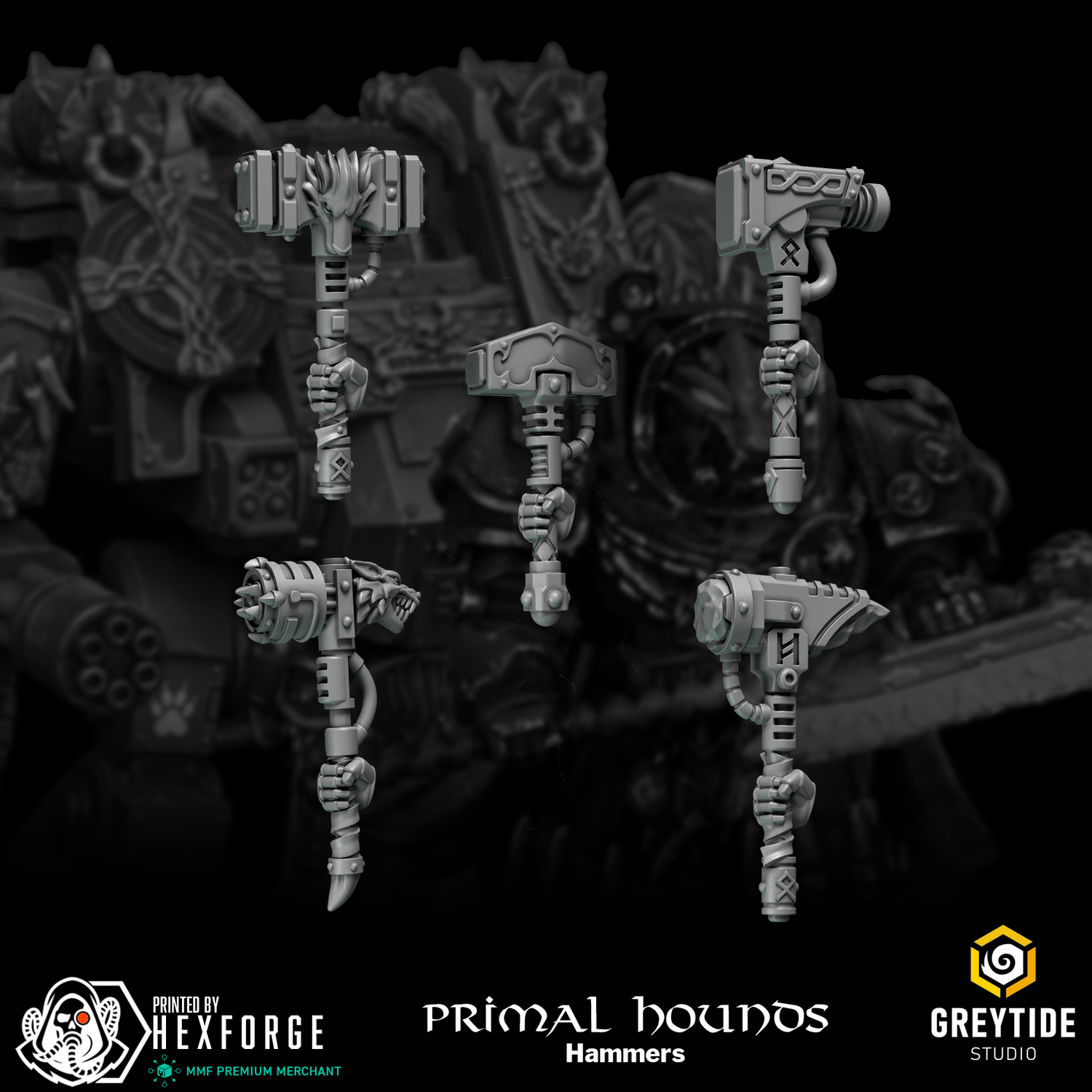The Hammers Set includes a variety of savage, war-forged melee weapons designed for heroic-scale infantry. Each hammer is adorned with drake-scale wraps, carved knotwork, runic bands, and feral ornamentation—perfect for outfitting your warriors with the grim heritage of the Hounds.