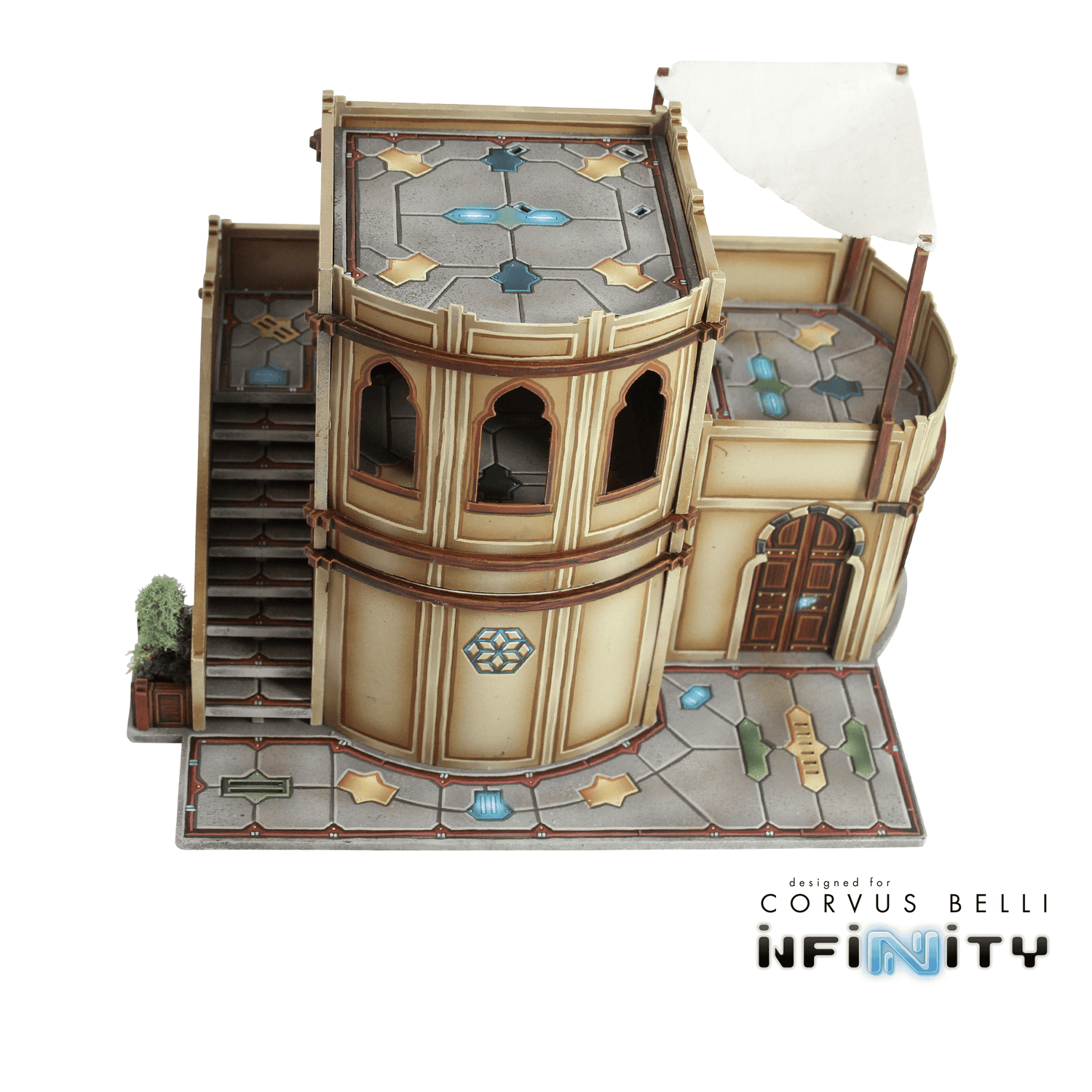 The Alcazaba Commercial Building is a medium-sized Haqqislam-themed building with playable interiors for Infinity the Game. When assembled, the Alcazaba Commercial Building measures approximately 9" x 7" x 6" tall.