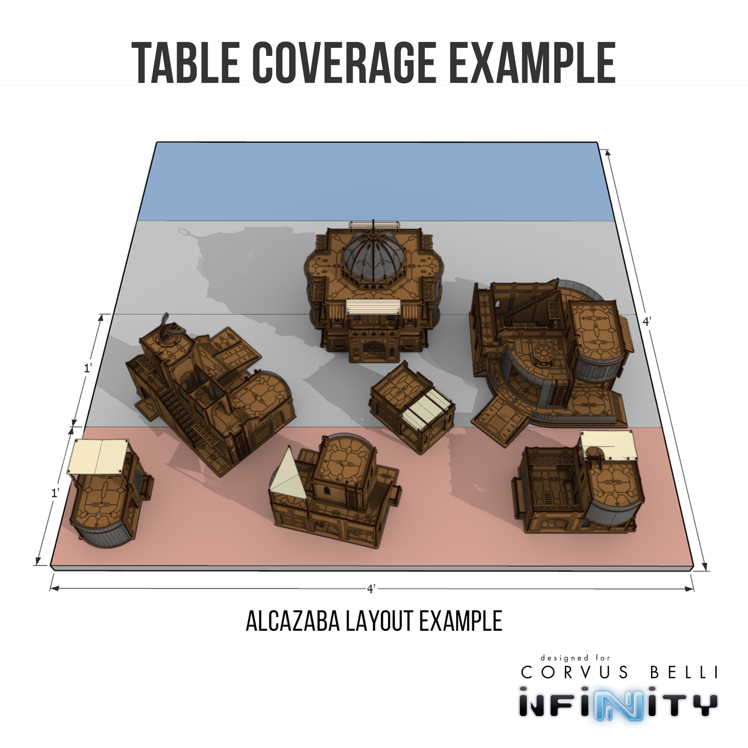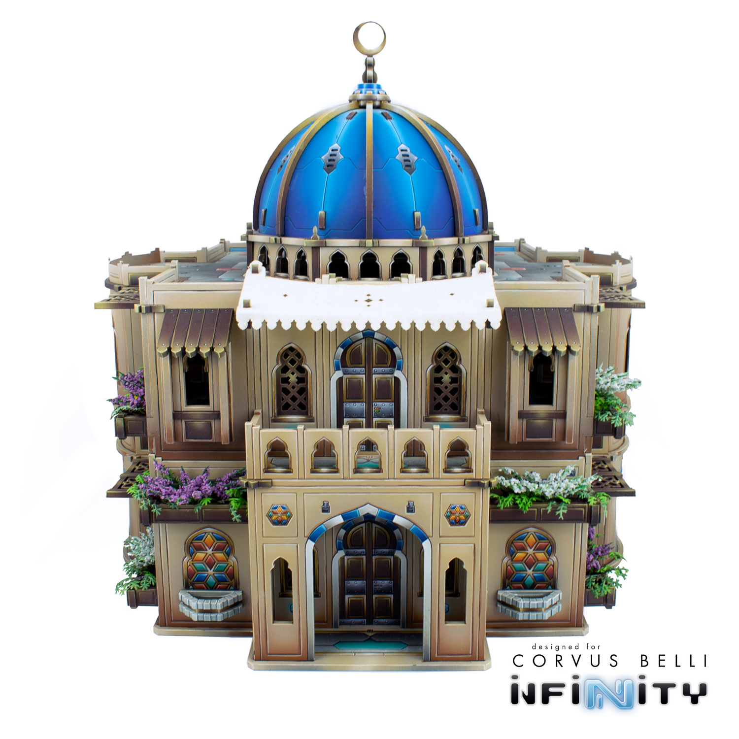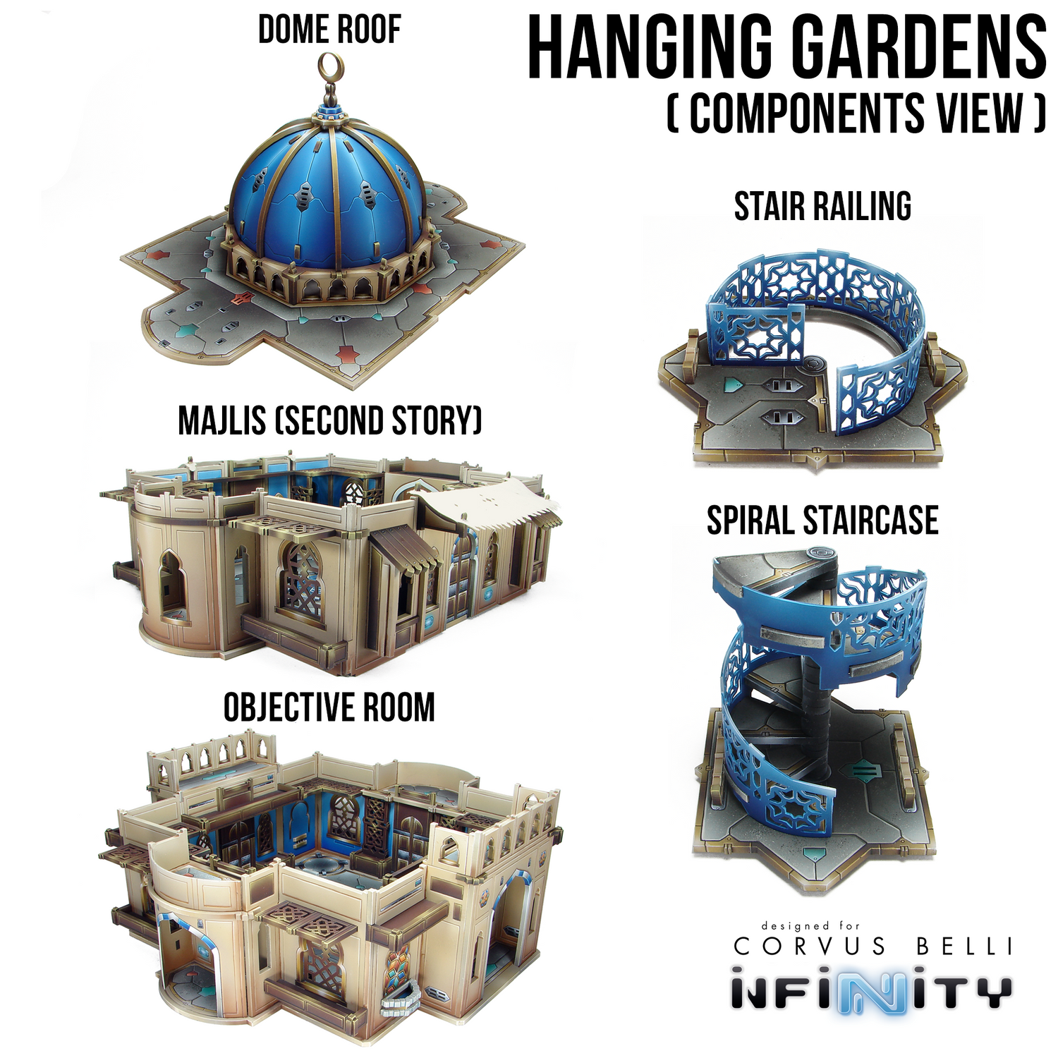 The Alcazaba Hanging Gardens is a massive centerpiece and objective room for our range of Haqqislam-themed terrain for Infinity the Game.  This unique building offers two stories and eight individual alcoves. It includes a spiral Staircase to connect the two floors.