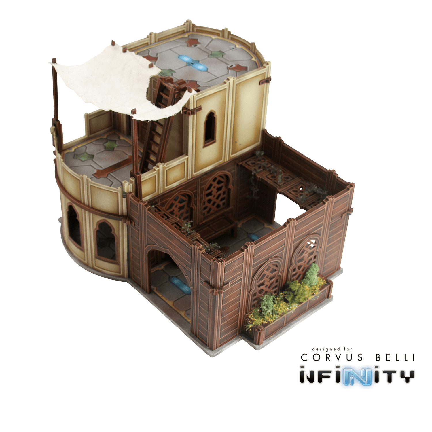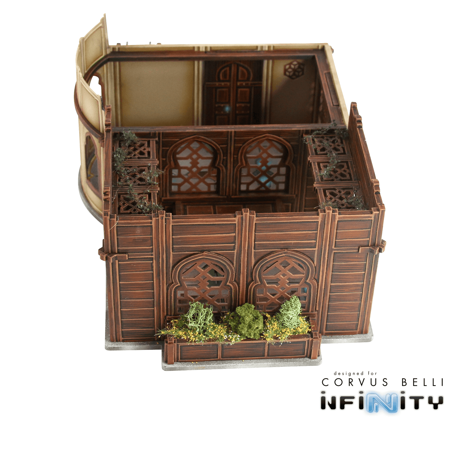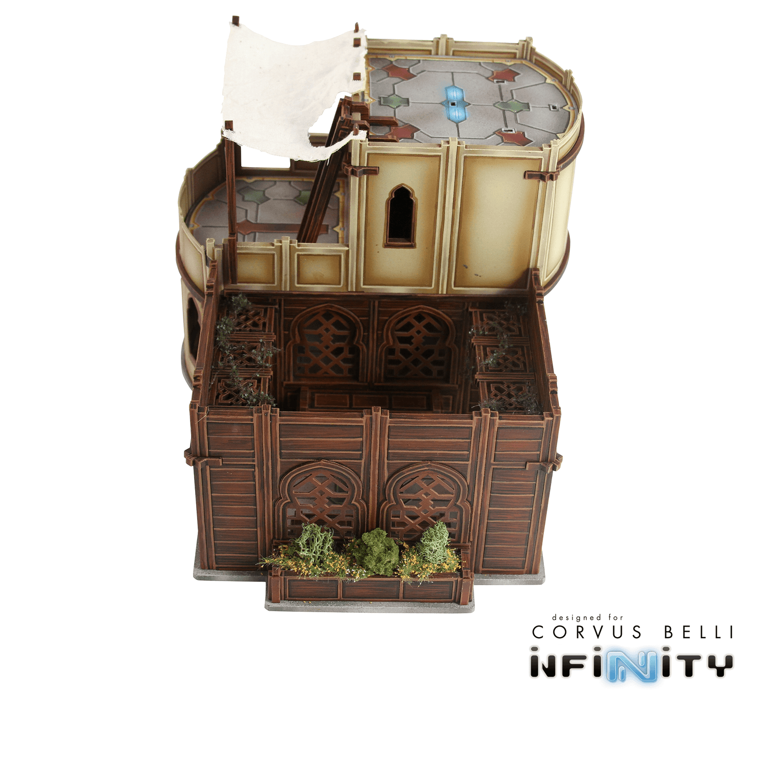 The Alcazaba Residential Building is a medium-sized Haqqislam-themed building with playable interiors for Infinity the Game. When assembled, the Alcazaba Residential Building measures approximately 9" x 7" x 6" tall.