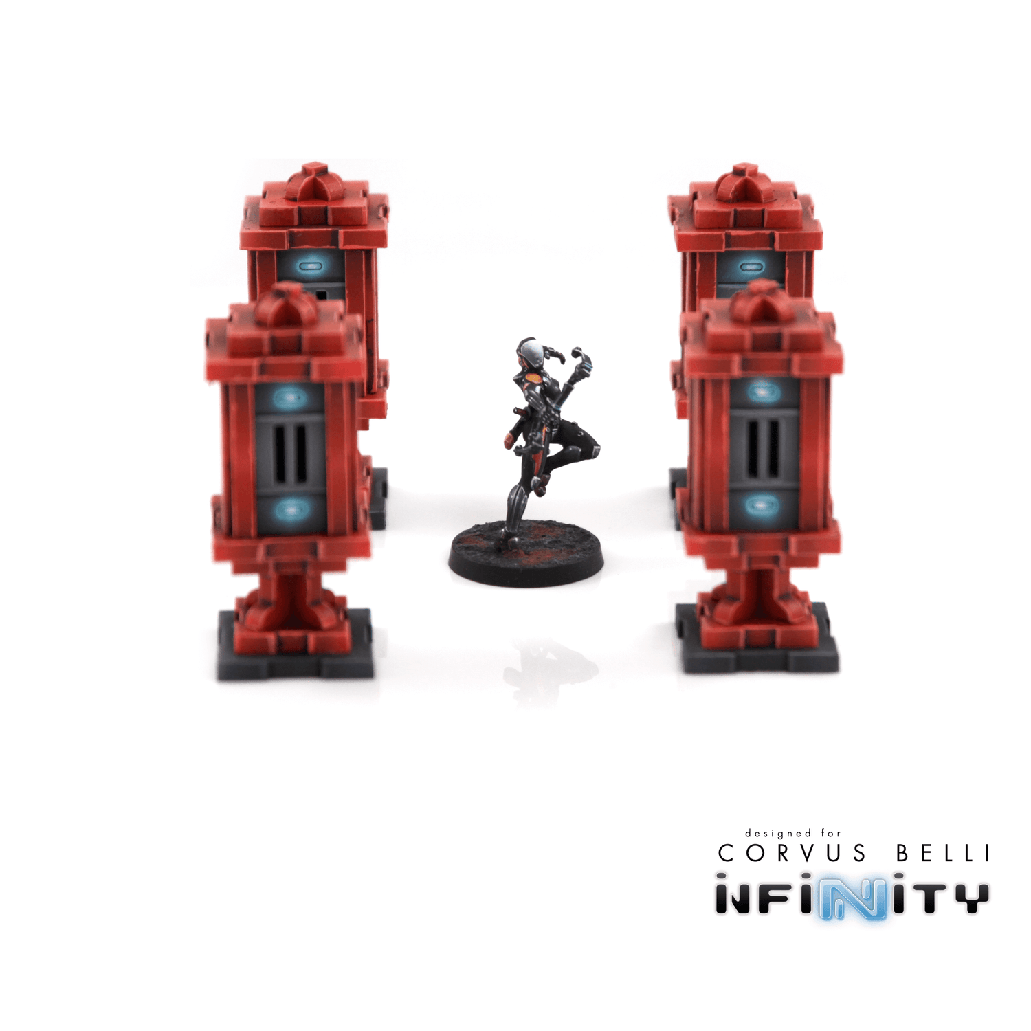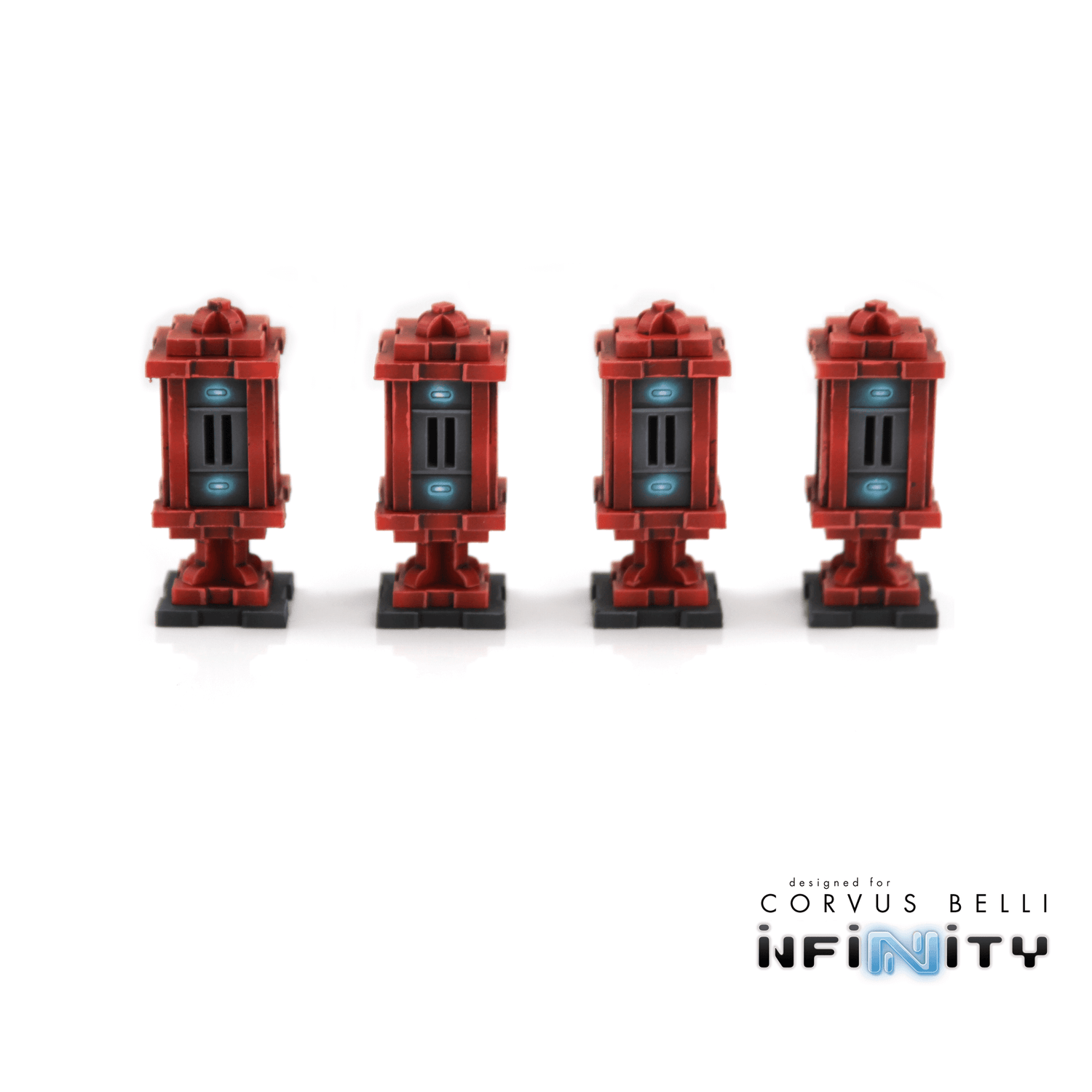This is a four-pack of Sunomata Lanterns, JSA-themed scatter terrain designed for Infinity the Game.