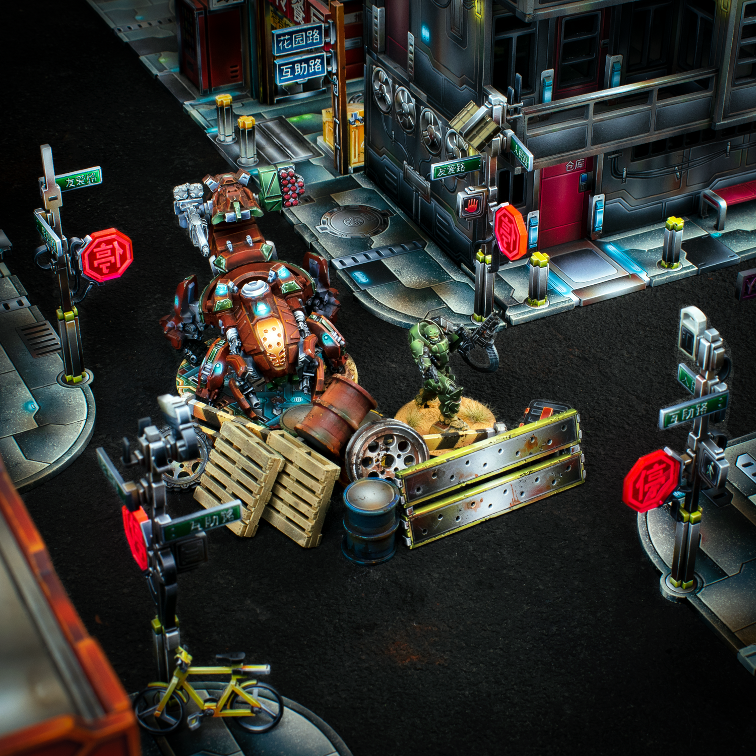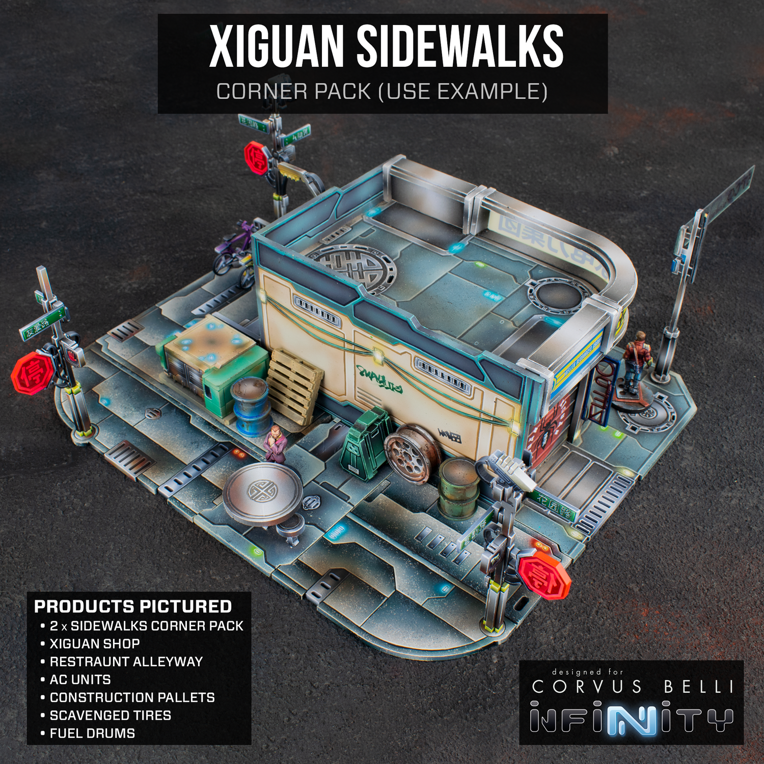 Xiguan is Yu Jing-themed urban terrain designed for Infinity the Game. The buildings, sidewalks, alleyways, and back alleys are designed to interlock in interesting ways to create any density of future urban sprawl that you can imagine.