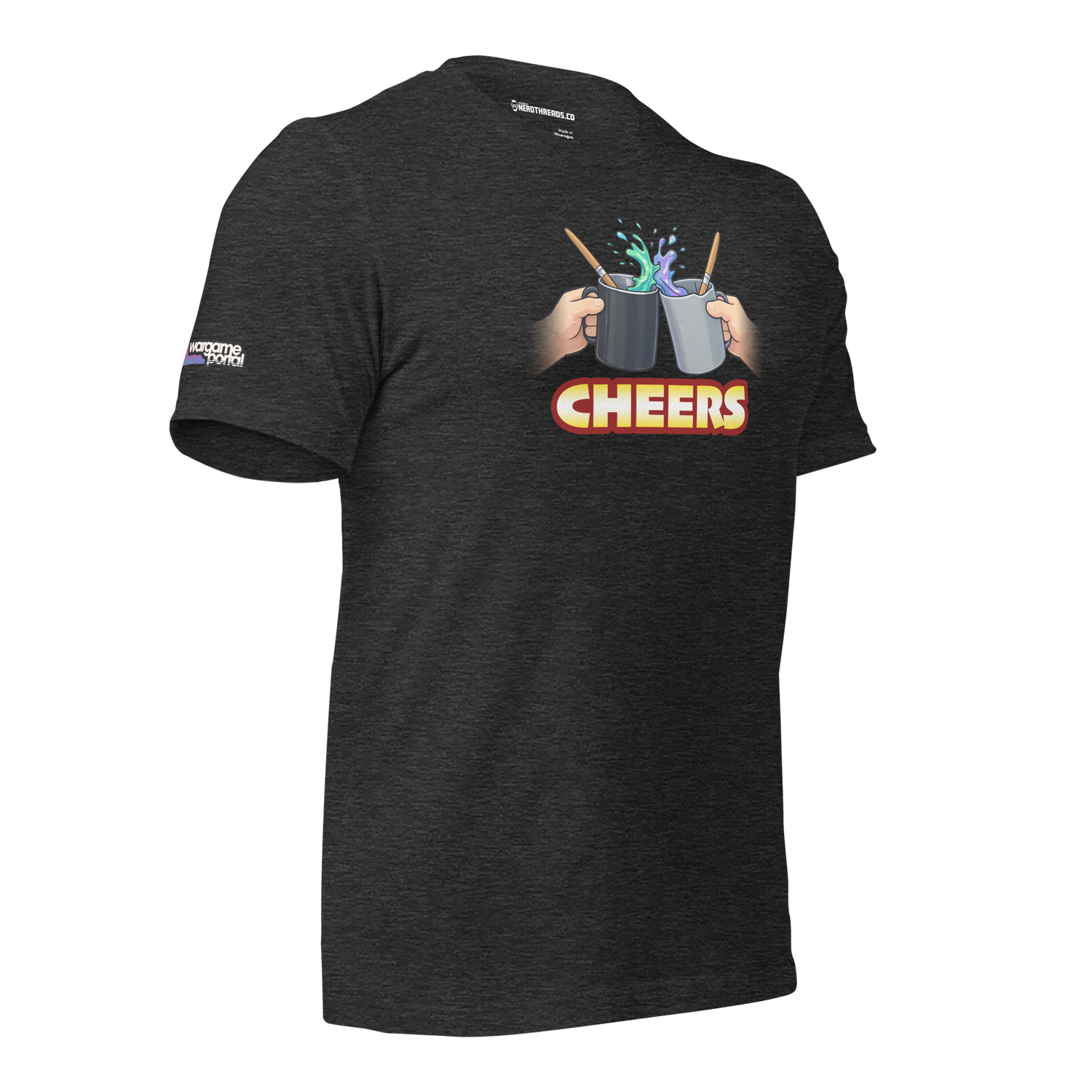 The Cheers T-Shirt captures that perfect hobby moment, two dedicated painters clinking their well-loved hobby mugs together in celebration, brushes sticking out the top, colorful paint water splashing mid-toast. It’s messy. It’s triumphant. It’s the universal sign that a long session at the desk just hit its stride.