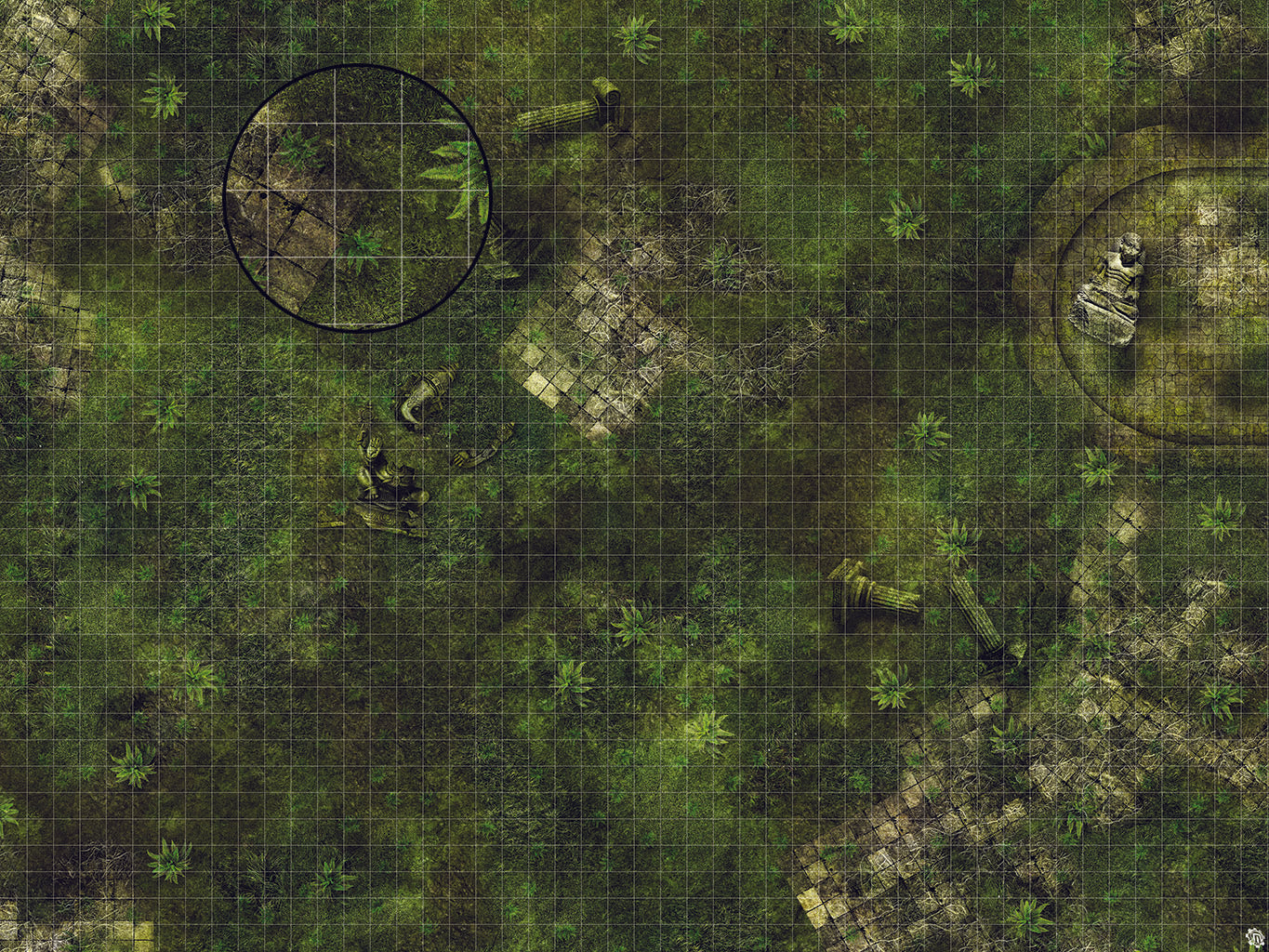 Civilization fades, as nature retakes what is her's in heart of the Forgotten Temple (Basin) The ruins of this once thriving community succumb to the relentless earth. The waters of this ancient fountain have long been dry, but danger may yet haunt this jungle.