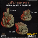 Crafted by Zabavka Workshop and expertly printed by Printology Labs, the 'Defeated City' base set brings your miniatures into the ruins of a once-mighty gothic shrine city. Shattered colonnades and the remnants of colossal cathedral spires loom over broken plazas, their sacred purpose long forgotten. Cracked ferrocrete, twisted rebar, and fallen pillars tell the tale of a grand city reduced to dust, its towering monuments now nothing more than crumbling silhouettes against a war-torn skyline. Perfect for gothic sci-fi settings, these bases capture the stark beauty of a civilization brought low by relentless warfare.