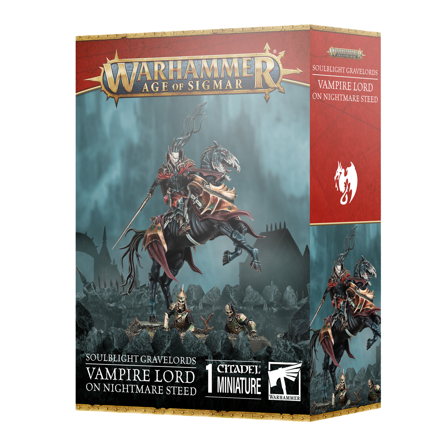 This multipart plastic kit builds a Vampire Lord on Nightmare Steed, a cruel leader for your Soulblight Gravelords armies in games of Warhammer Age of Sigmar. Seated atop a nightmare, they are able to keep up with the fastest elements of your army, making them ideal to lead your thunderous cavalry charges. The kit includes two head options for the nightmare, three head options for the lord, and a choice of an axe or a sword as a weapon, making it easy to customise your blood-hungry leader.