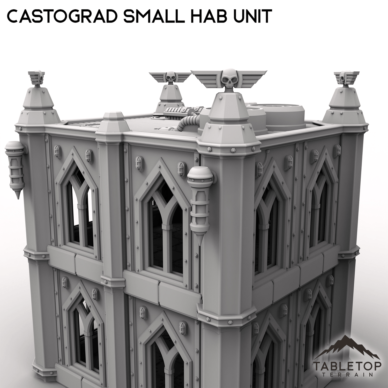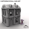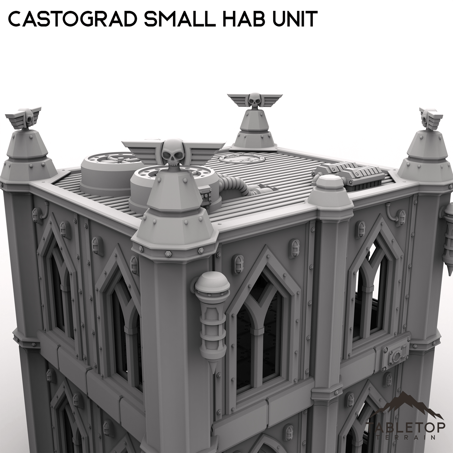 Castograd Small Hab Unit is a simple, sturdy building that matches the look and feel of other items for the Castograd set. The building has 2 different roof options, both of which are included with each building. The front door is removable, and has a small slot of sliding it open and closed as needed.