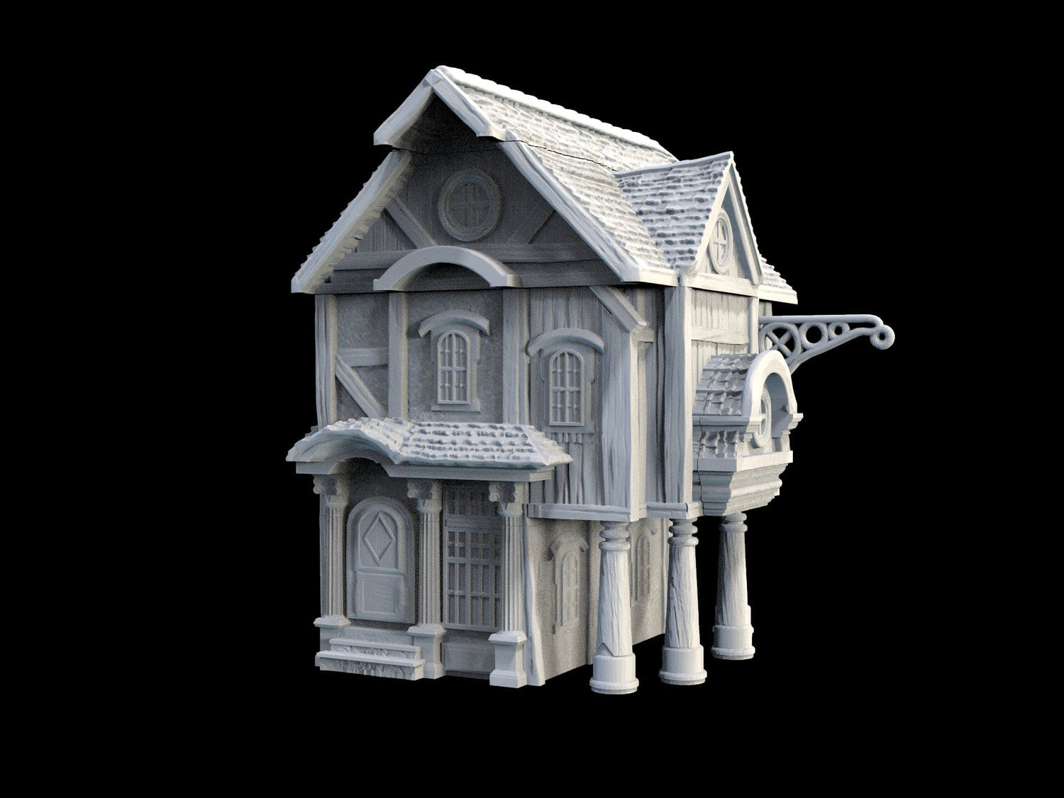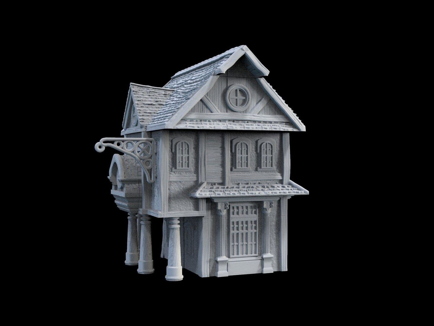 The Cobbler House from the Town of Grexdale. This building is massive and features a fully playable interior with multiple floors. It's a great addition to any fantasy tabletop. It would fit right in to a game of Age of Sigmar (AOS), Dungeons and Dragons (DND), Malifaux, Kings of War, Middle Earth Miniatures, or other fantasy games. It is available to be 3d printed in 15mm, 20mm, 28mm, or 32mm scale in .2mm high quality resolution.