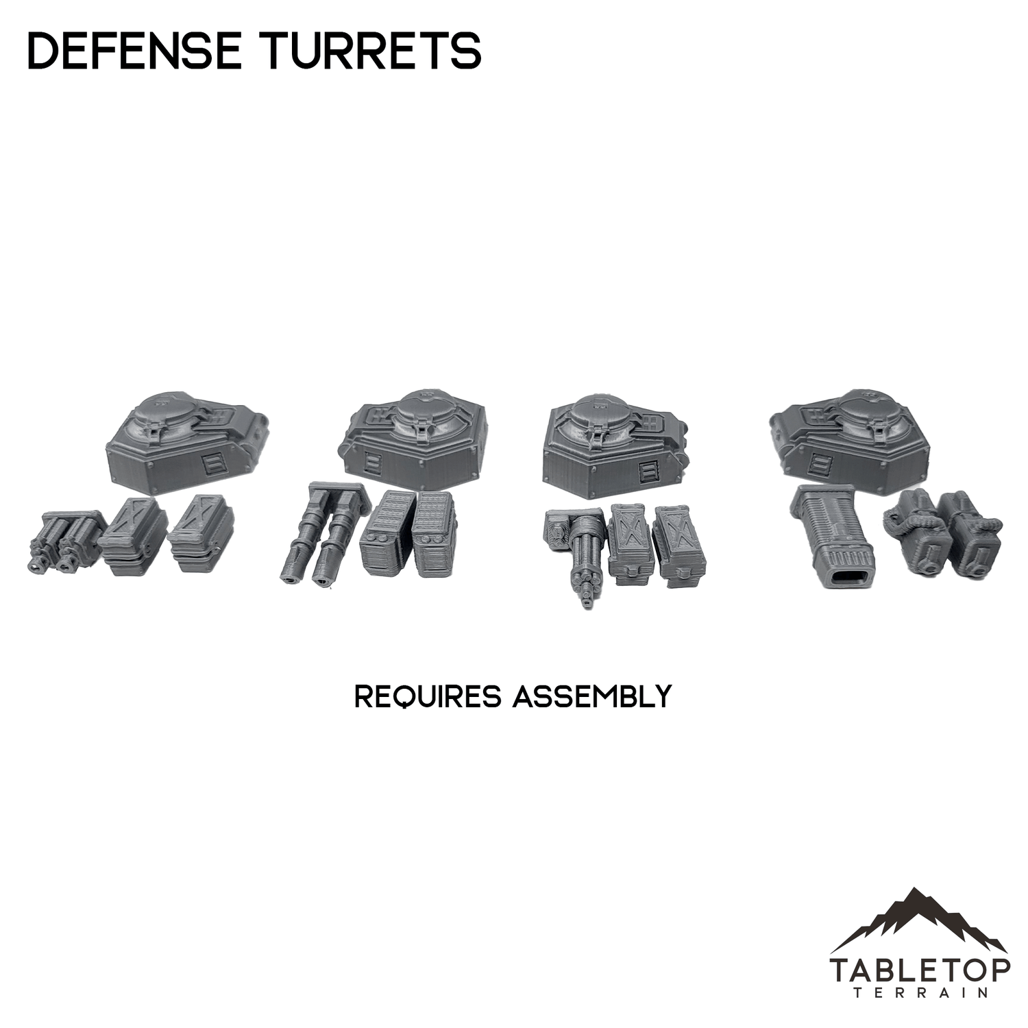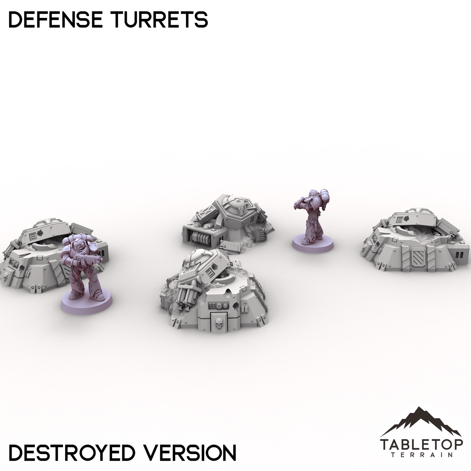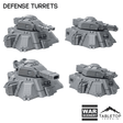 The Defense Turrets is a set of four small defense turrets with articulating turret heads. It comes with all four gun options- assault cannon, bolter, laser and plasma. They require assembly, but have a peg and groove system to aid with gluing.