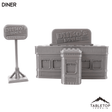 The Diner is a singular building and includes a freestanding sign. The building is slightly smaller than some of the other sets in the urban collection, so that it can fit within crowded tabletop setups. The Diner is a great set for filling out a large cityscape for urban hero tabletop games.