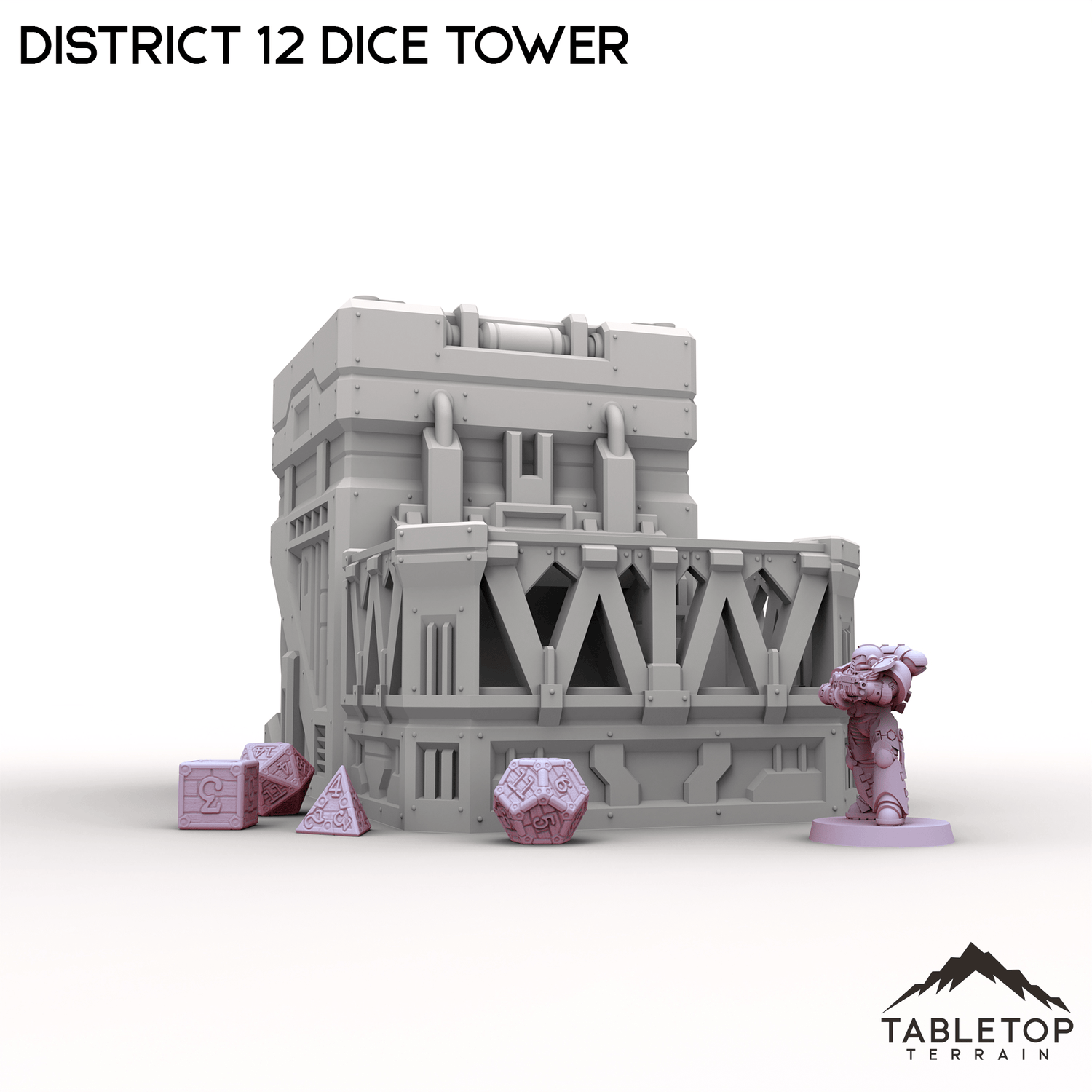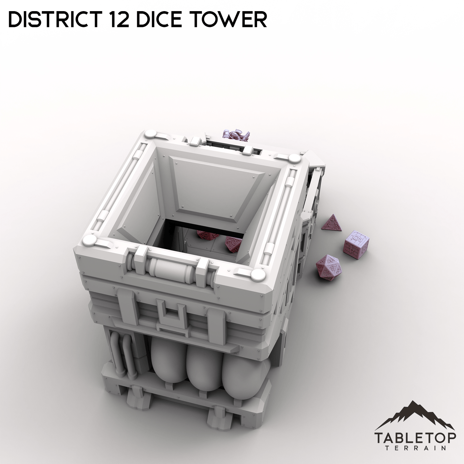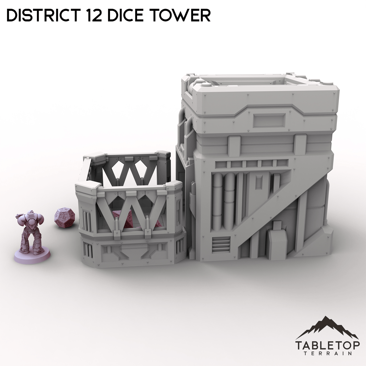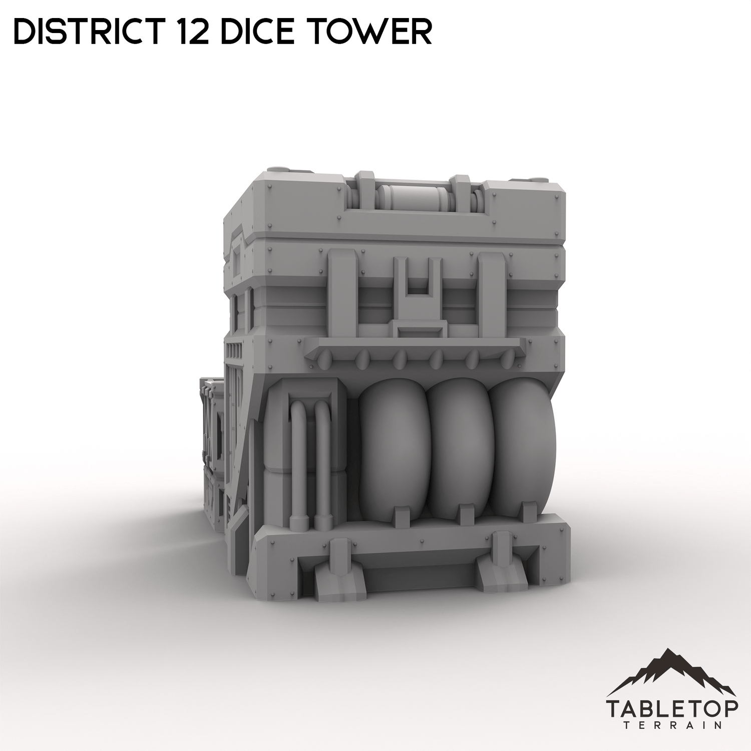 The District 12 Dice Tower is a stout, sturdy tower for rolling dice at the table. The tower is stylized like an industrial building for themed games, and comes in 2 parts for easy storage.