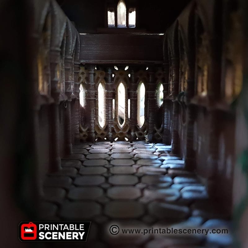 The Living Hall is an Elven themed building that features a removable roof and functioning doors. It has a lot of space in the middle for miniature placement, as if to hold a meeting. The Hall would be perfect for fantasy games such as Dungeons and Dragons (DND), Age of Sigmar (AoS), Pathfinder, Frostgrave, or Conquest.