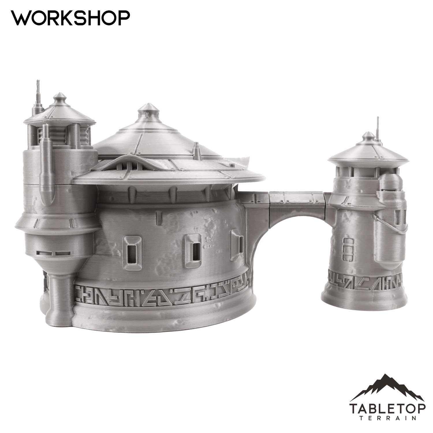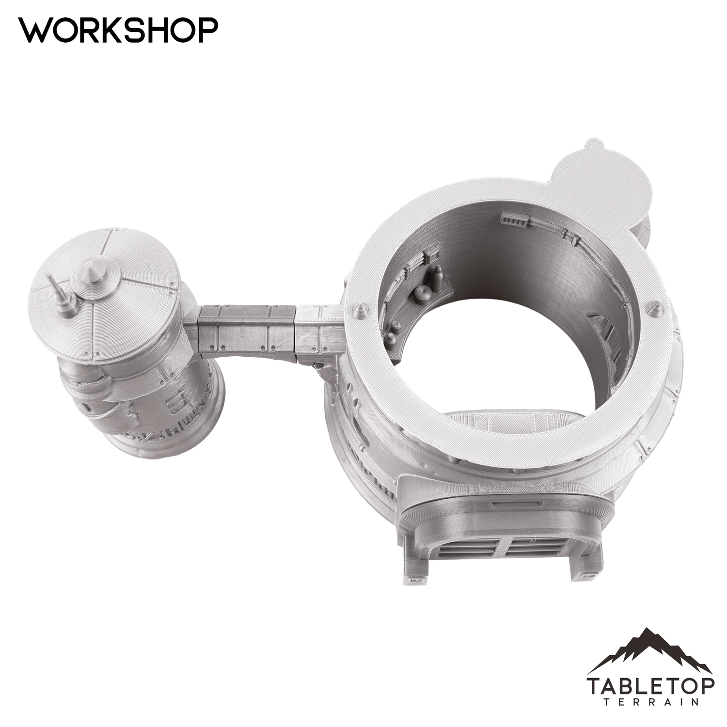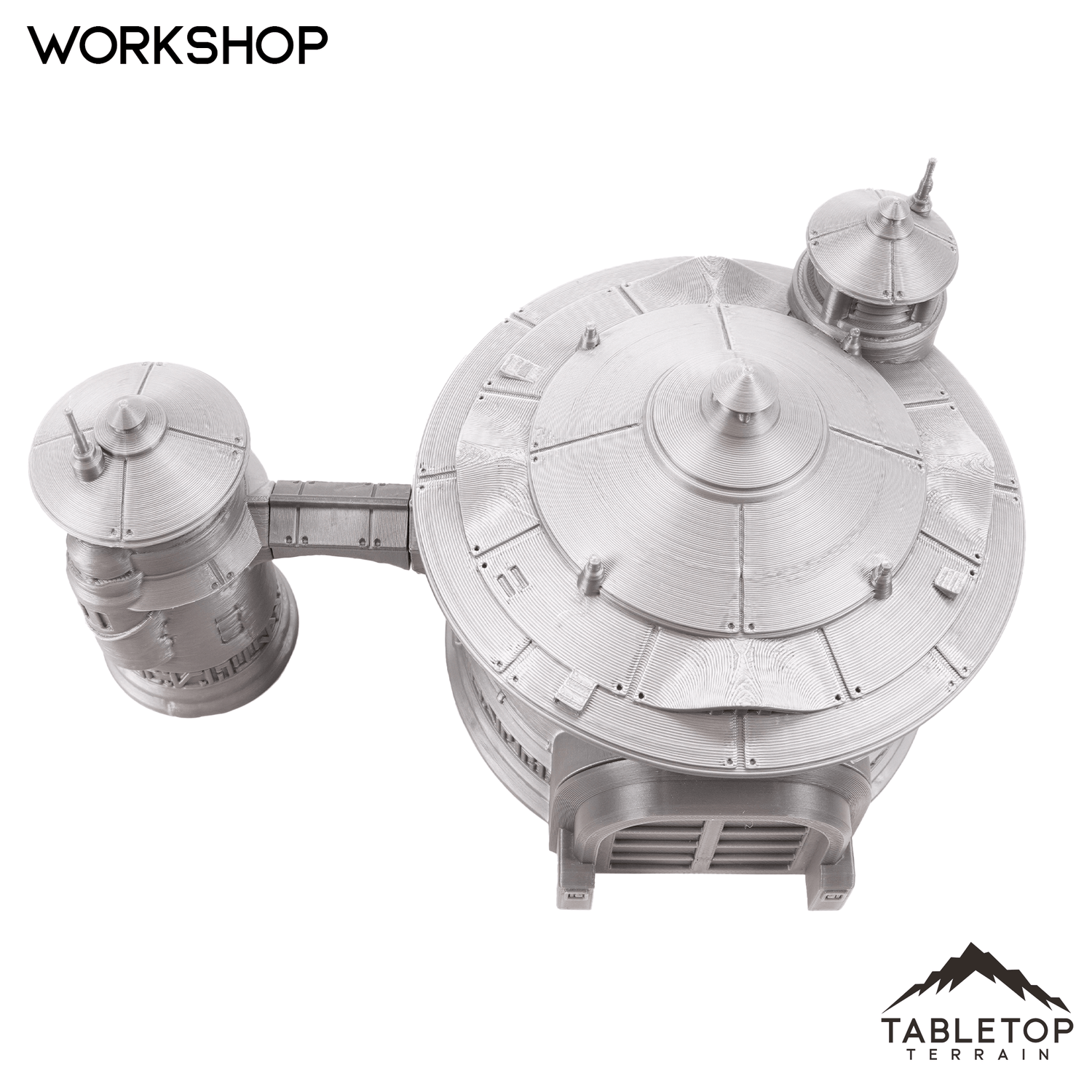 The Workshop is an Outer Rim styled building featuring a removable roof and detailed interior as well as an external tower. The Workshop is printed in 40mm, 28-35mm (1:47), 20mm, and 15mm scale. We recommend the 40mm scale for Shatterpoint and the 28-35mm (1:47) scale for Legion.