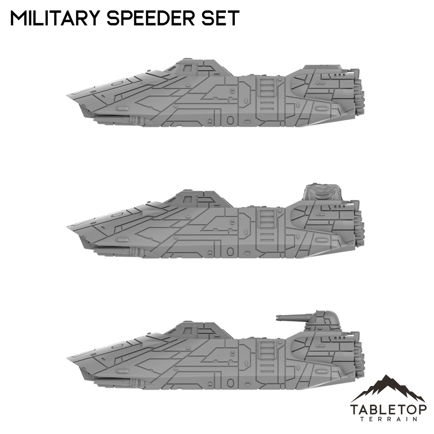3 Military Speeders. They are scaled to be compatible with both Star Wars Legion (35mm scale) and Shatterpoint (40mm scale).