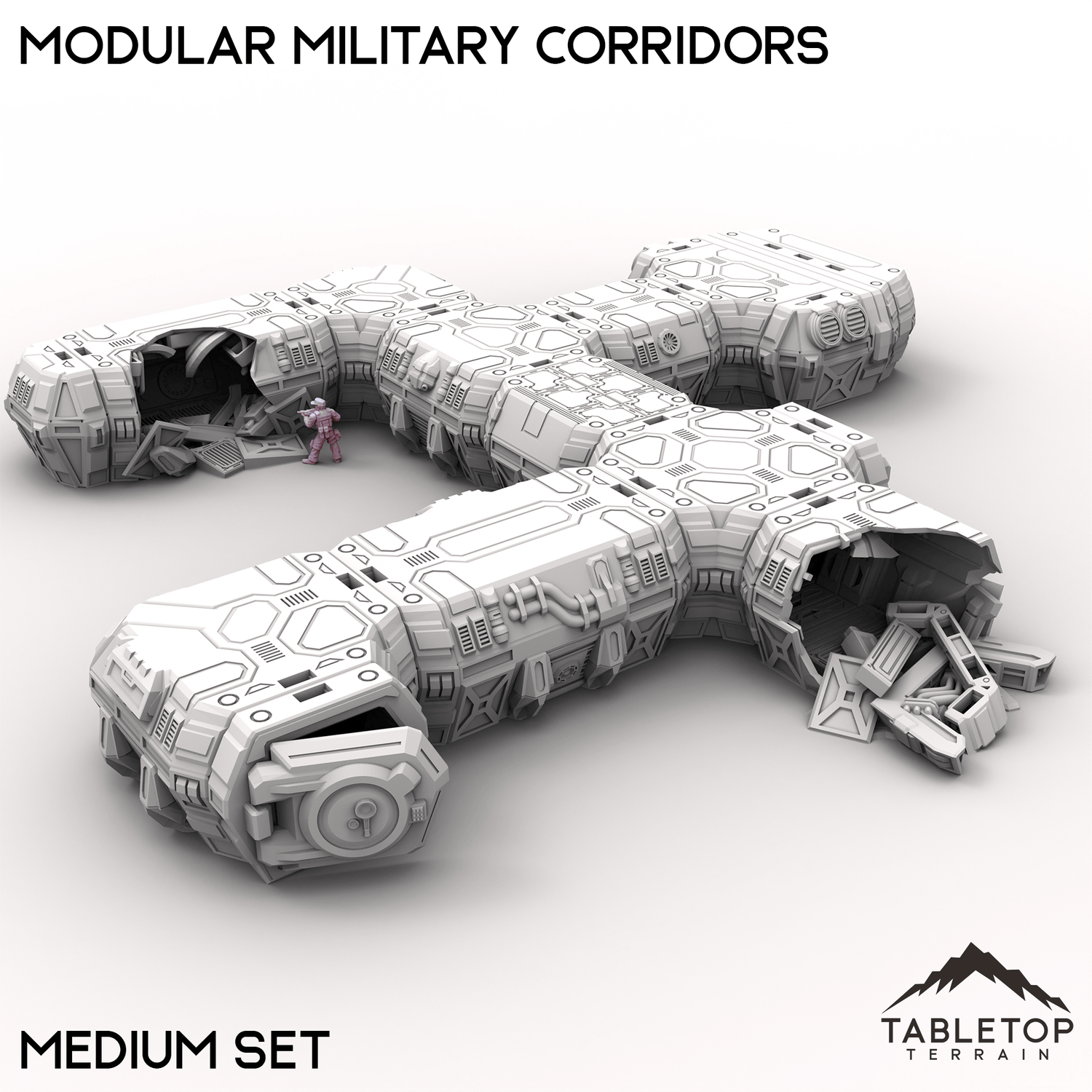 Large The Modular Military Corridors are perfect for building out the tight, gritty interiors of a base or starship. Each section connects cleanly to the next, letting you create winding hallways, intersections, or sprawling complexes with ease. With reinforced paneling, exposed conduits, and heavy bulkhead-style doors, they bring a industrial or sci-fi feel to your tabletop. These Modular Military Corridors are also able to be mixed-and-matched with other Outpost Origins and The Dragon's Rest sets. An example would be mixing parts from Modular Military Corridors and Modular Bunkers to create a strong defensive formation.
