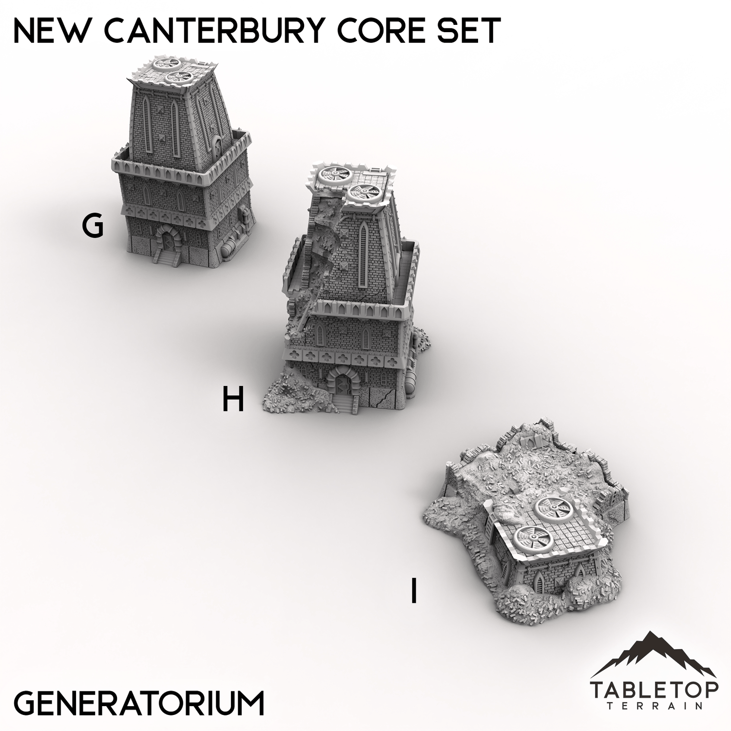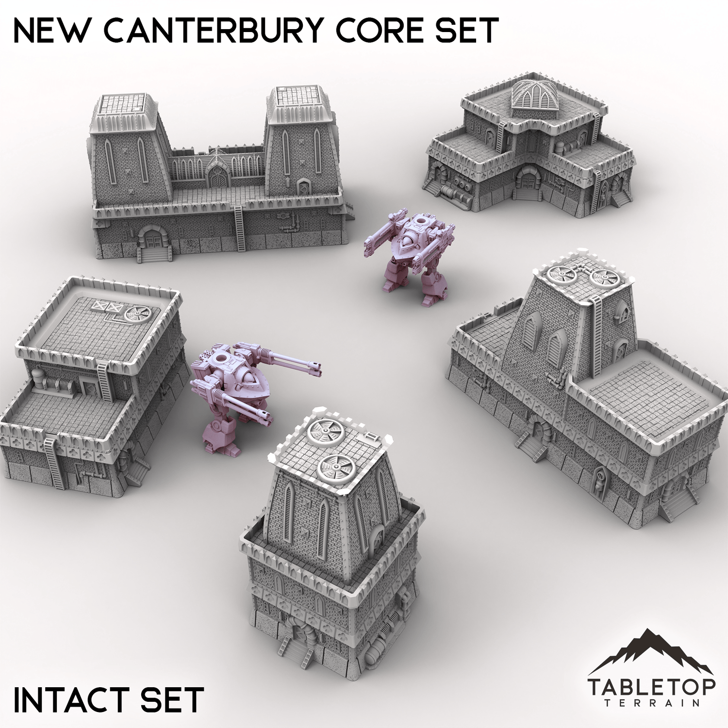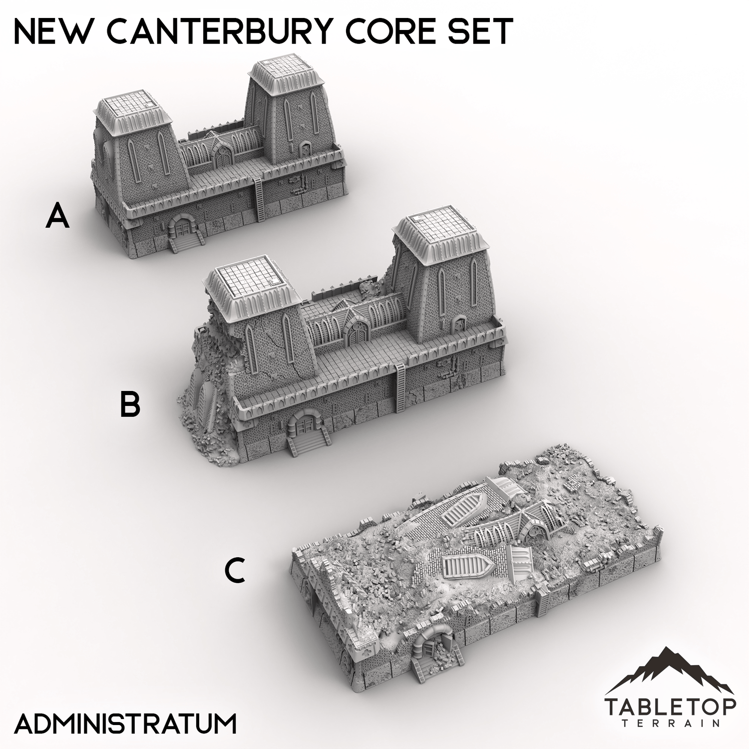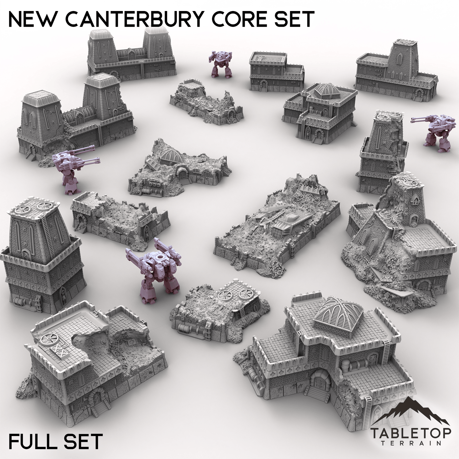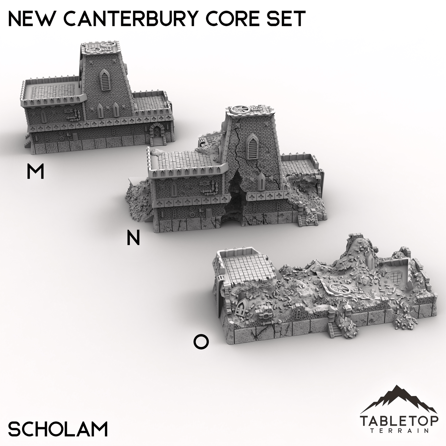The New Canterbury Core Set designed by Thunderhead Studios is a collection of 5 different buildings, each with 3 different variations: Intact, Damaged, and Destroyed. The set is perfect for making a large cityscape that has an array of damage spread throughout it. Or, if you'd prefer, you can swap the buildings mid-battle to show the destruction happening as a result of the fight. The set is sold in a number of bundles to chose from, or you can buy each building one by one if you'd prefer.