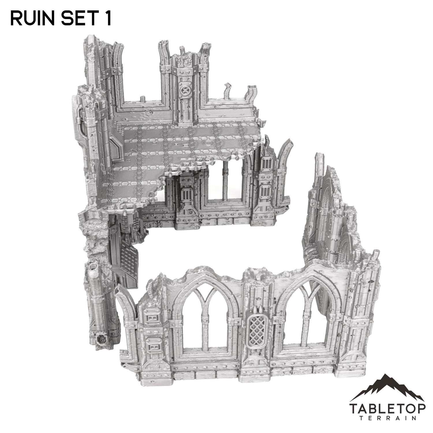 The Ruin Set 1 is an essential piece to a Sci-Fi terrain set. It has gothic detailing with some sci-fi flair such as terminals and vents, although it could potentially double as a high-tech fantasy ruin. The base set comes with one two-story stackable ruin with an upper floor and one standalone ruin. The bundle comes with two of each set for a more comprehensive battlefield.