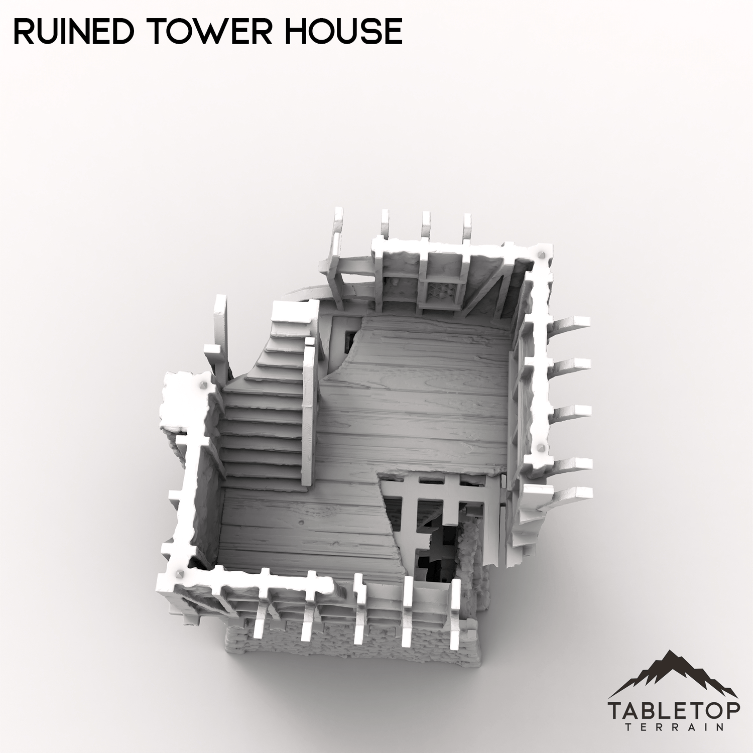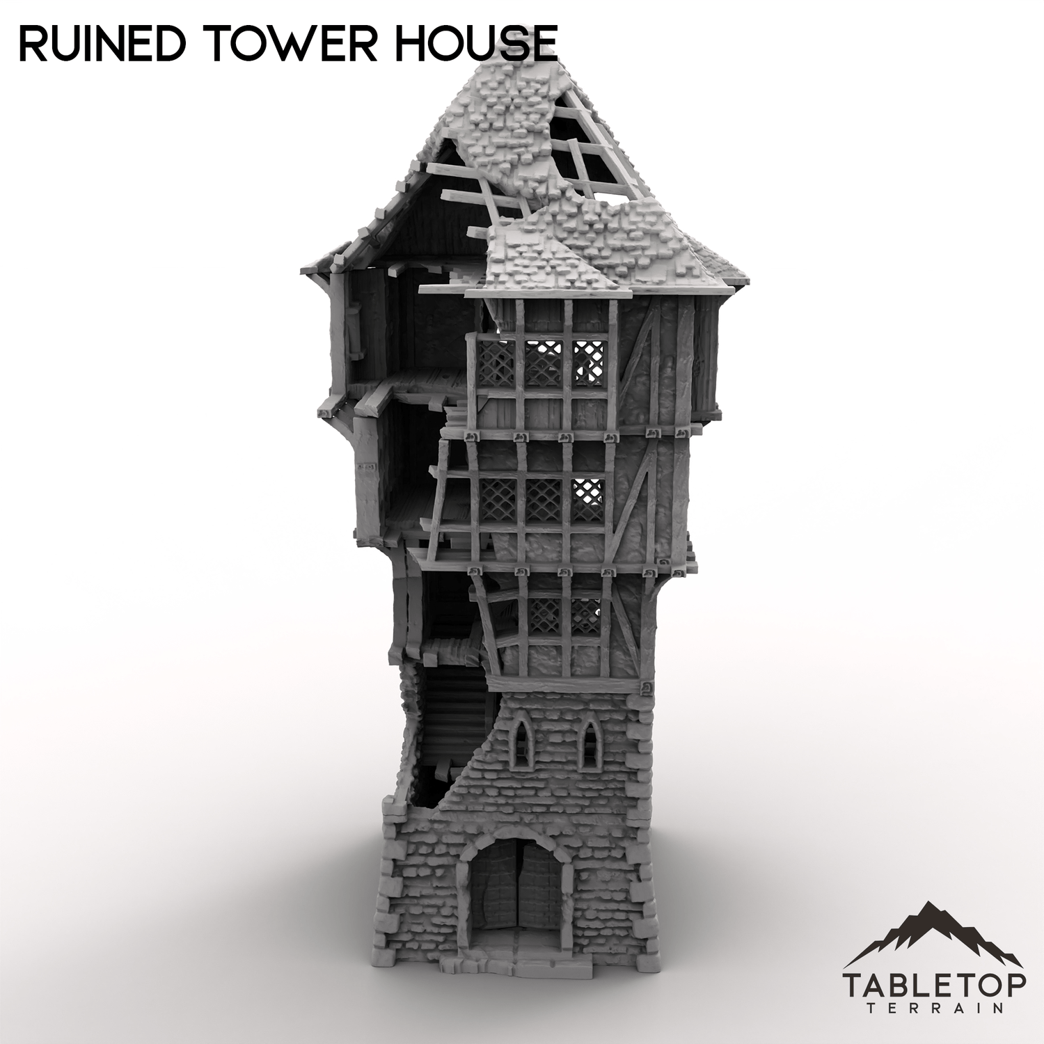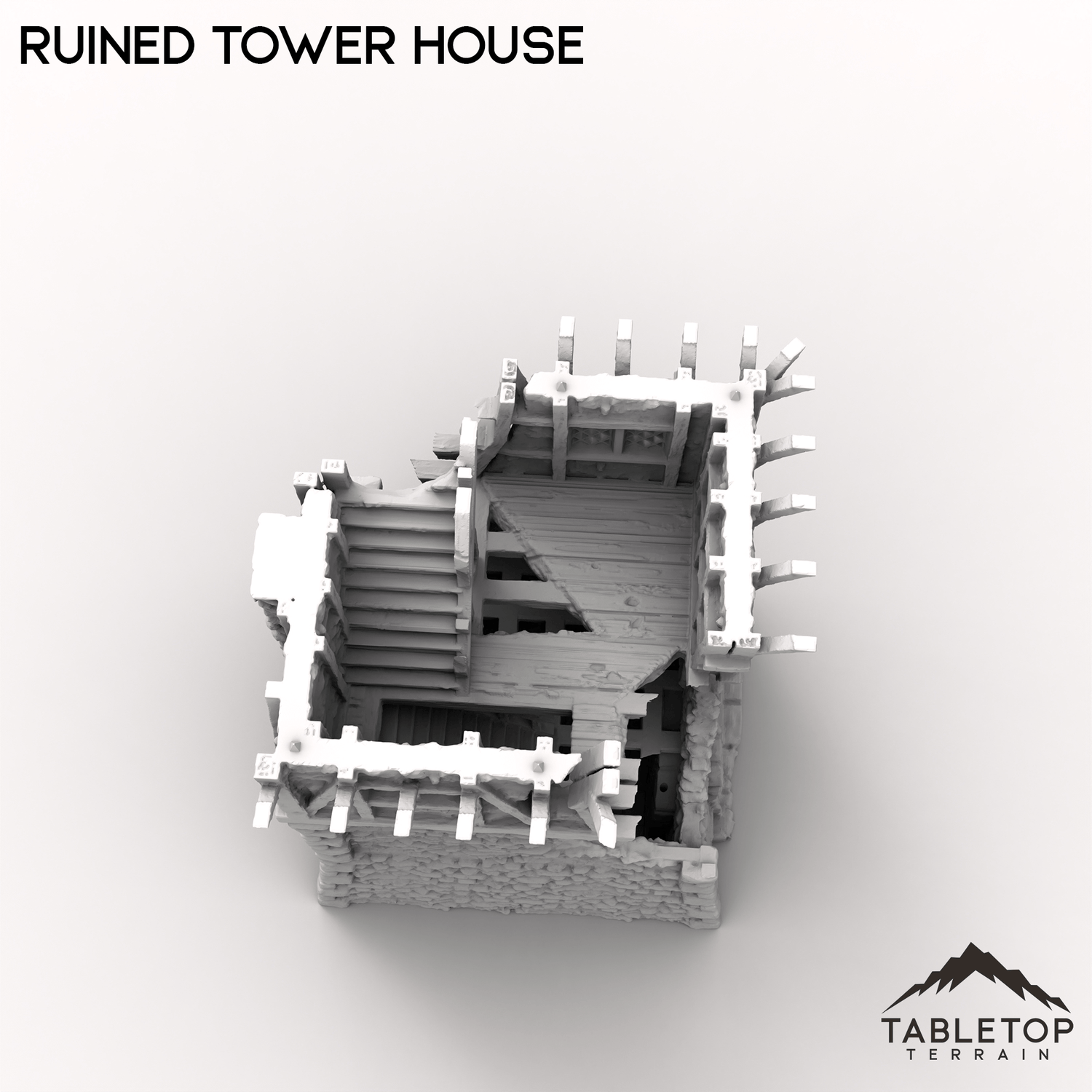 This Ruined Tower House is a 4-story tower, swaying dangerously under its slowly failing supports. The walls have fallen away, exposing the crumbling interior to the elements and outside threats. What secrets did this tower once hold?