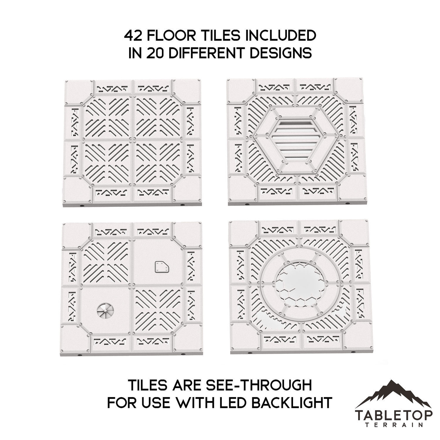 Floor Set adds- 42 Floor tiles, 26 Floor Border Tiles, 56 Floor Risers for underneath LED lighting.