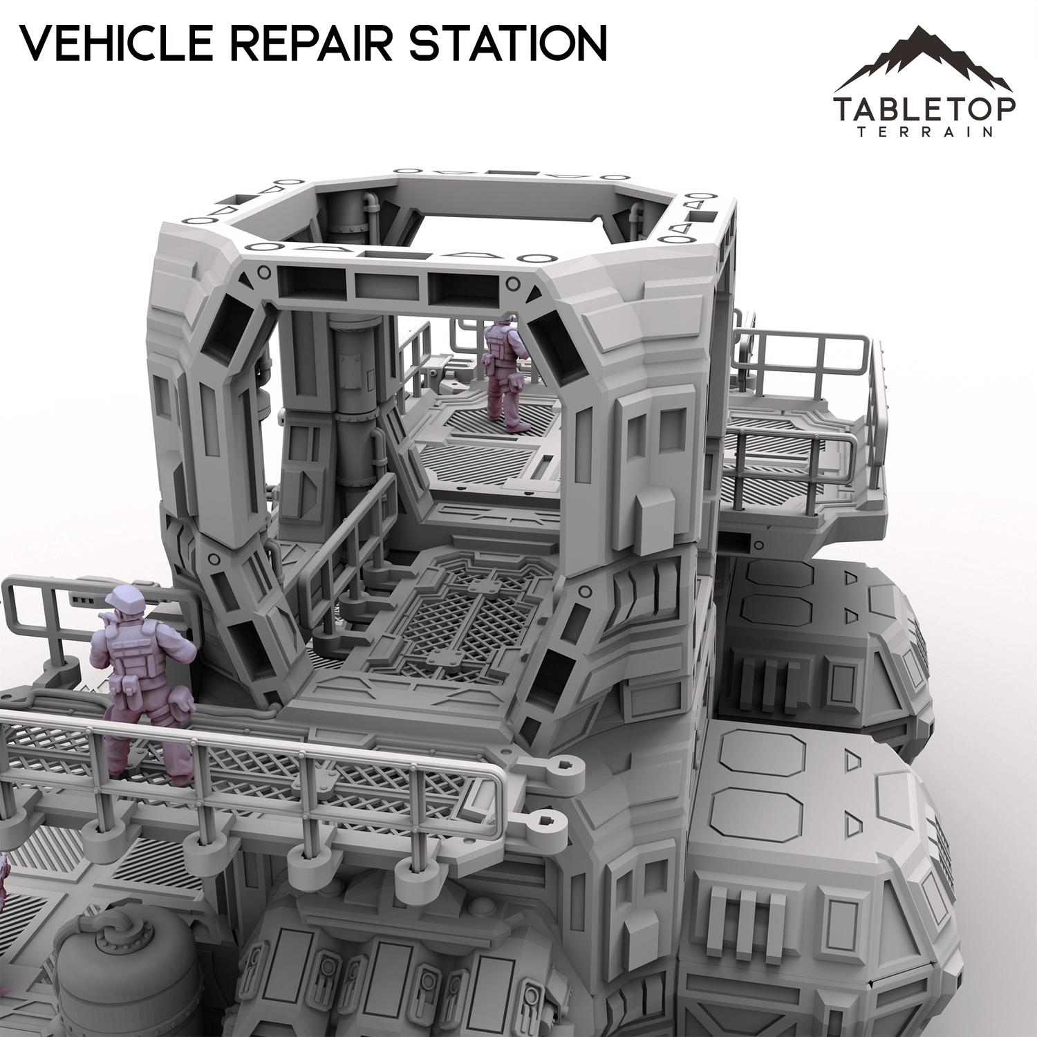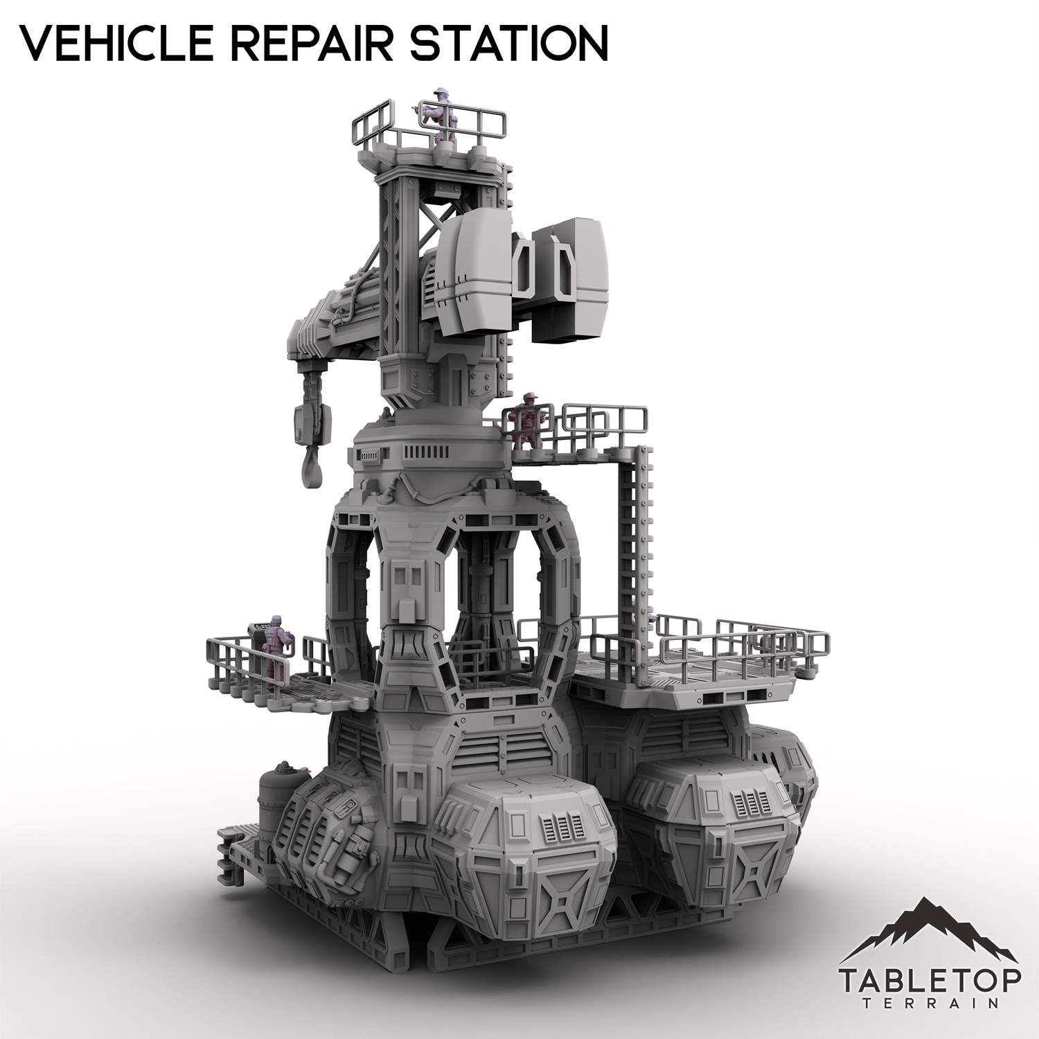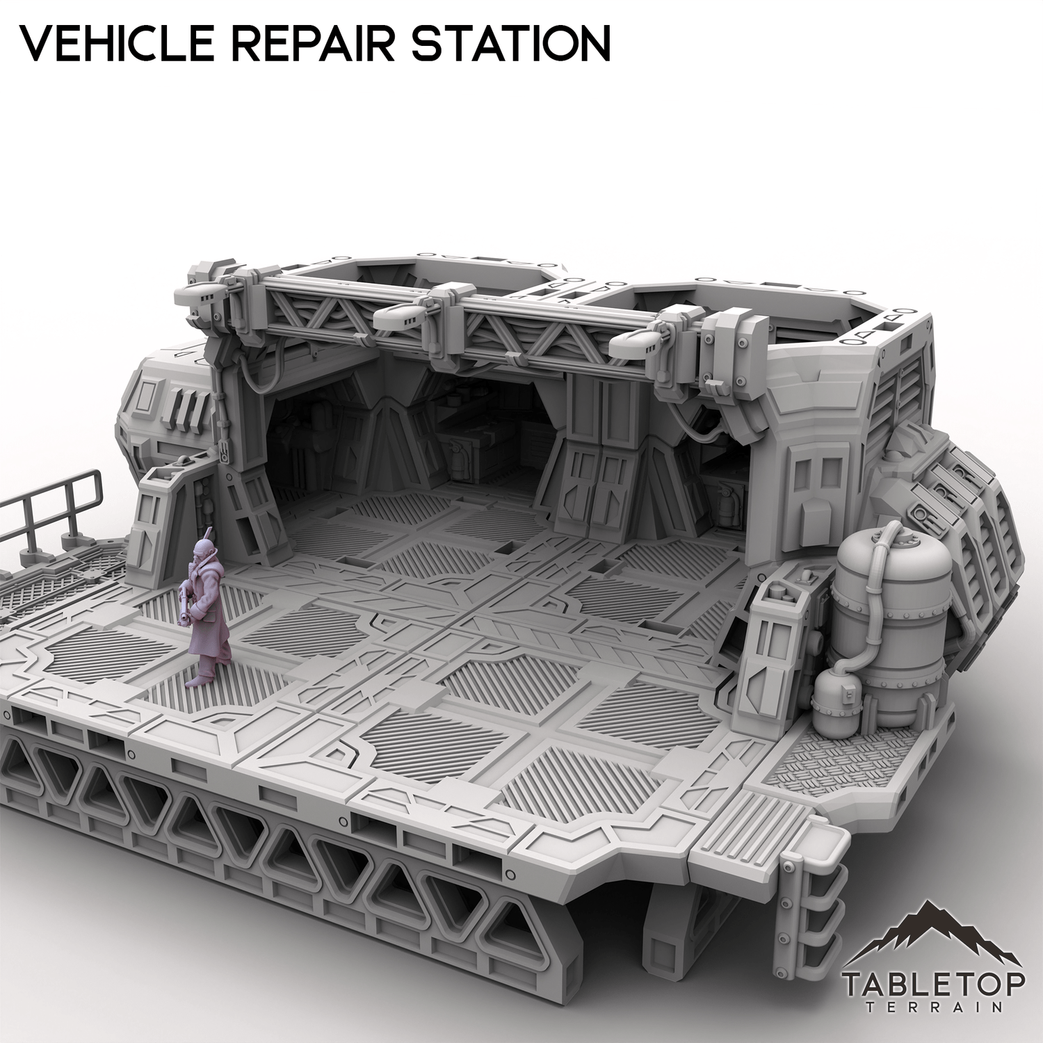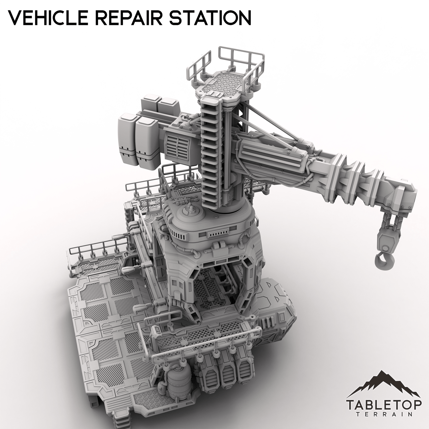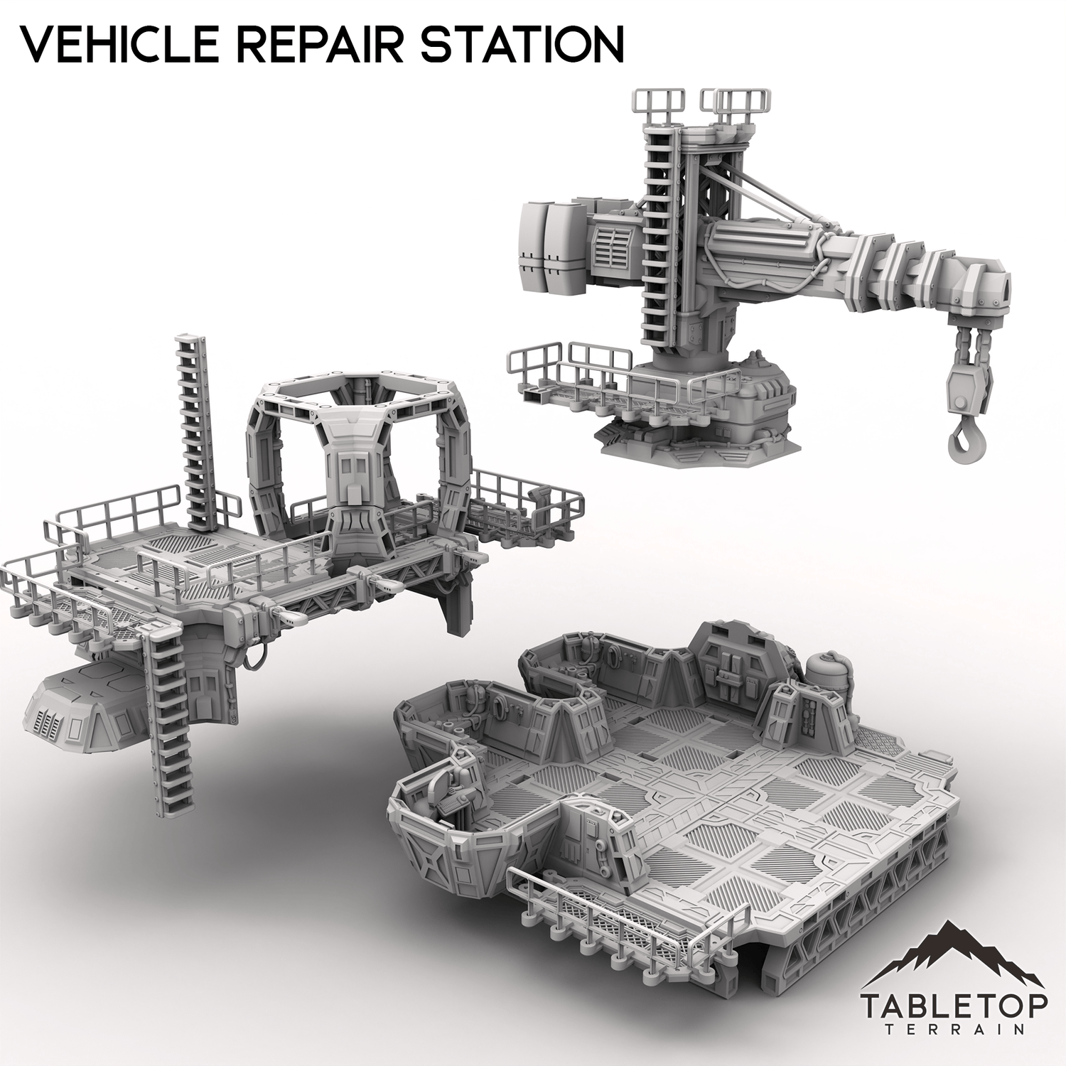 Behold, the Vehicle Repair Station! Standing a foot tall, this complex structure is ready for repairing, building, and modifying whatever vehicles or mechs you need. The entire set is modular, allowing you to adjust the layout to whatever suits your needs. Each room has removable lids, and the boom for the crane can turn a full 360 degrees.