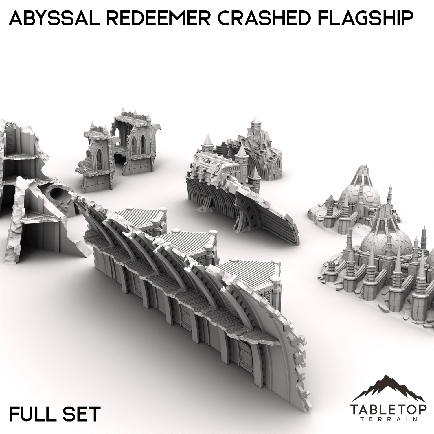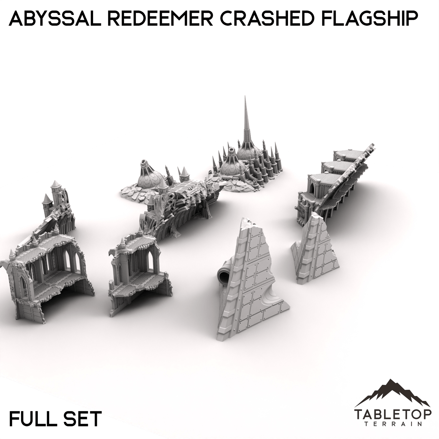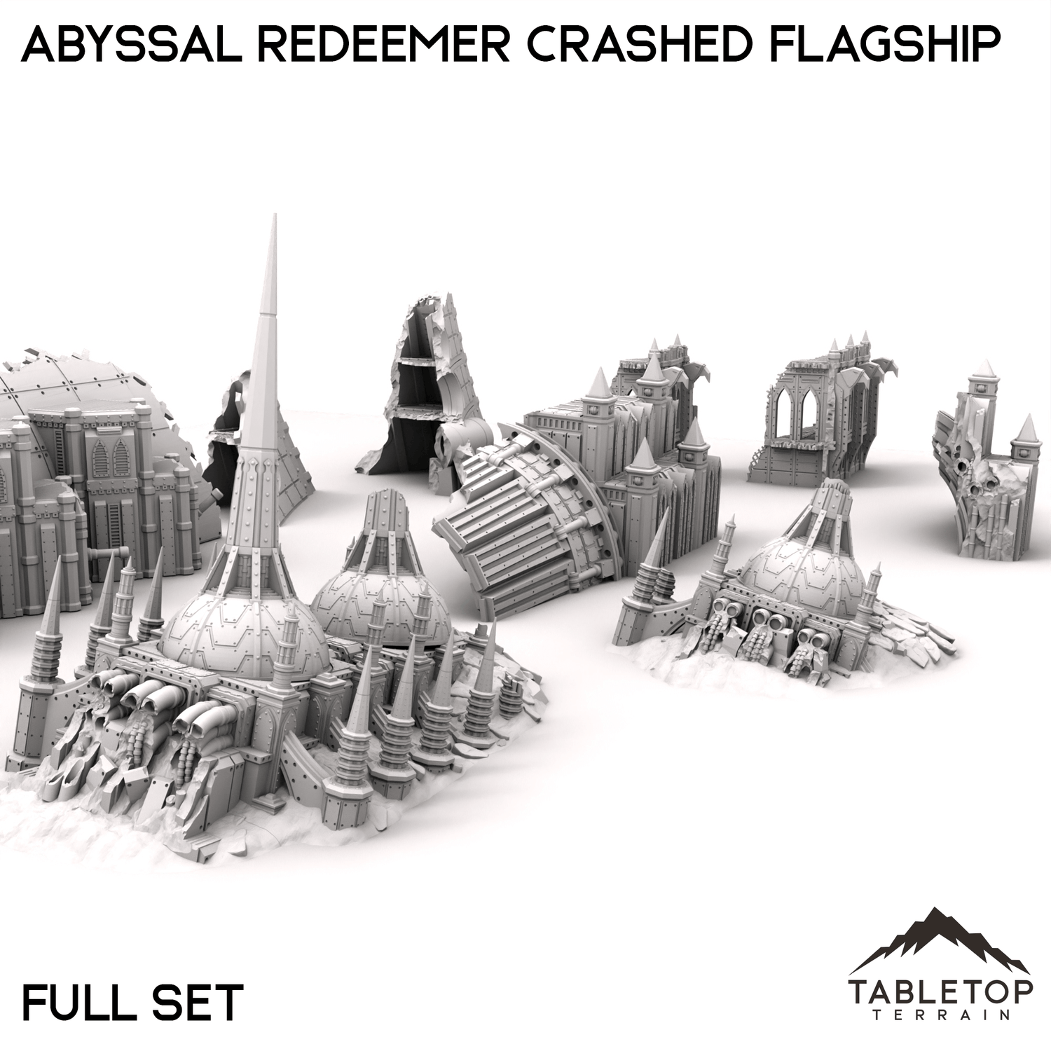Discover the ruins of the Abyssal Redeemer, a massive spaceship that now lies shattered across the landscape. Its once-mighty hull, now broken and resting in pieces, tells the story of a catastrophic descent. Ideal for exploration missions, scavenging expeditions, or uncovering ancient secrets, the Abyssal Redeemer Crashed Flagship provides a dramatic and intriguing setting for your sci-fi tabletop adventures.