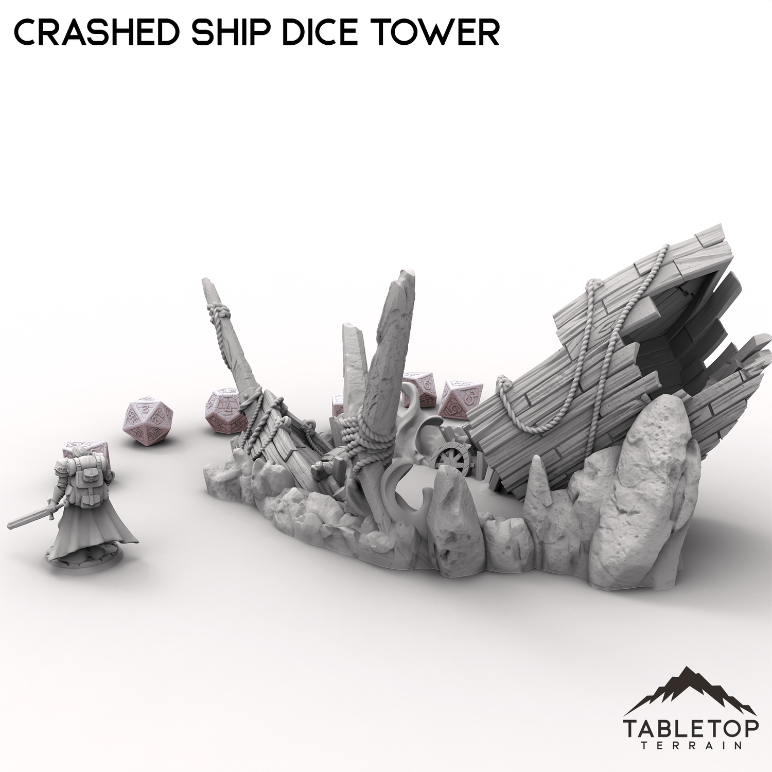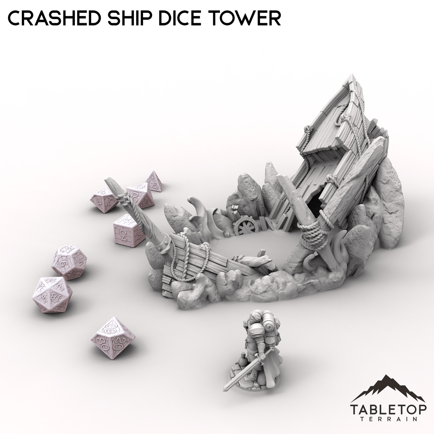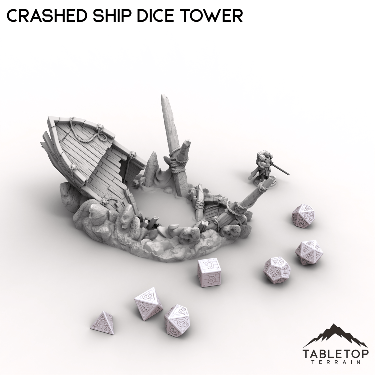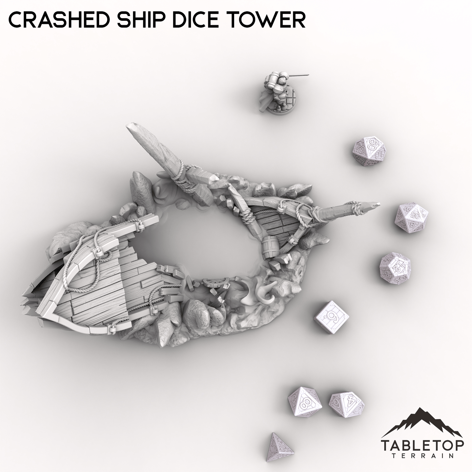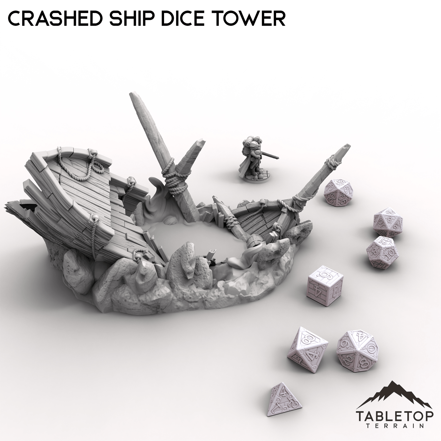 This Crashed Ship Dice Tower brings the chaos of a wrecked vessel to your tabletop. Dice roll through the broken hull, navigating splintered planks and jagged rocks before landing in the wreckage below.