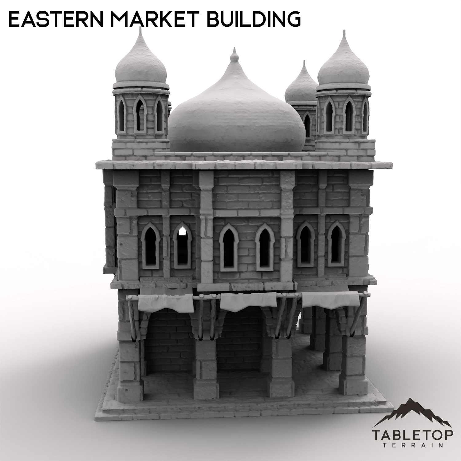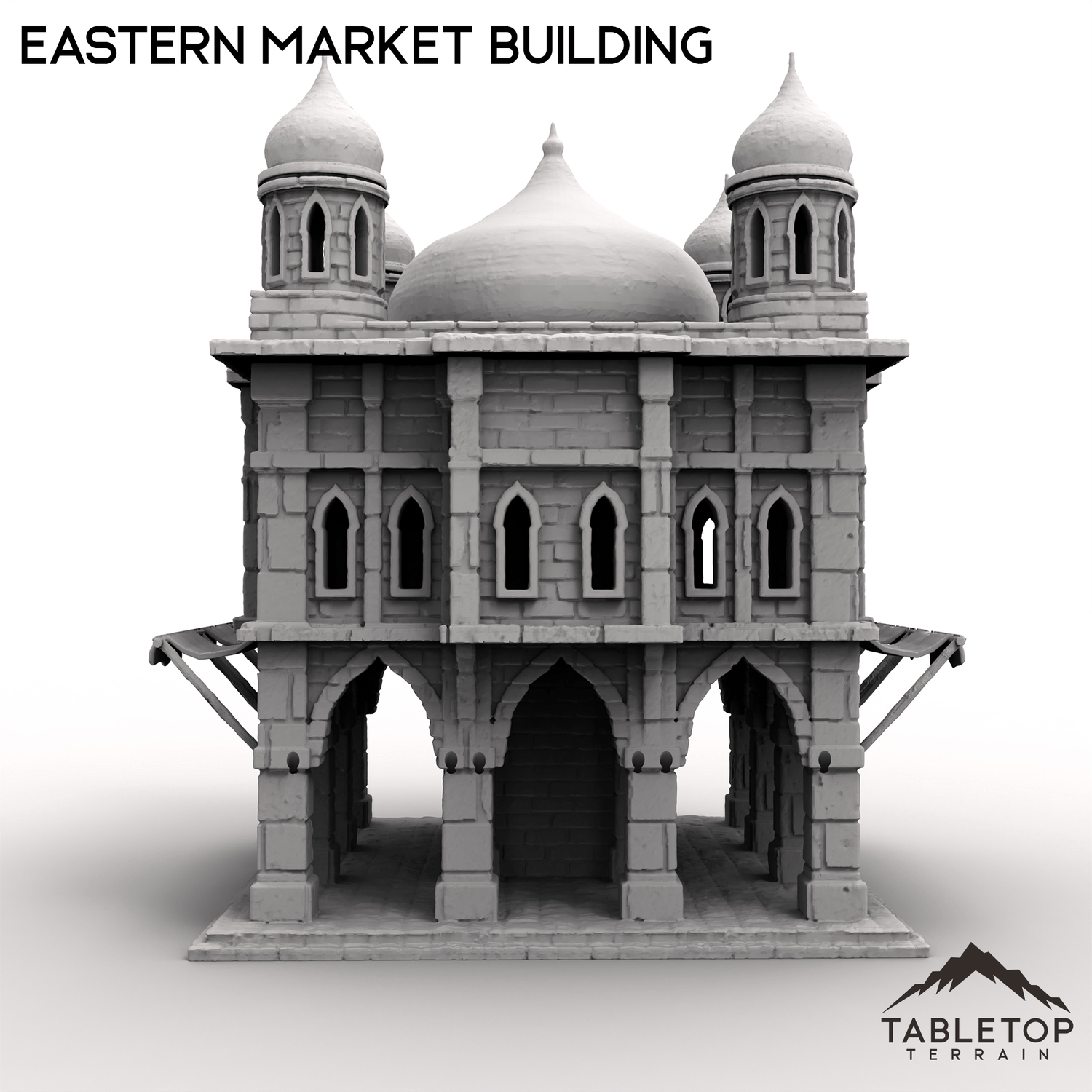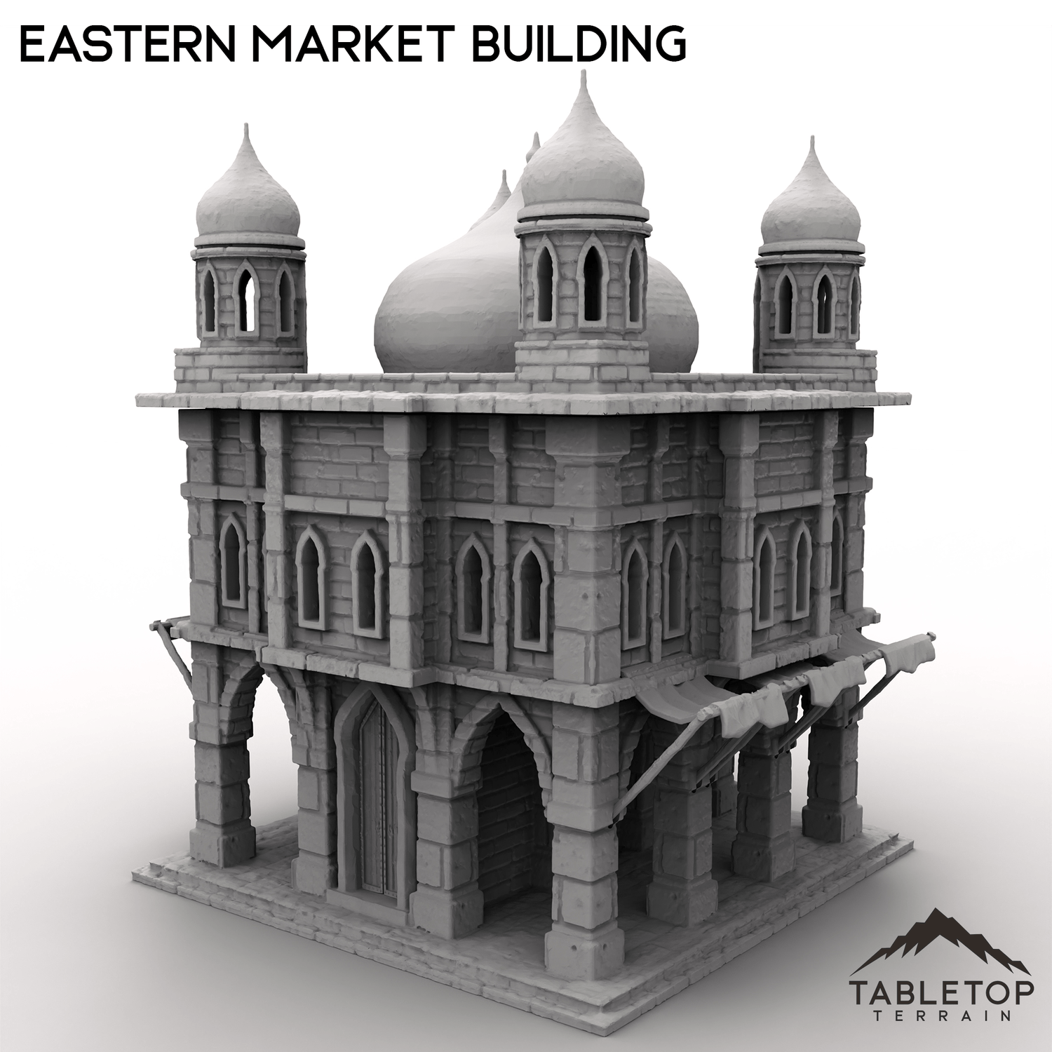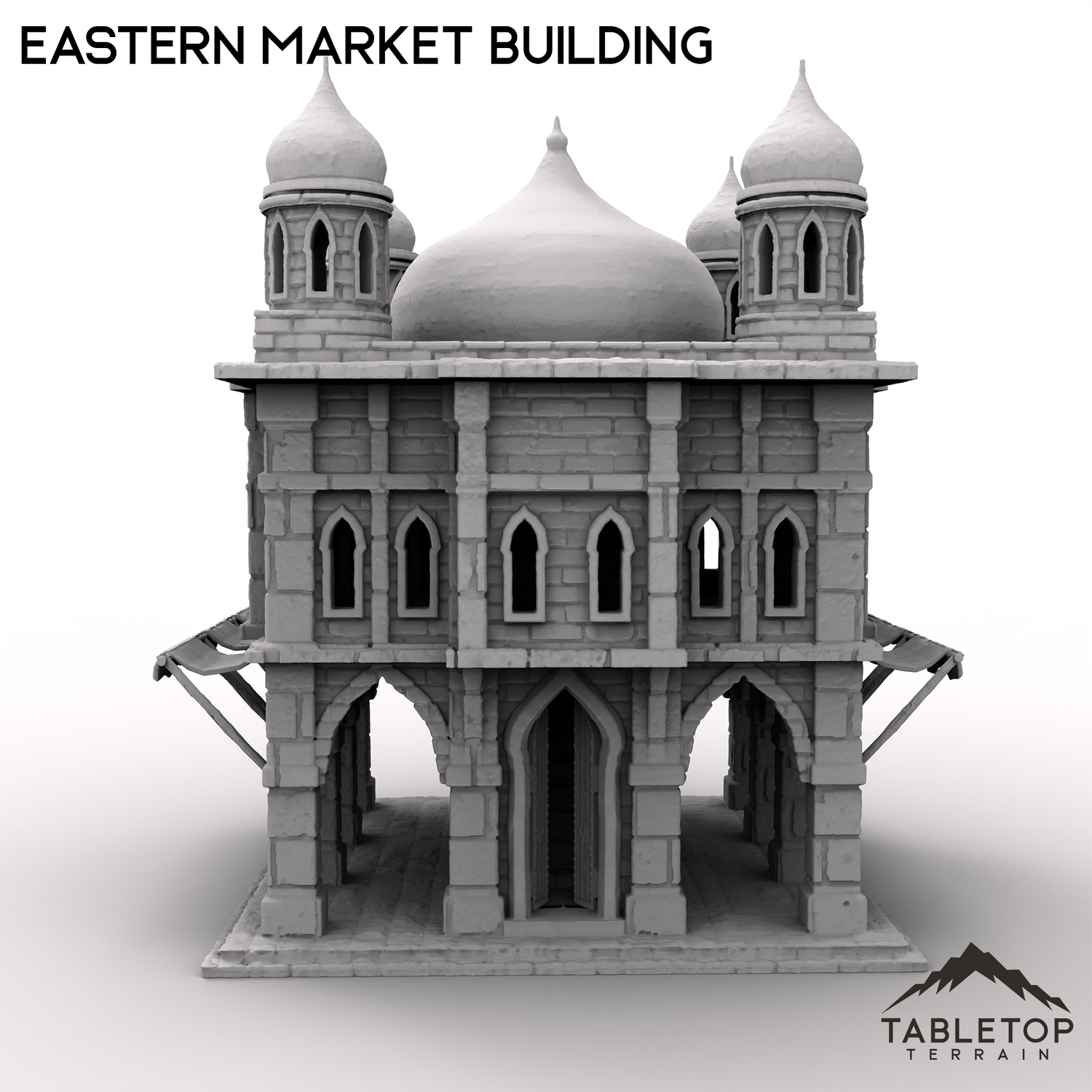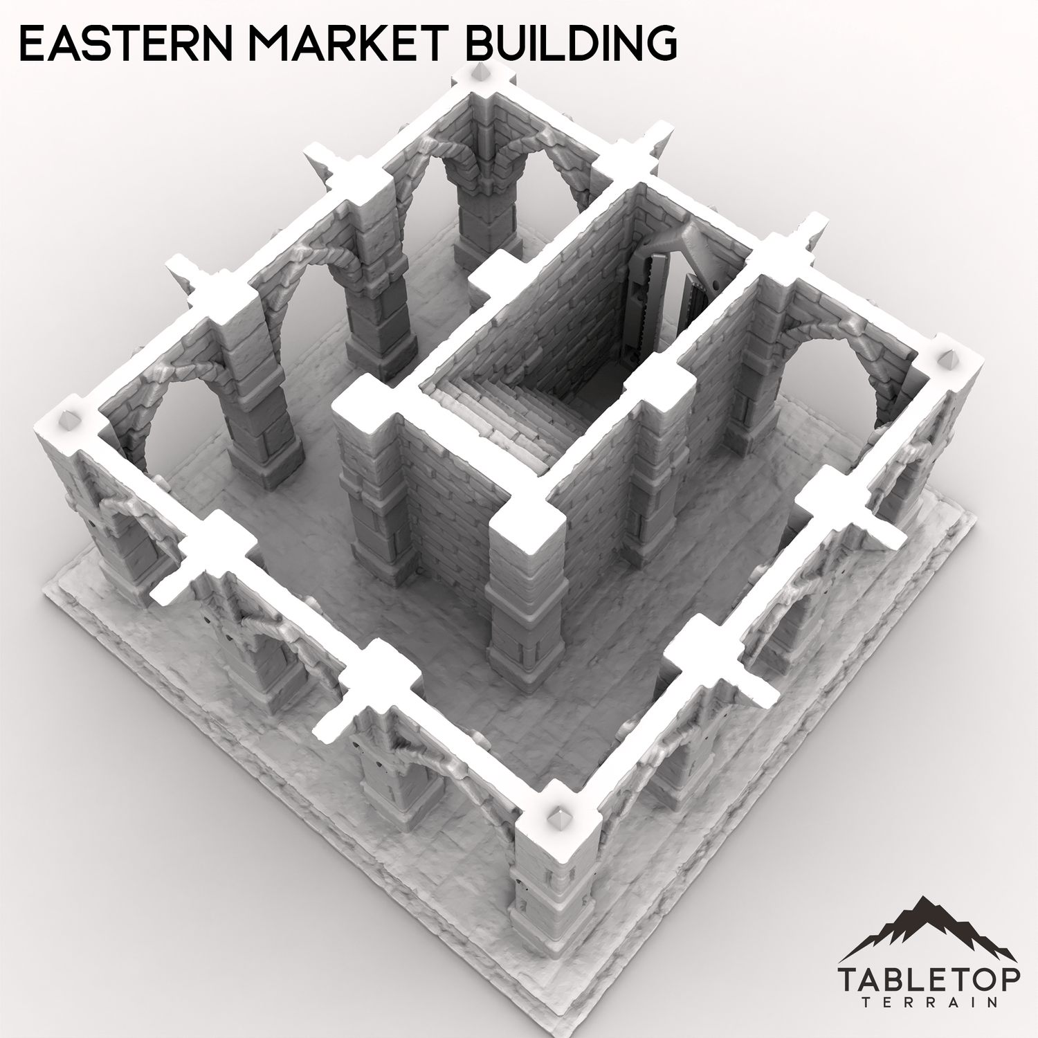 This ornate Eastern Market Building is a 2-story marketplace, with a removable roof and 2nd floor. There is a staircase wrapping around the center of the building, allowing minis plenty of room inside along with function doors for the front entrance.