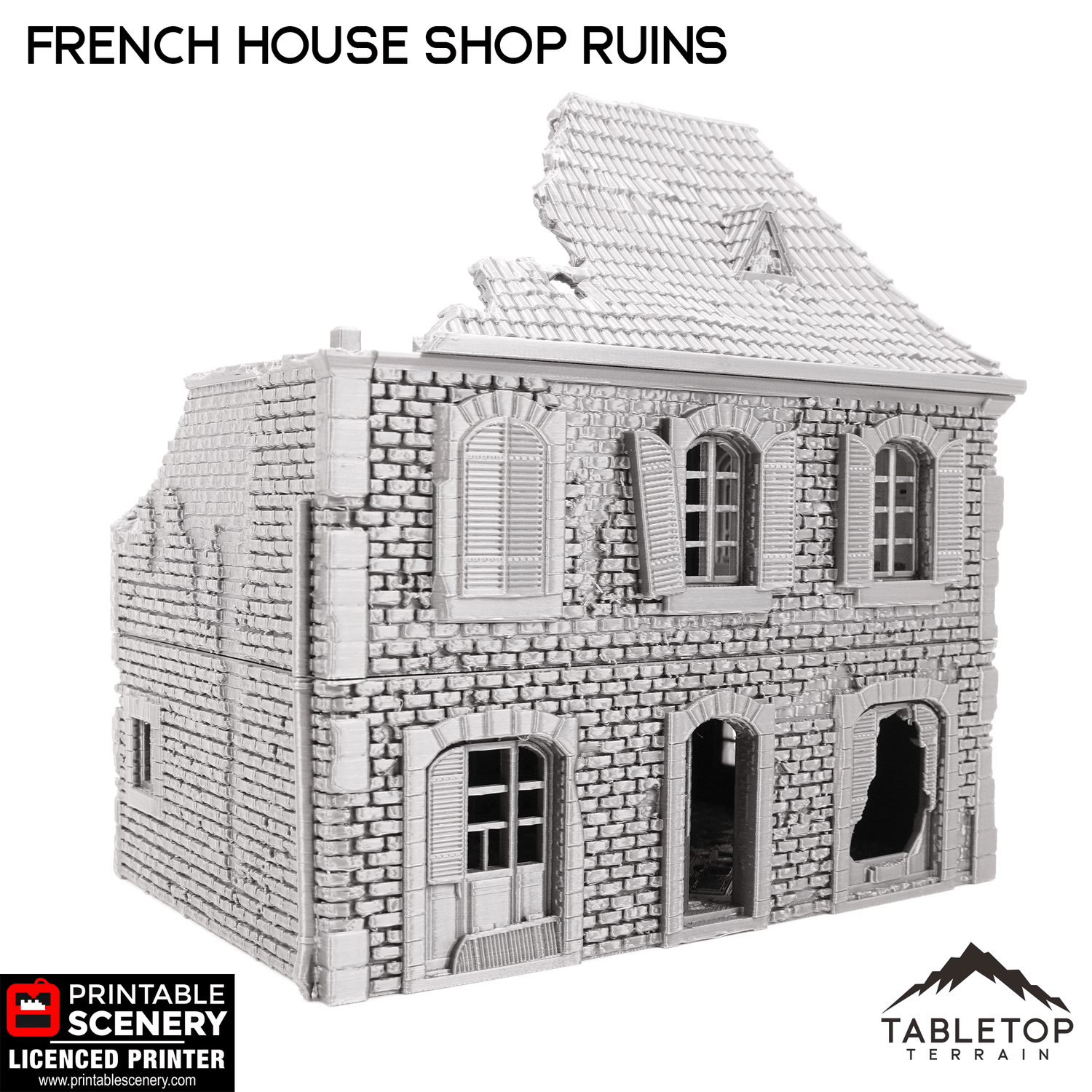 The French House Shop Ruins is a building for tabletop wargames. Perfect for WWII tabletop wargames such as Bolt Action, Flames of War, or Fields of Glory. It is available to be 3d printed in either 15mm, 20mm, 28mm or 32mm scale in .2mm high quality resolution. Tabletop Terrain prints all of Printable Scenery's items with their own recommended quality and resolution items.