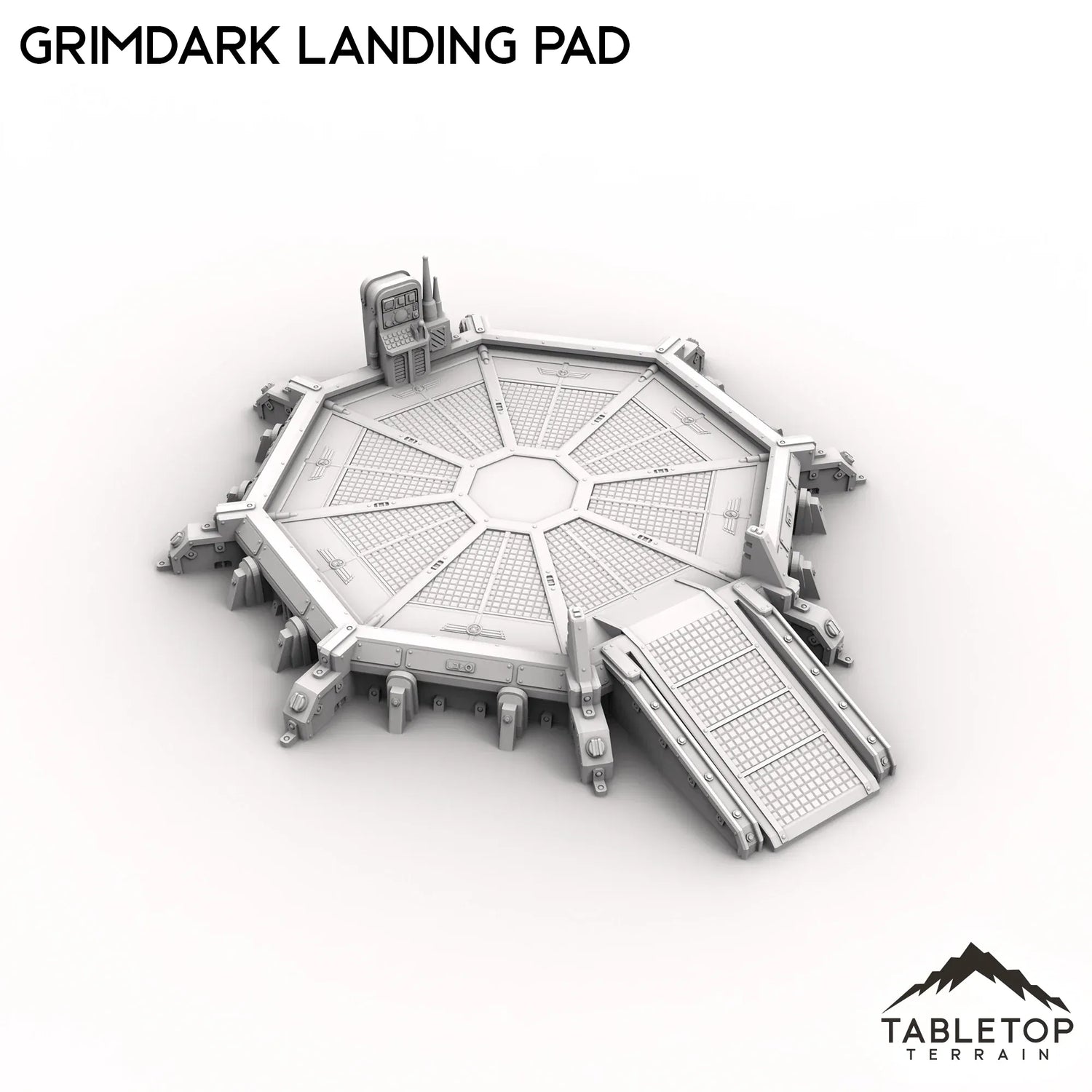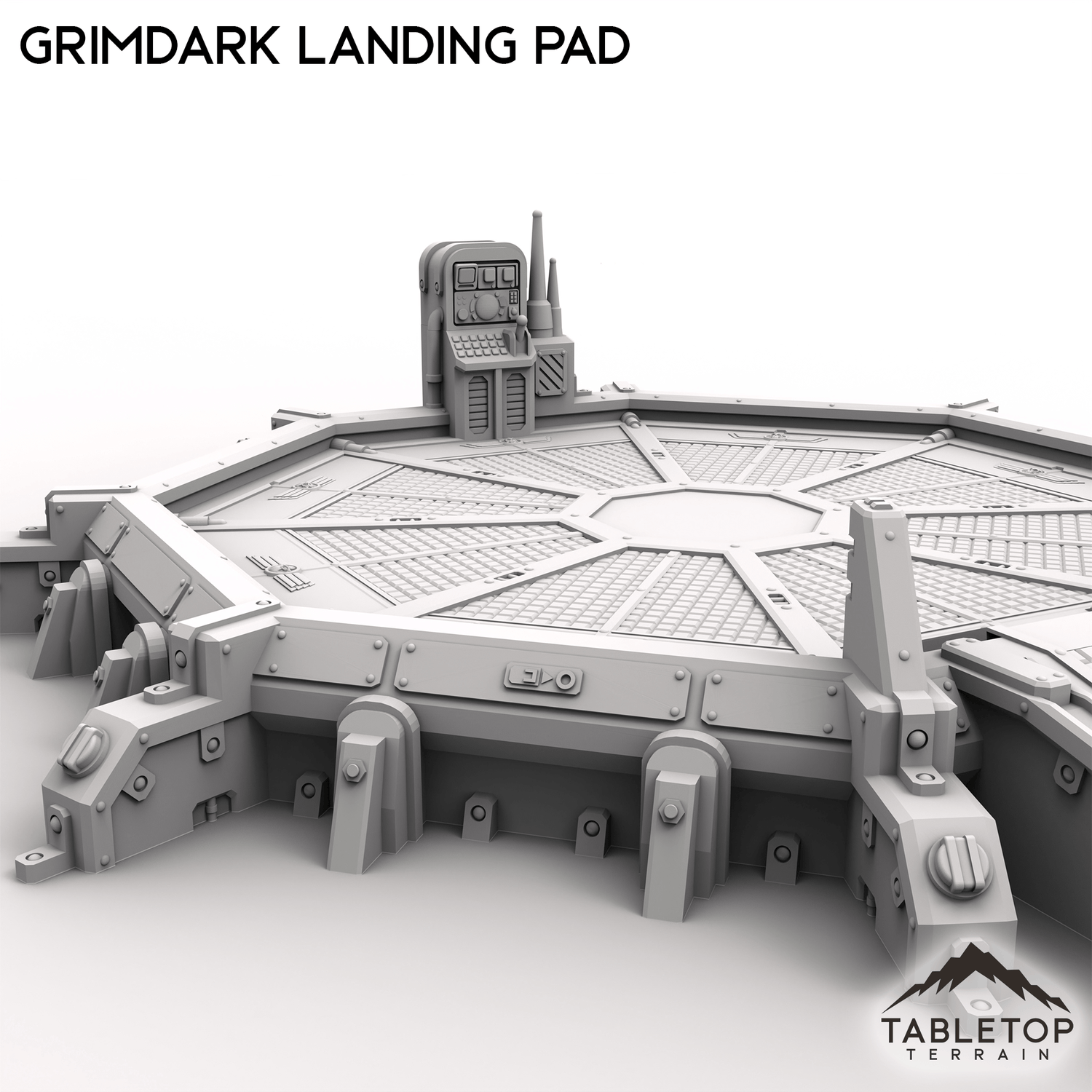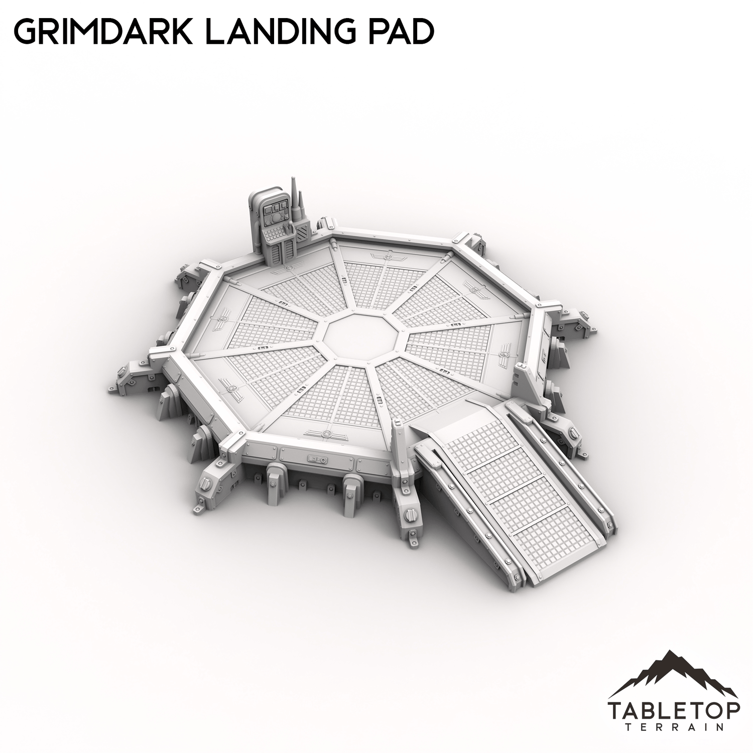 The Grimdark Landing Pad is a landing pad with control station and ramp for infantry to climb up. If you are looking for a larger version, check out the Grimdark Landing Platform.