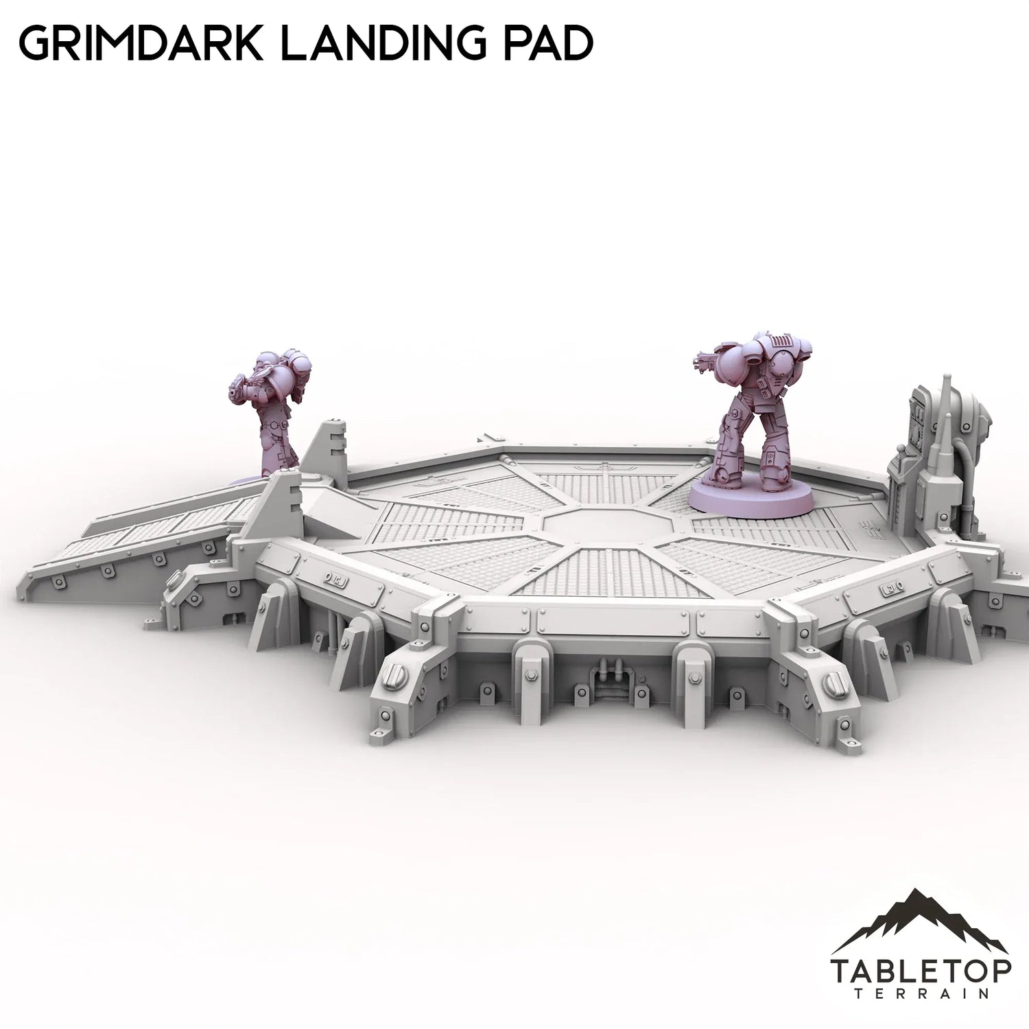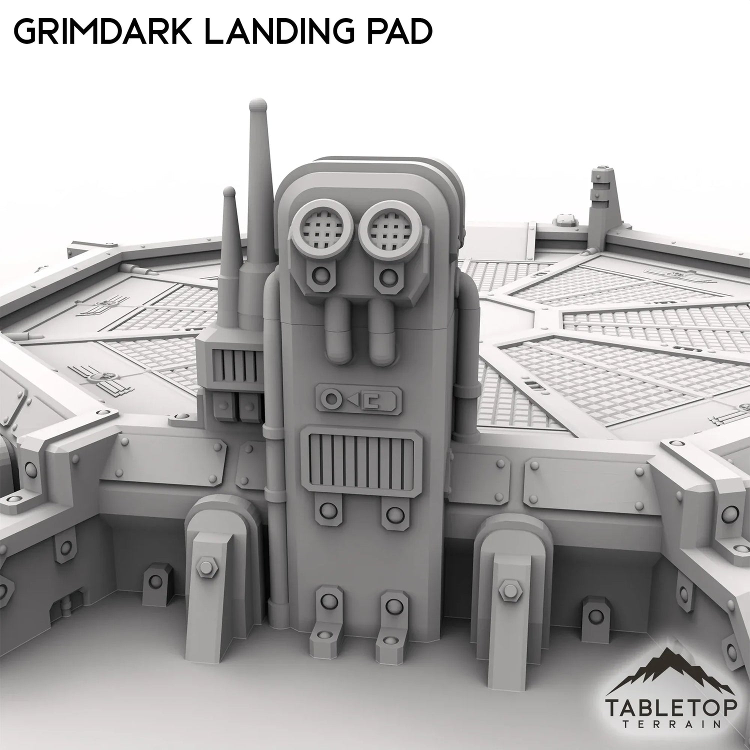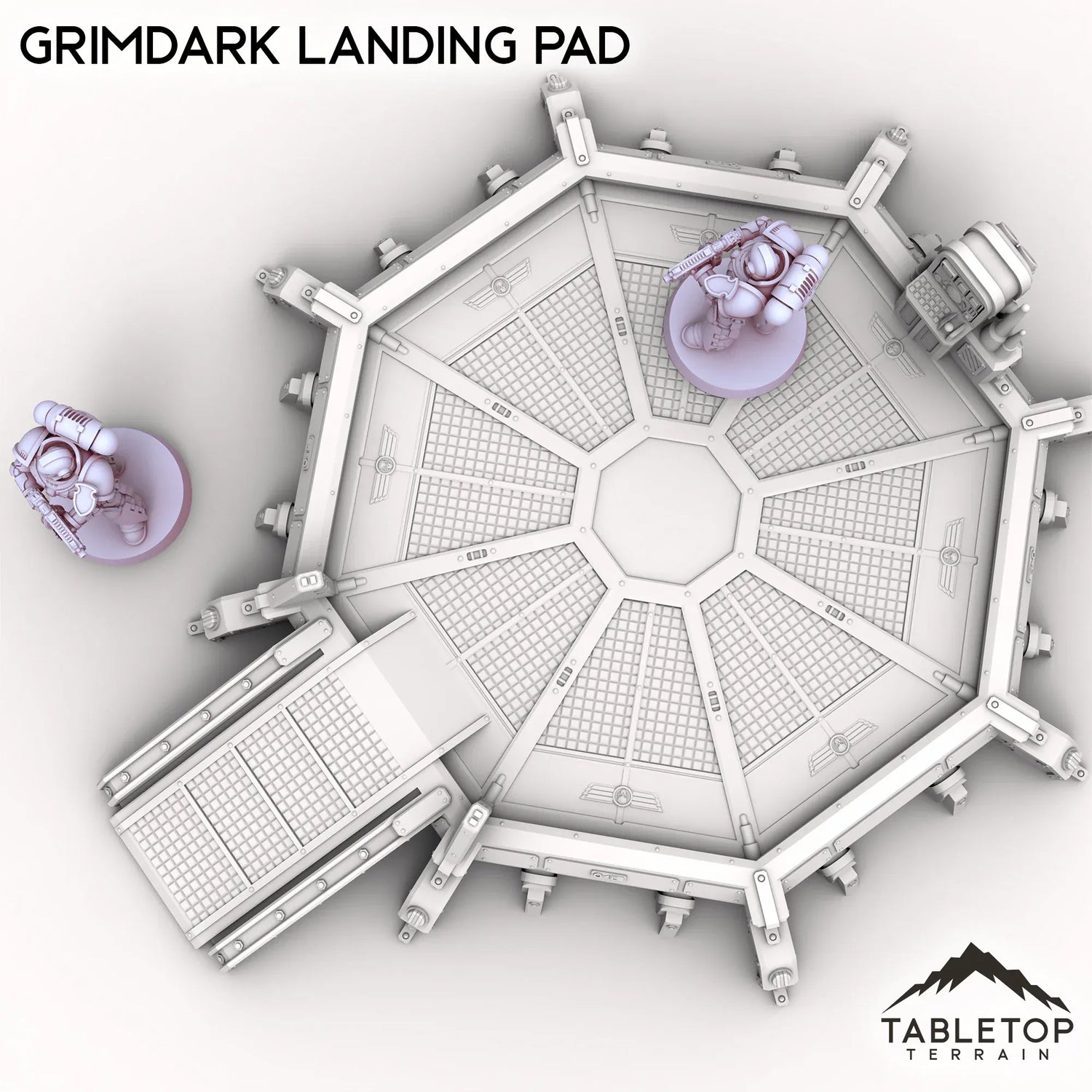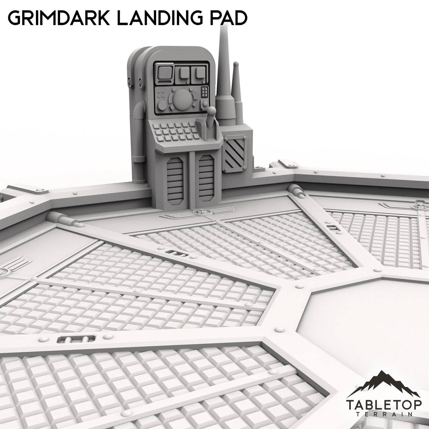 The Grimdark Landing Pad is a landing pad with control station and ramp for infantry to climb up. If you are looking for a larger version, check out the Grimdark Landing Platform.