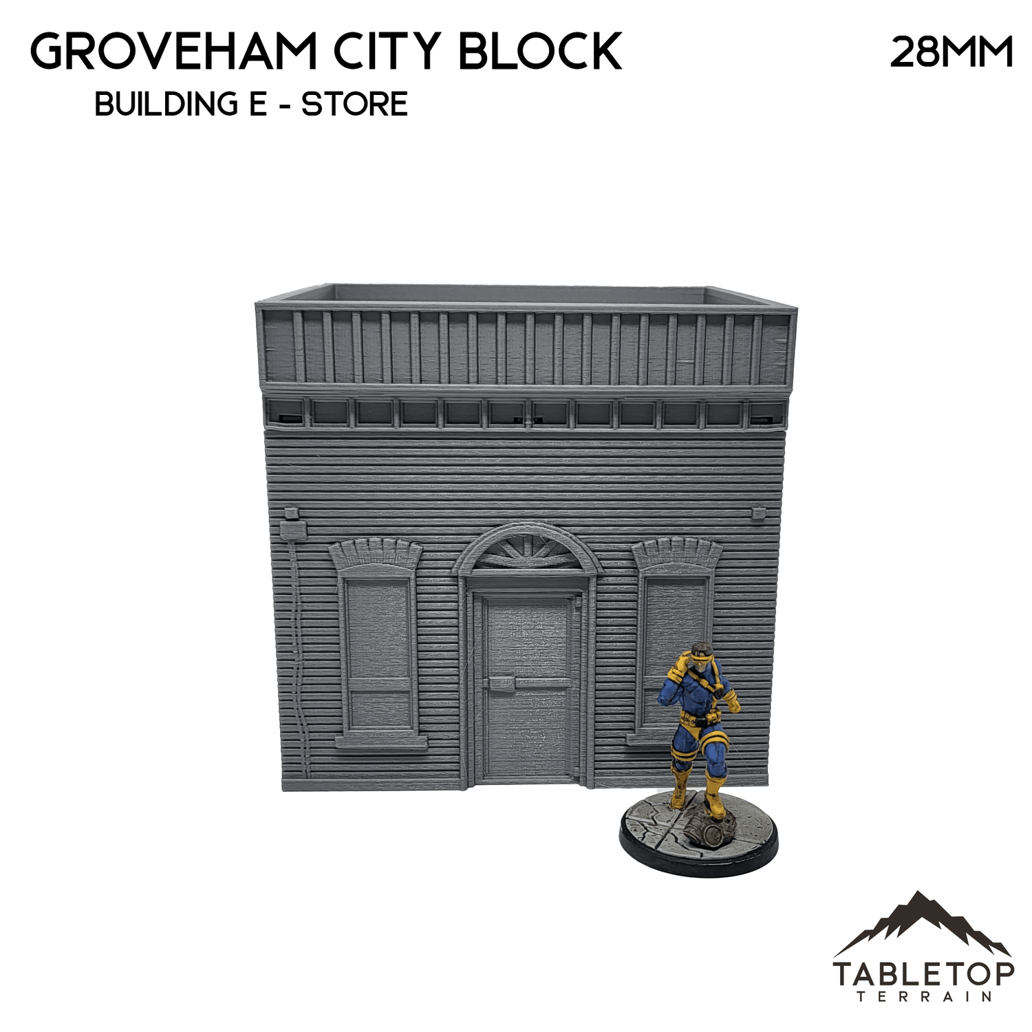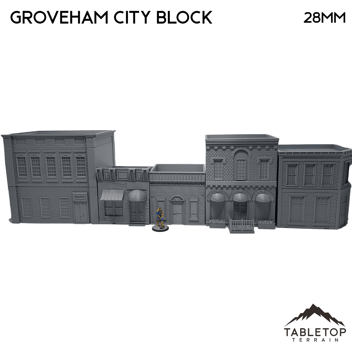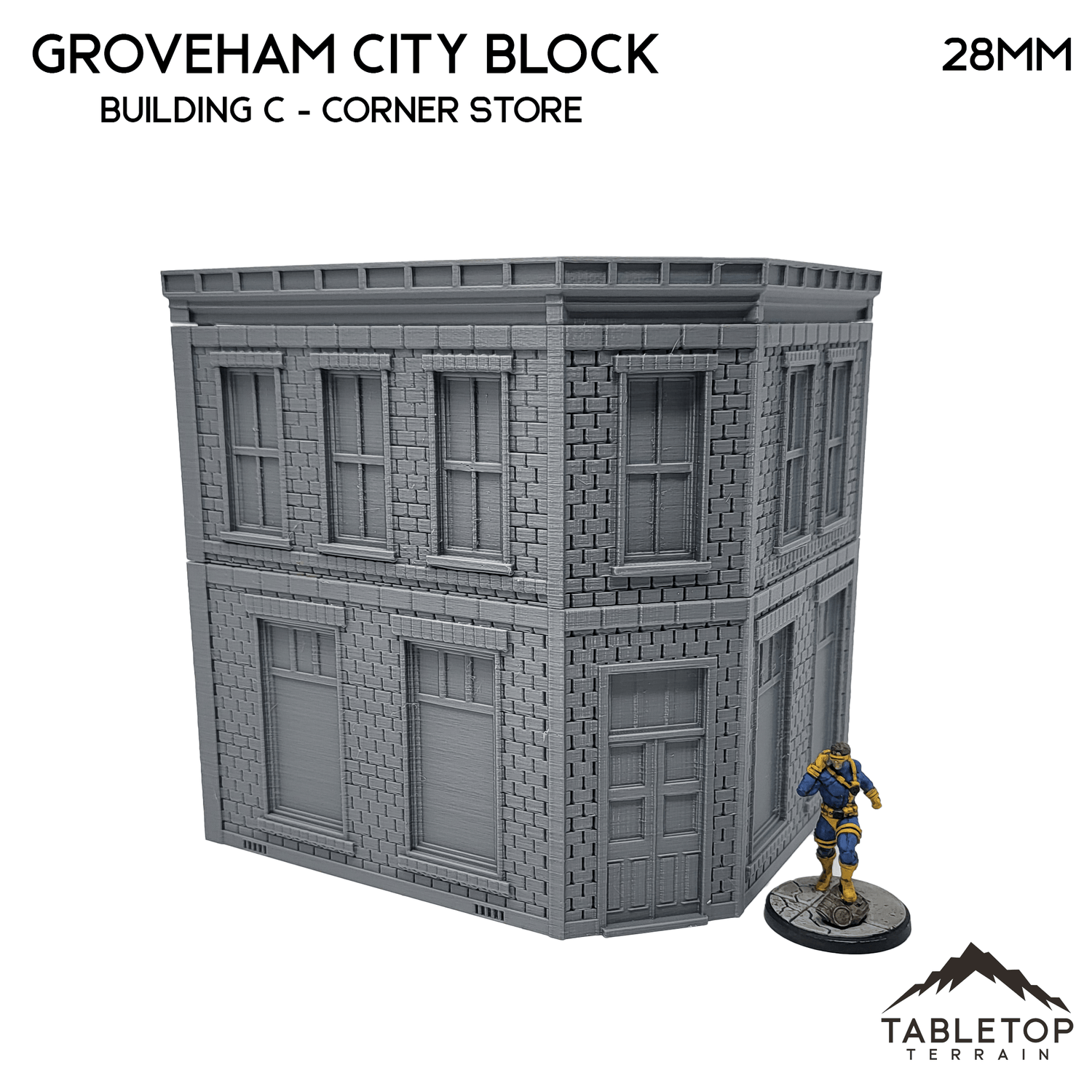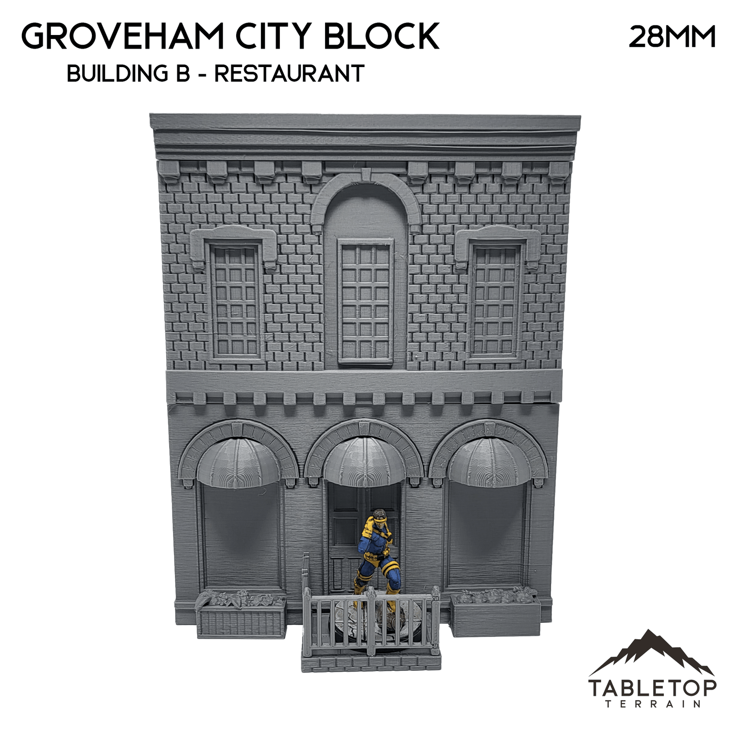 The Groveham City Block is a collection of 5 buildings that create a town environment for urban hero tabletop games. The full set includes two stores, a restaurant, bank, and corner store. This set is part of our urban collection, and goes nicely with any buildings or scatter from said collection.
