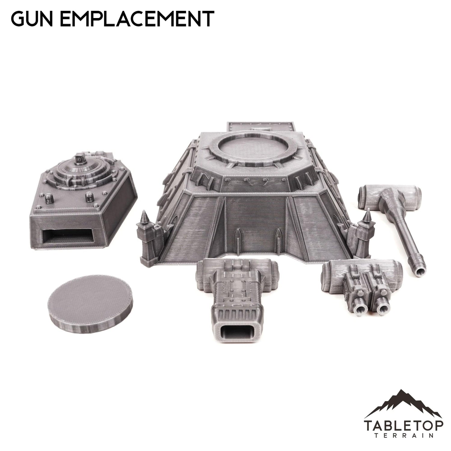 The Gun Emplacement is a large individual artillery that comes with 3 different barrels for different types of ordinance. The gun itself can swivel left and right, set into a disc used for helping keep the model stable. The Gun Emplacement set is designed for sci-fi wargames, but can be used with any system.
