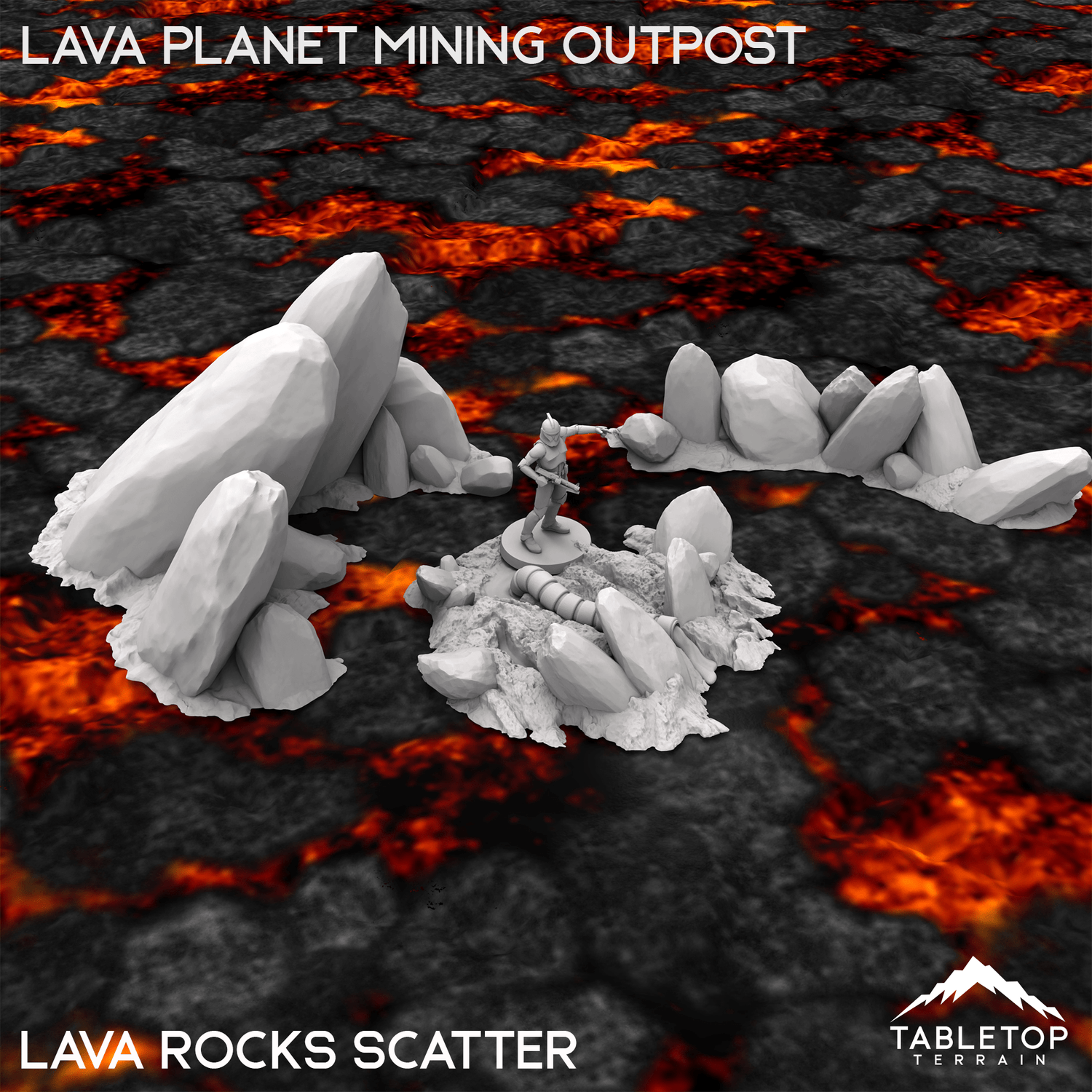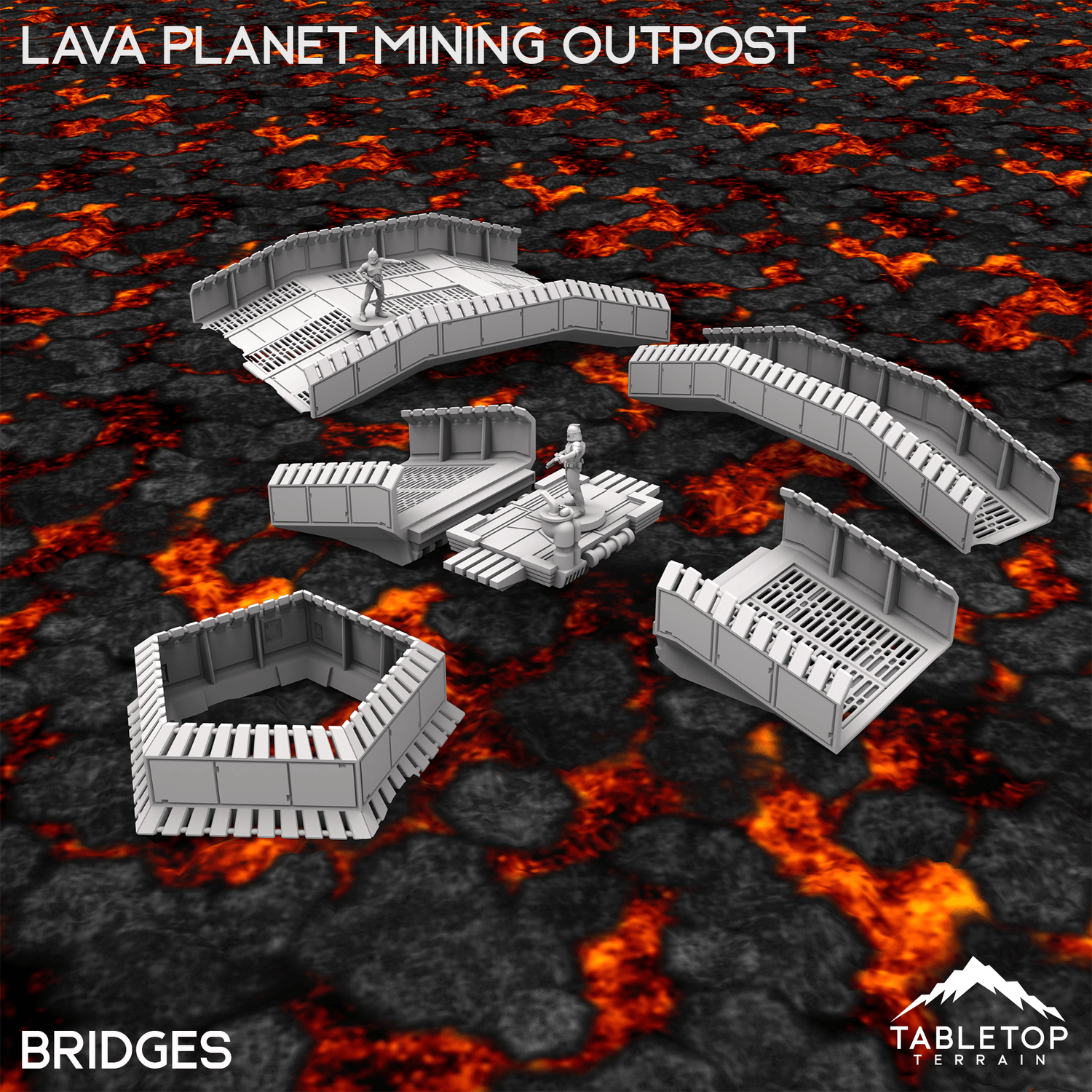 This massive, sprawling set is one of the largest collections of Sci-Fi terrain we sell at Tabletop Terrain! The Lava Planet Mining Outpost consists of platforms, a huge control room, bridges, and scatter rocks. The Lava Outpost Control Room is a fortified structure perched above flowing rivers of molten rock, its reinforced walls scorched and cracked from the heat below. The Bridges feature a central platform and modular bridges designed to span across molten rivers, including grated floors and docking points for mining machinery. Thematic scatter Lava Rocks rise out from the scorched earth, their surfaces still warm to the touch from a recent eruption. And the Maintenance Platforms rise in layers, connected by steep stairs and narrow walkways that lead to various control stations. Metal railings surround the platforms, offering minimal protection as workers move between flickering consoles and supply crates.