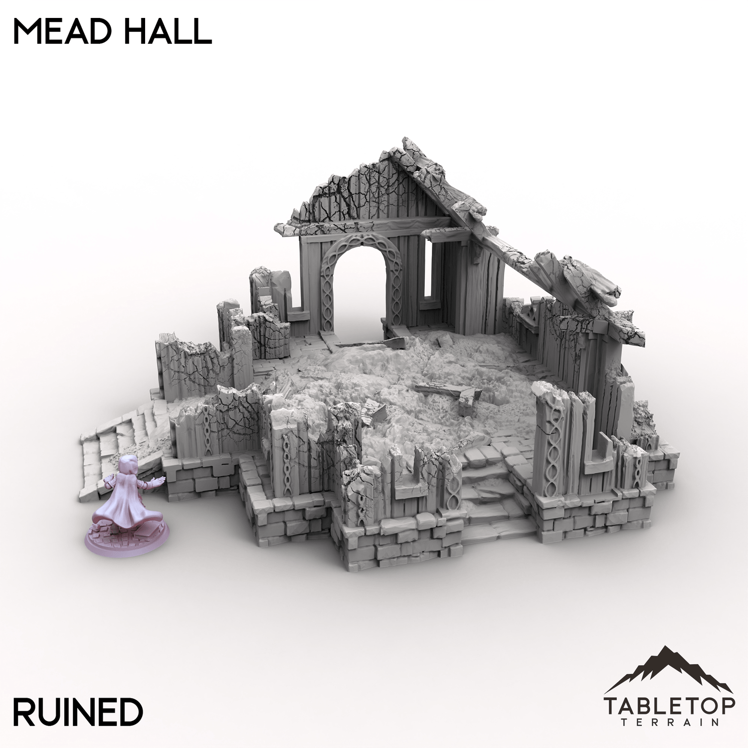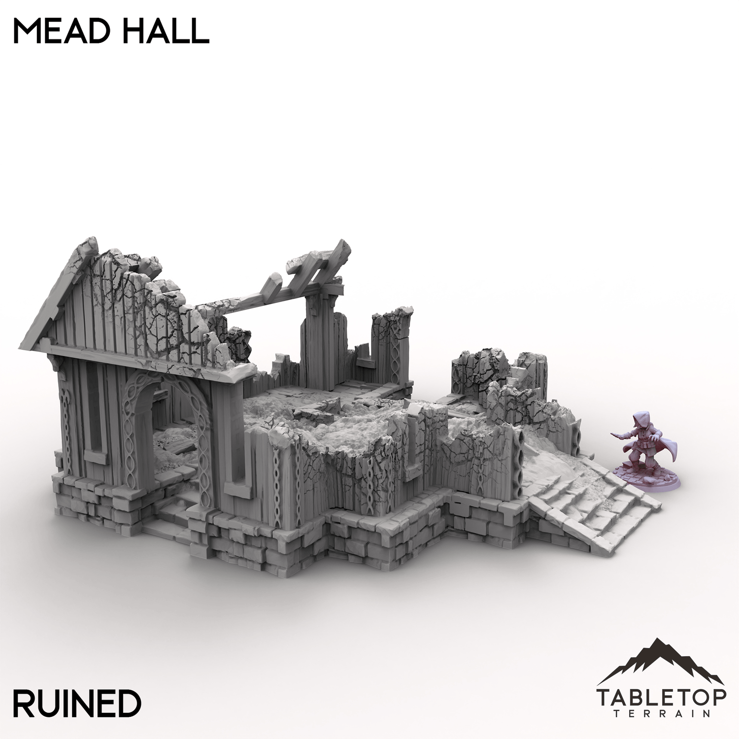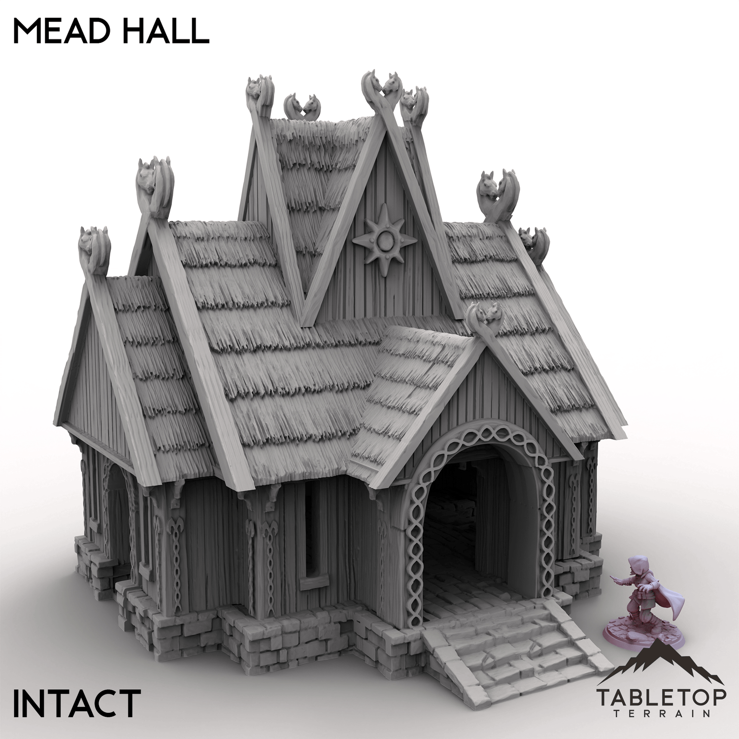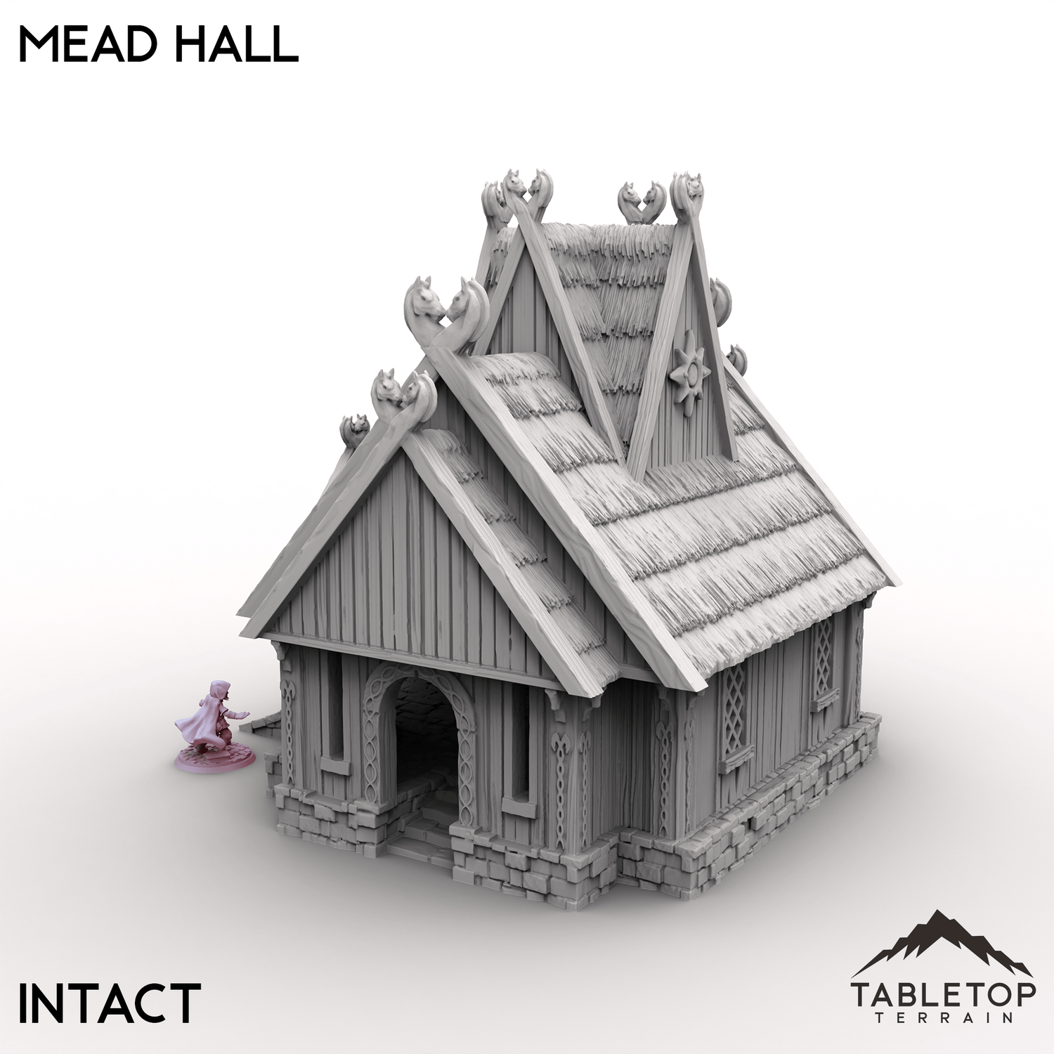 The Mead Hall is a building from the Kingdom of Saxonia collection that comes in either an Intact version, or a Ruined version. The building is 1 story tall, with detailed texturing both inside and out, with plenty of room to fit minis inside while in use. We recommend using this set with other buildings from the Kingdom of Saxonia set to mix and match a large town tabletop.