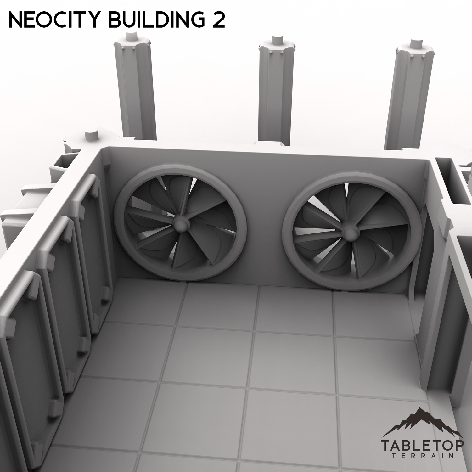 NeoCity Building 2 is a 2-story set, featuring a massive open grounds flood with industrial fans on one wall. The upper level has a small wrap-around balcony and a single room with windows and a ladder to the rooftop.