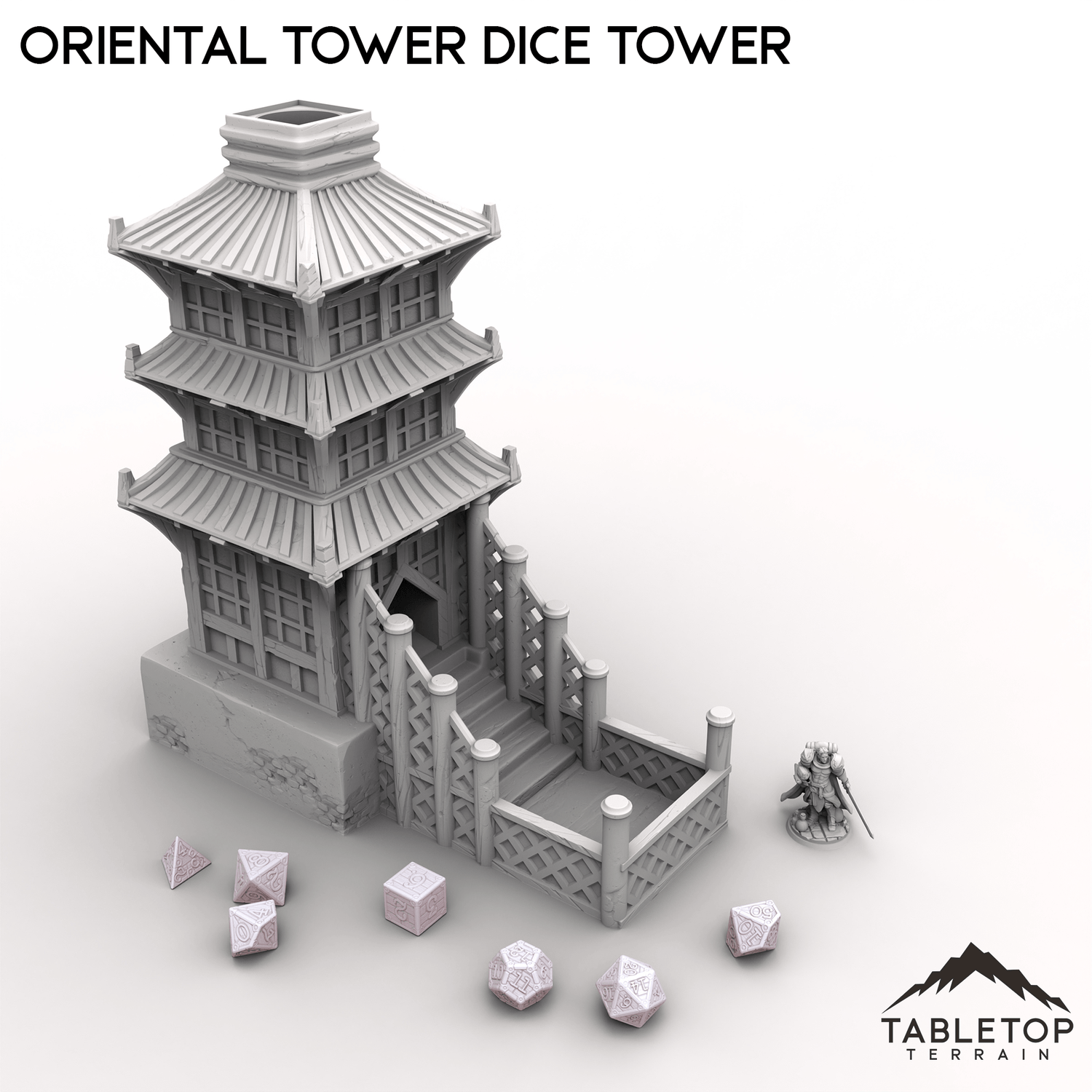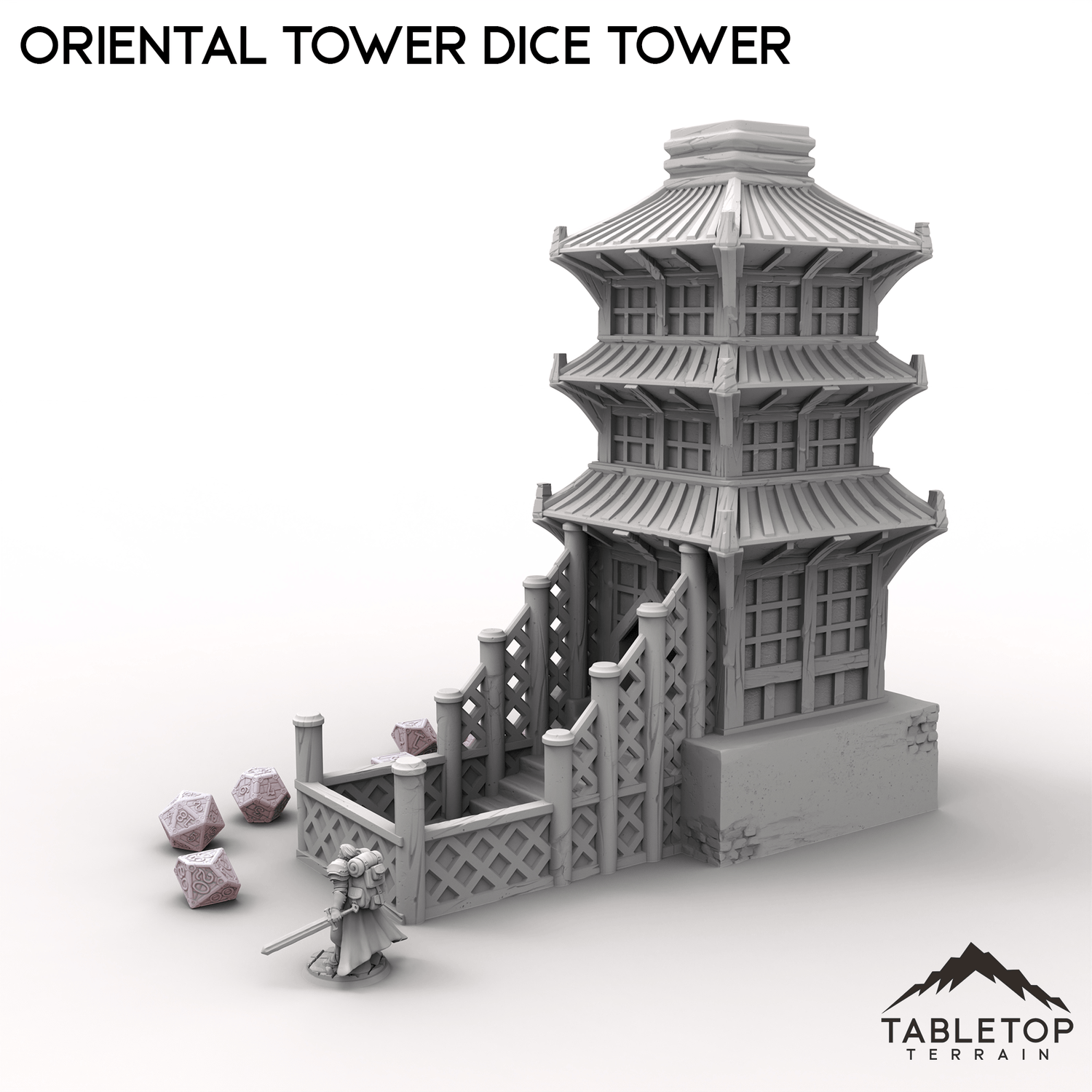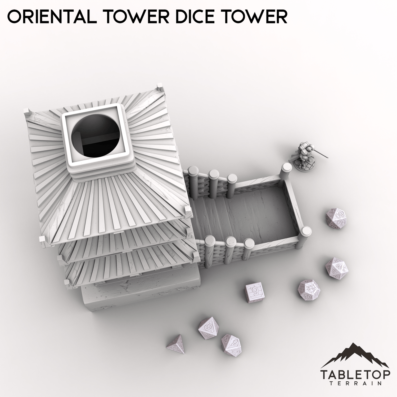 This Oriental Tower Dice Tower brings an elegant, ancient flair to your rolls. Drop the dice in from the top, and they tumble down through the tower before emerging at the base, rolling down the decorative stairs. A perfect blend of function and style for your tabletop adventures.