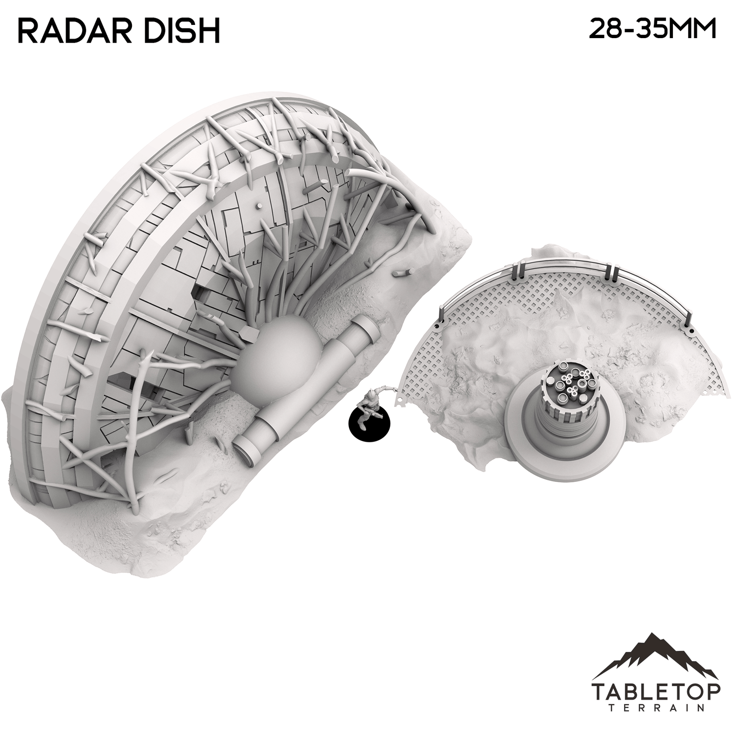 The half-buried radar dish from a capital ship makes for a decent hiding point for snipers and spotters. Two pieces from the ruined capital ship are included. It works well with the rest of the Distant Outpost set, or as a standalone piece. Great for wargames and RPGs.