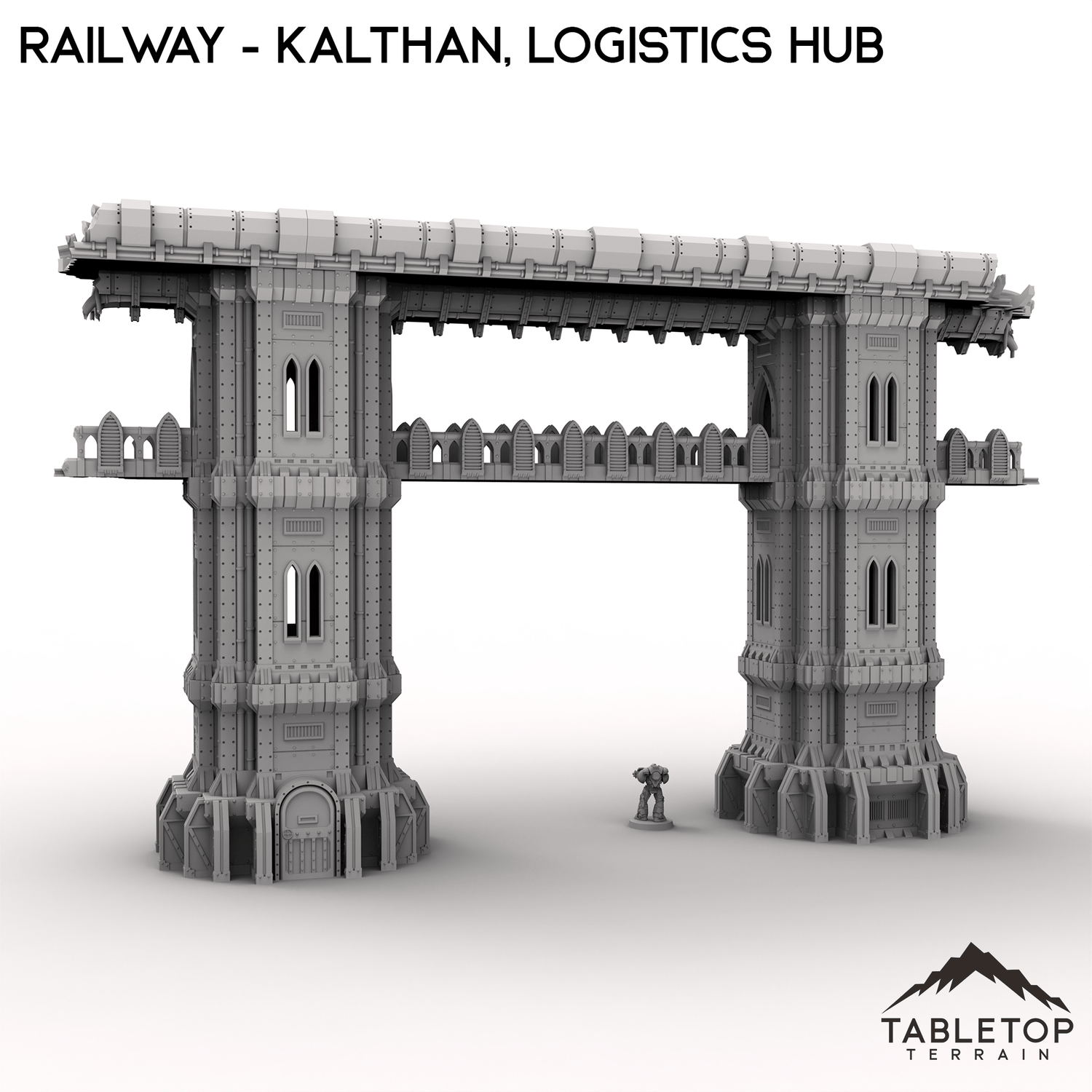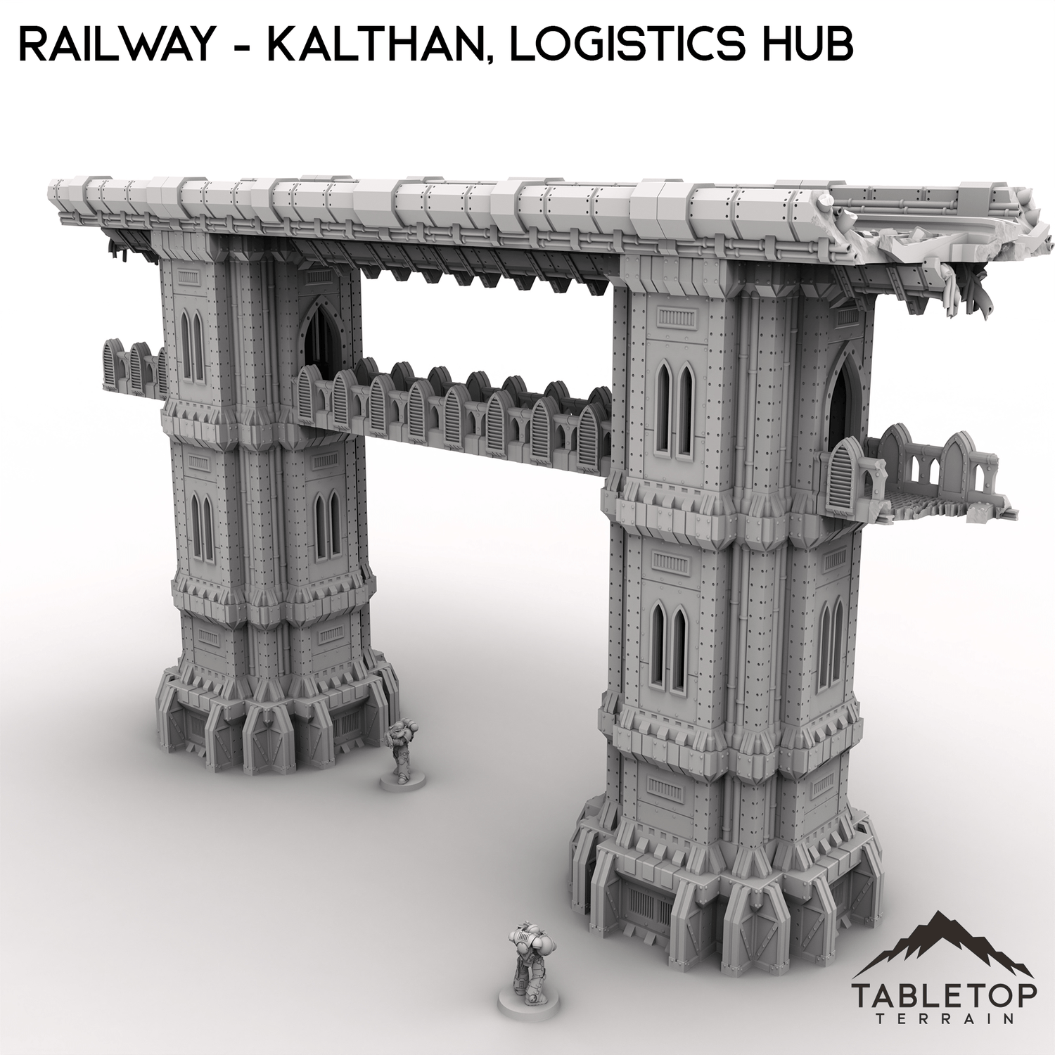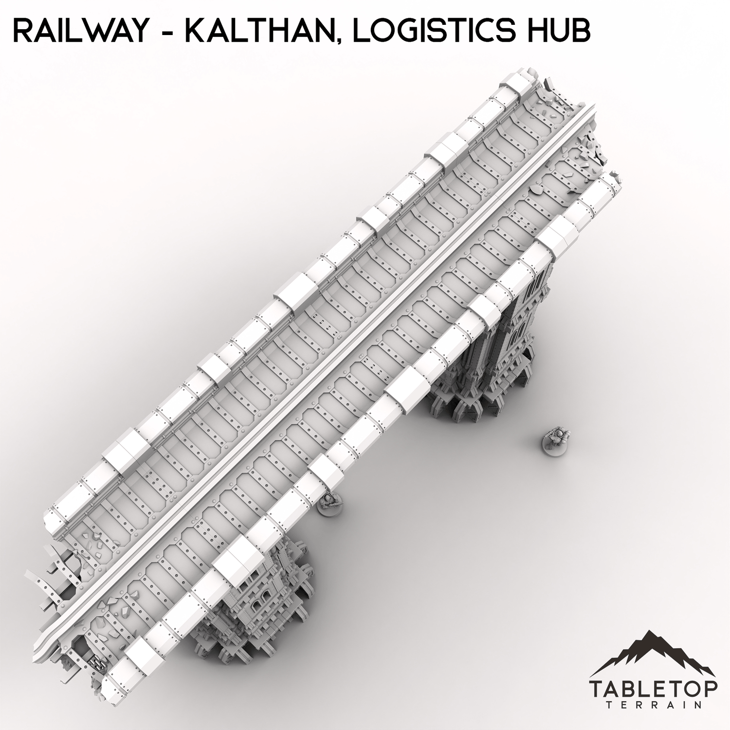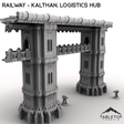 The section of Railway, part of the Kalthan Logistics Hub set, is damaged but still stands tall. It includes two intact railway pillars, connecting track and walkways. Perfect for tabletop games or dioramas centered around industrial or sci fi themes.