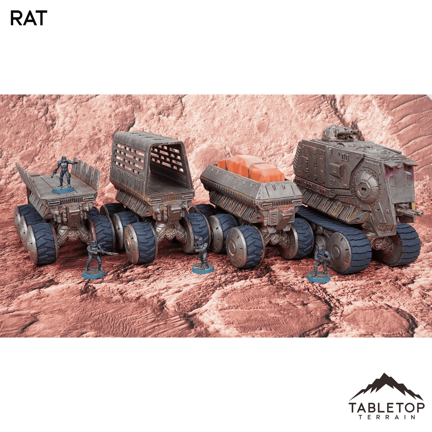 The Rapid Armored Transport (RAT) is ready to get your needed supplies to the front lines, but watch out for those wanting to steal everything you're carrying. The RAT is modular and can be assembled into a variety of configurations, and it's designed to meet the elevation rules of popular skirmish games. Each set comes with all the pieces to make the pictured cargo line.