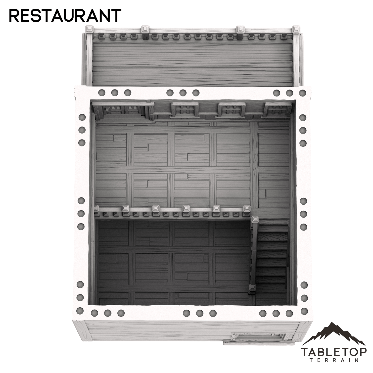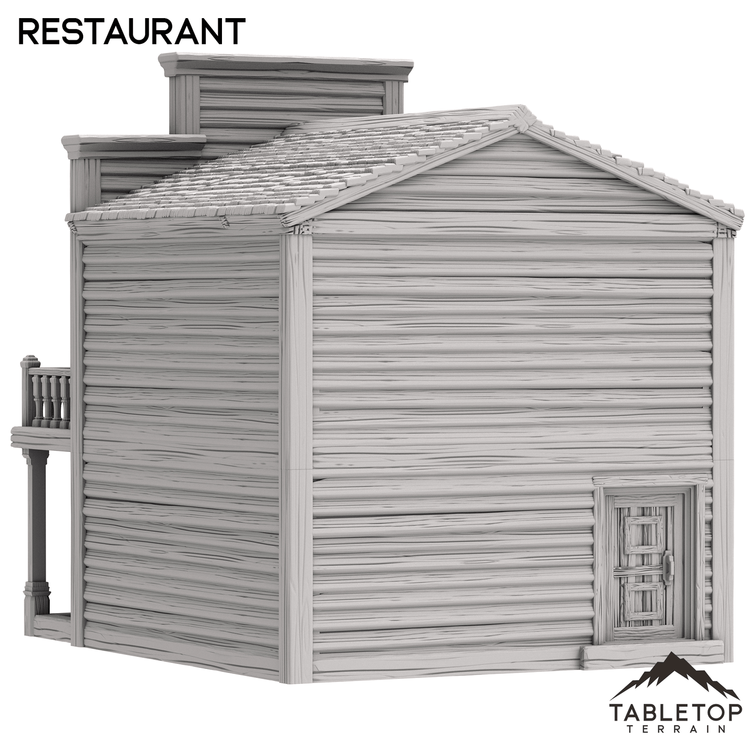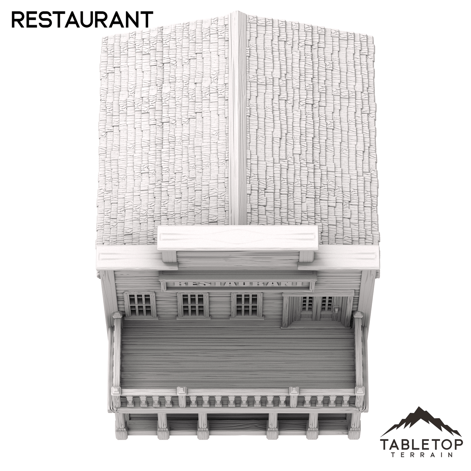 The Restaurant is an Old West themed two-story building. The roof is removable for interior miniature placement on the upper and lower levels.