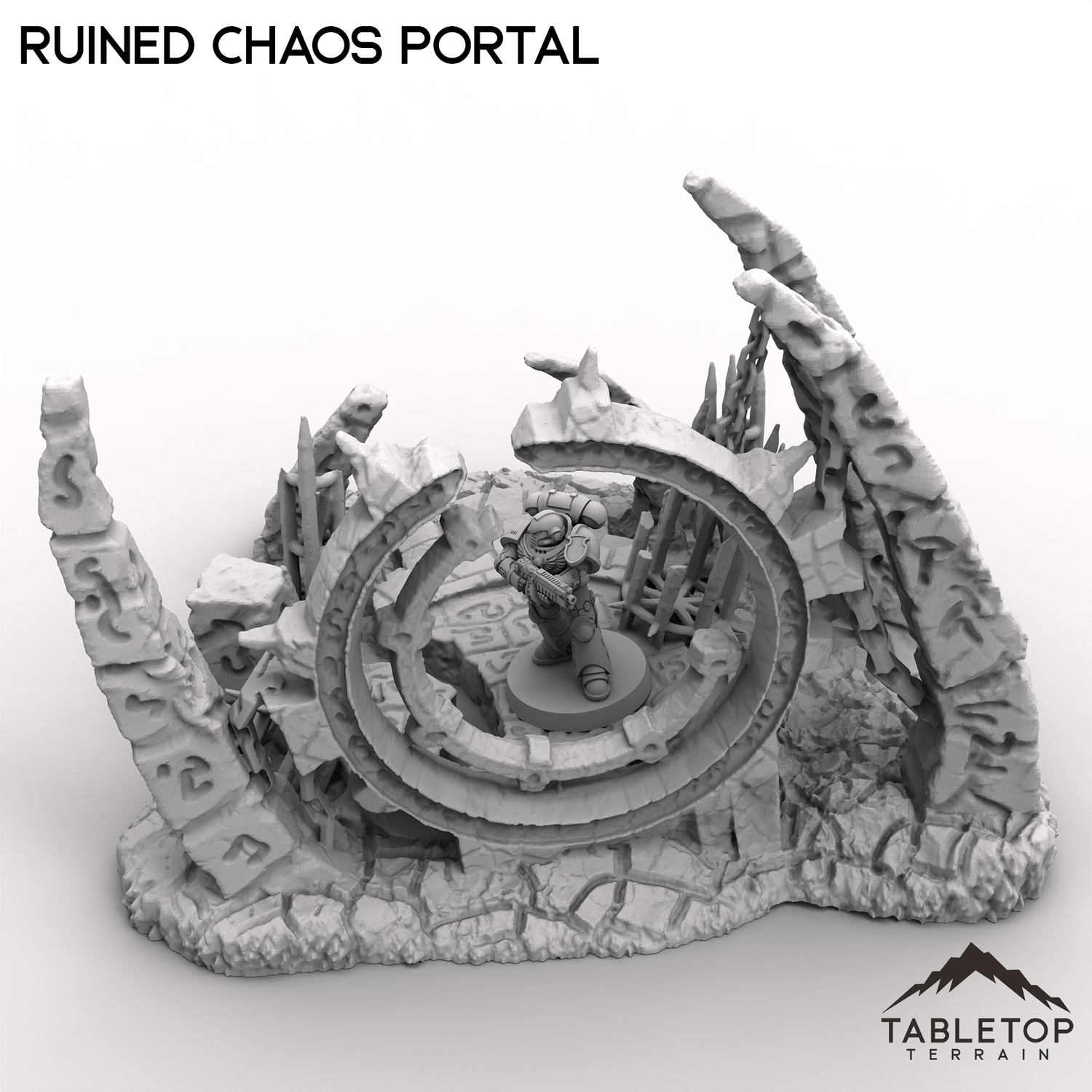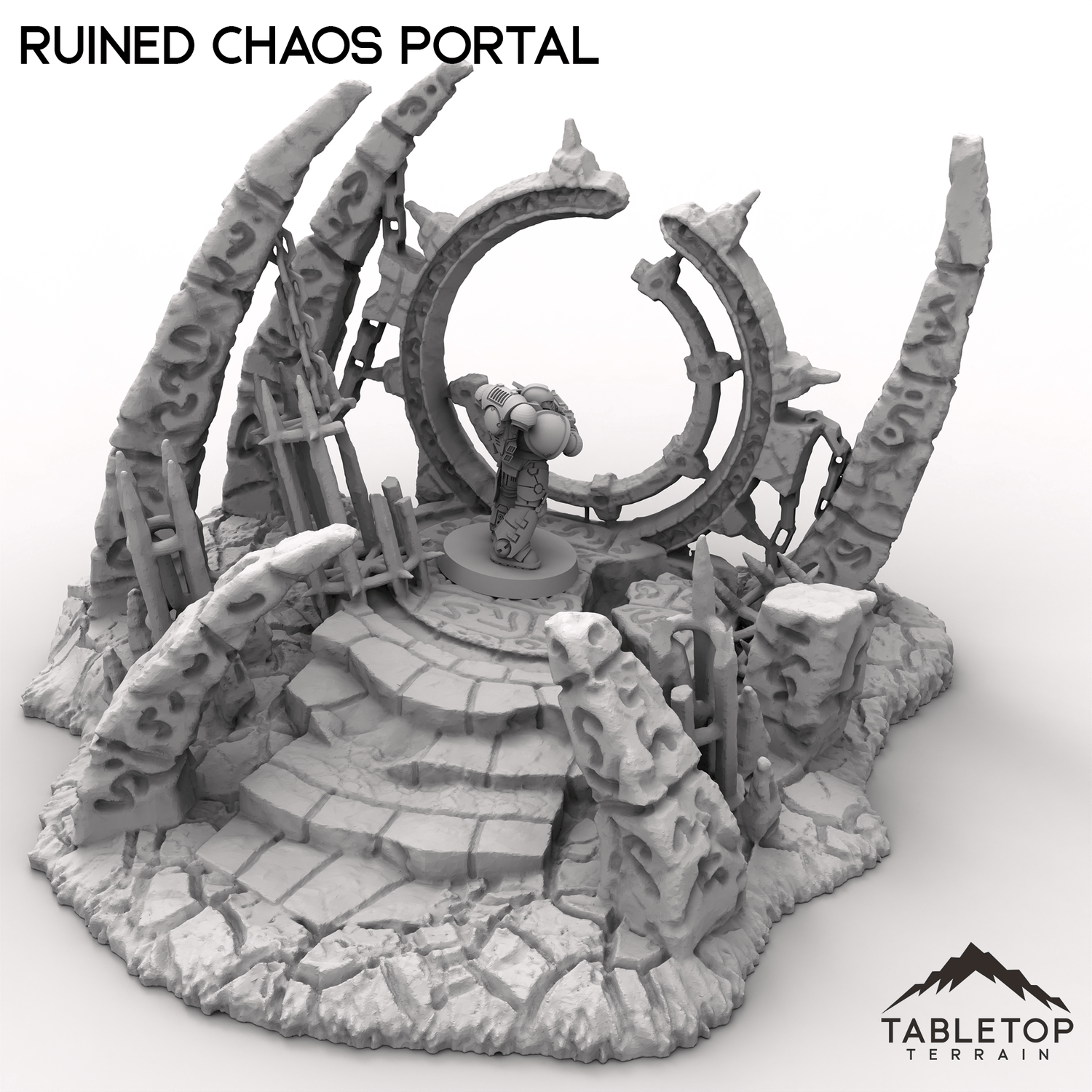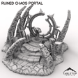 The Ruined Chaos Portal is a single-piece, standing a little over half a foot tall at 28mm scale. The portal features arcane runes inscribed along the portal's spines, and harsh spikes projecting from the central ring. The platform leads down to a set of stone steps, and cobblestone foundations.