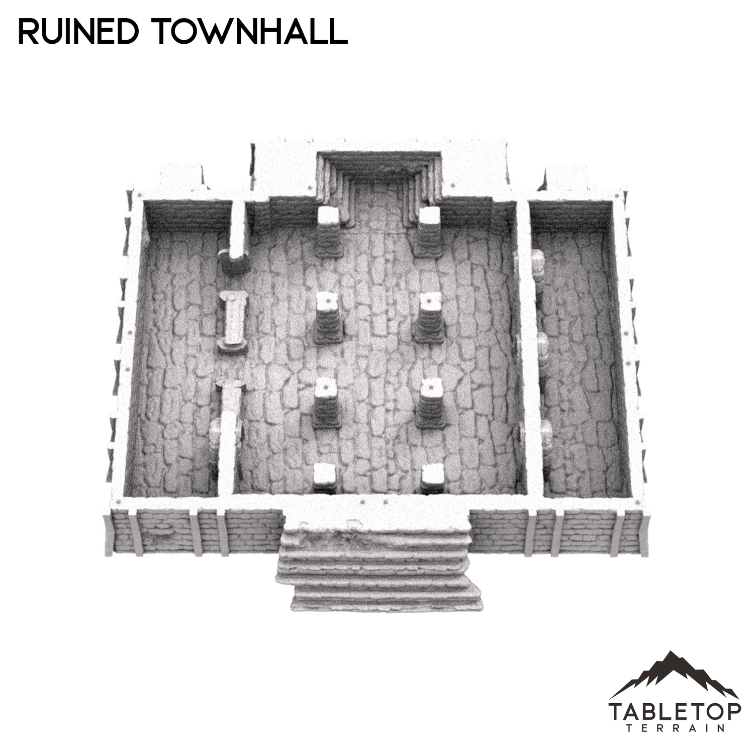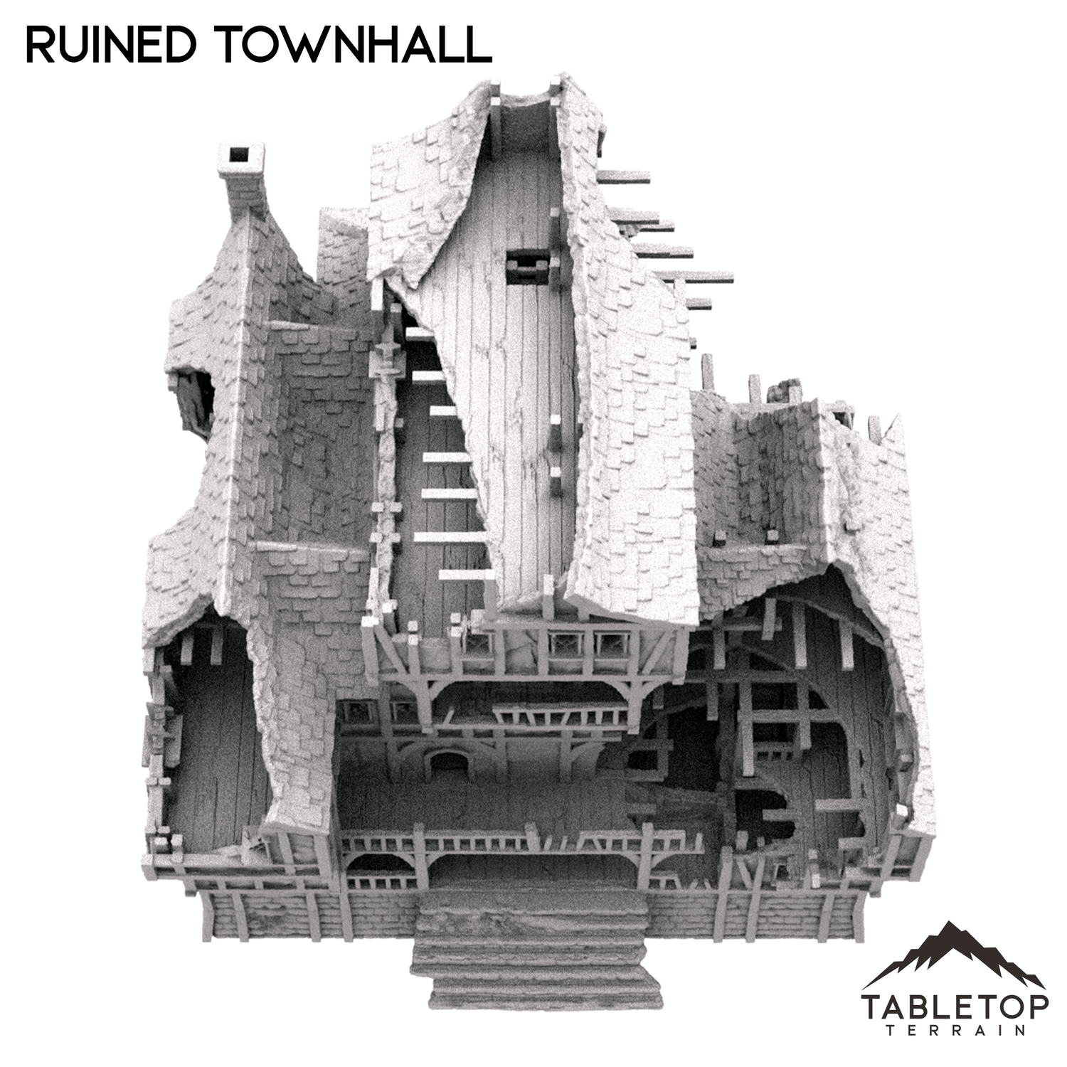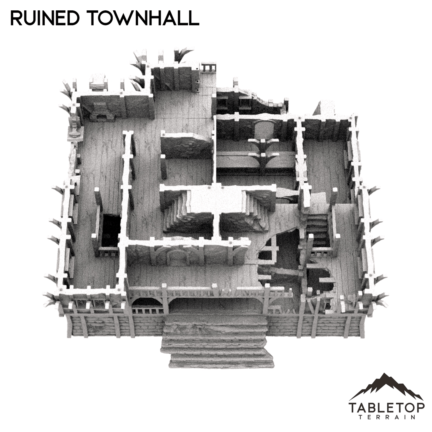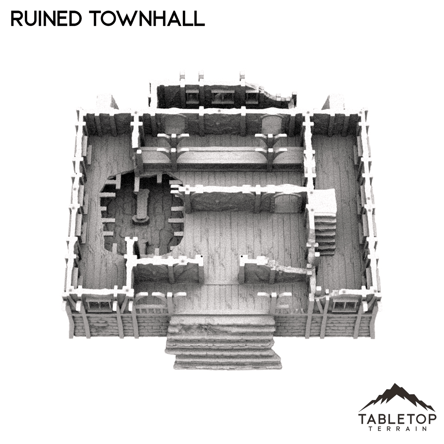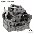 The Ruined Townhall is a wide stand alone building, decrepit and abandoned. Large swaths of the building have been destroyed, rending the townhall into a massive ruin. The building spans 6 stories including a basement, each fully functional with plenty of open space and rooms for placing minis or traps. The Ruined Townhall is available in 28mm, 20mm, and 15mm scales.