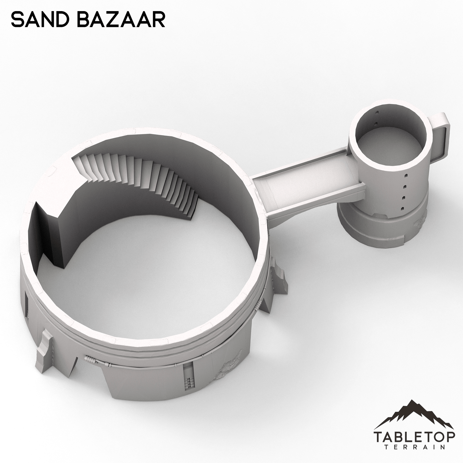 The Desert Sand Bazaar is a building with a detached tower connected by an elevated walkway. It would work great for Star Wars Legion or other Sci-Fi games. The Bazaar is printed in 32mm, 28mm or 15mm scale with other scales available by request. The 32mm and 28mm scales are designed for Star Wars Legion.