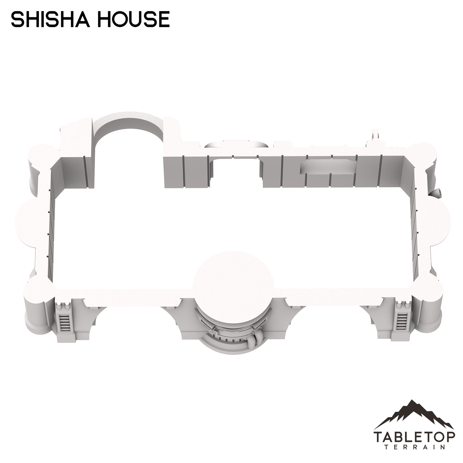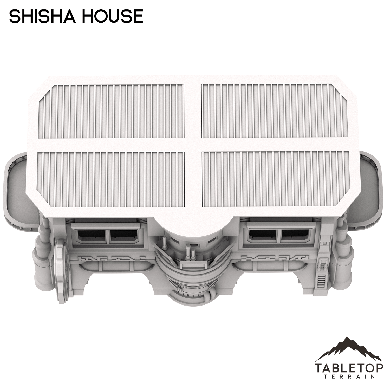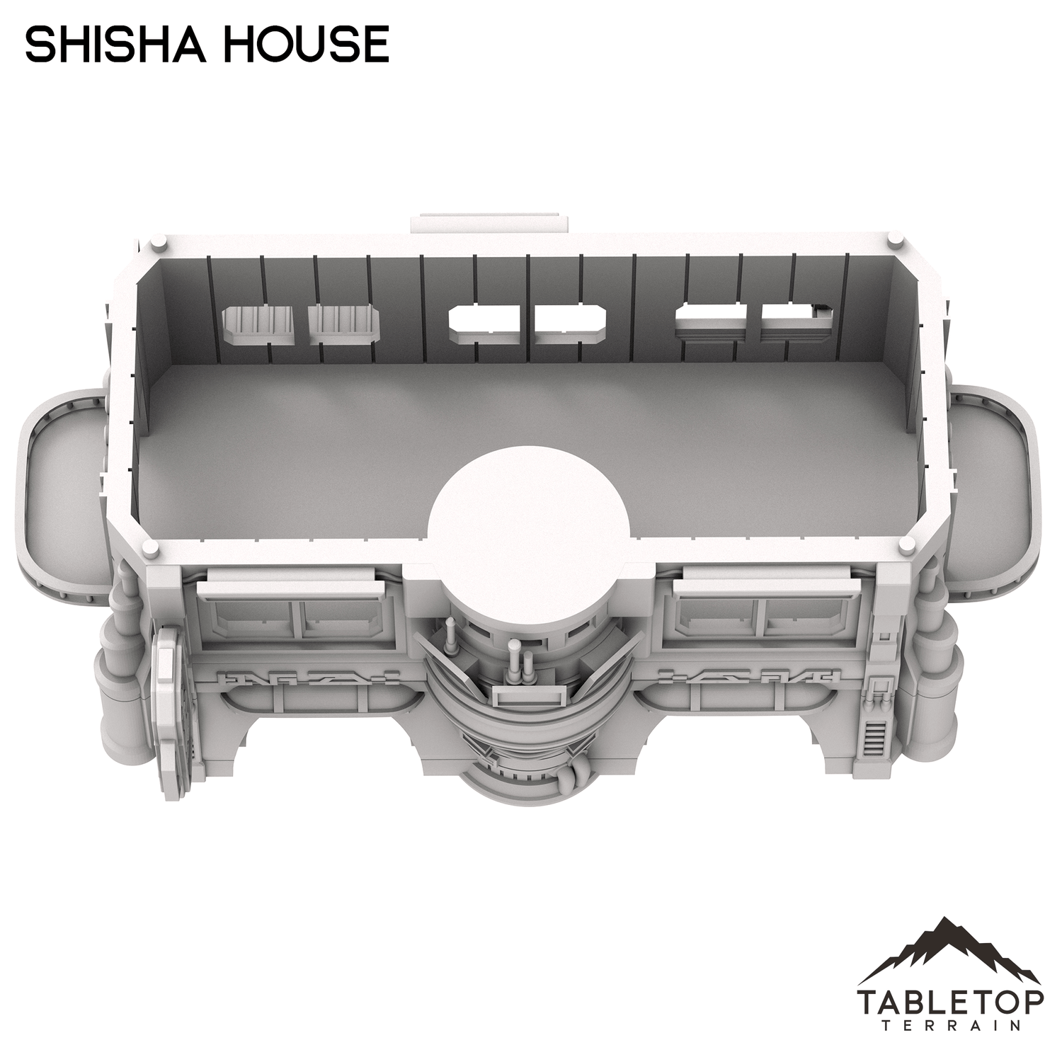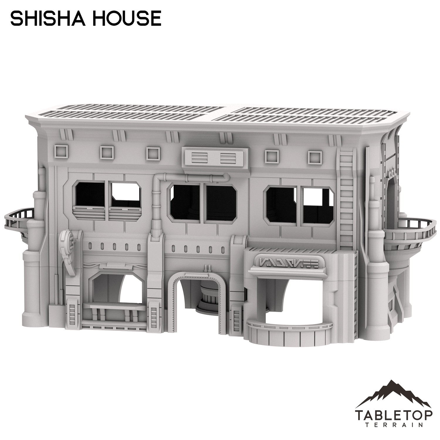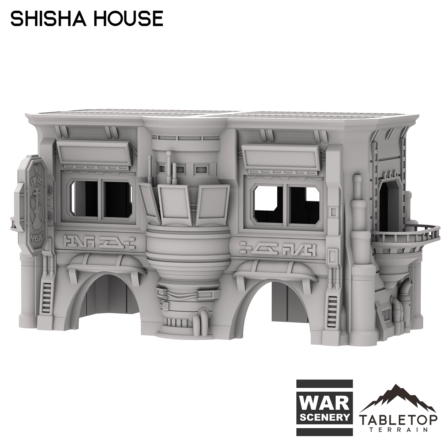 The Shisha House set comes as a 2-story building, made as part of a sci-fi city's layout. The building takes from a number of design inspirations, has a fully useable interior for minis, and has small balconies for easy access. The Shisha House is made for sci-fi tabletop games, but could work with any genre.