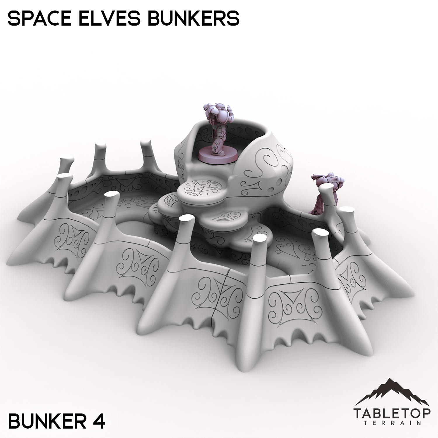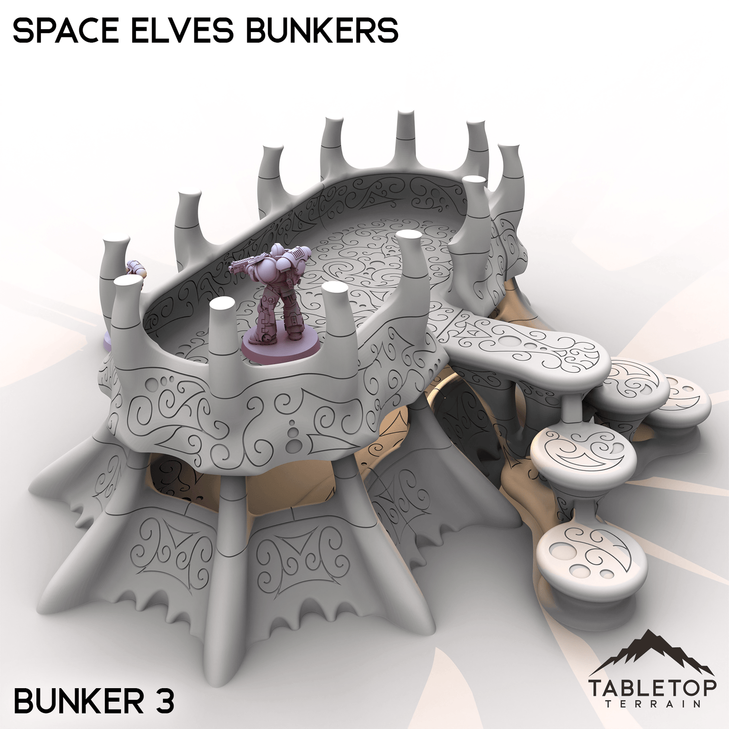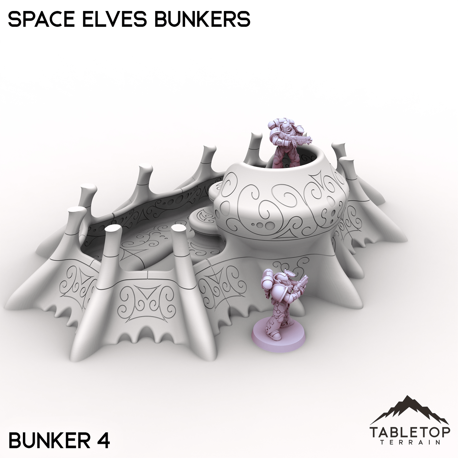 The Space Elves Bunkers are various sets of xenos terrain. Each bunker is made of multiple pieces and has removable roofs to allow for great miniature placement. These bunkers are designed for sci-fi wargames.