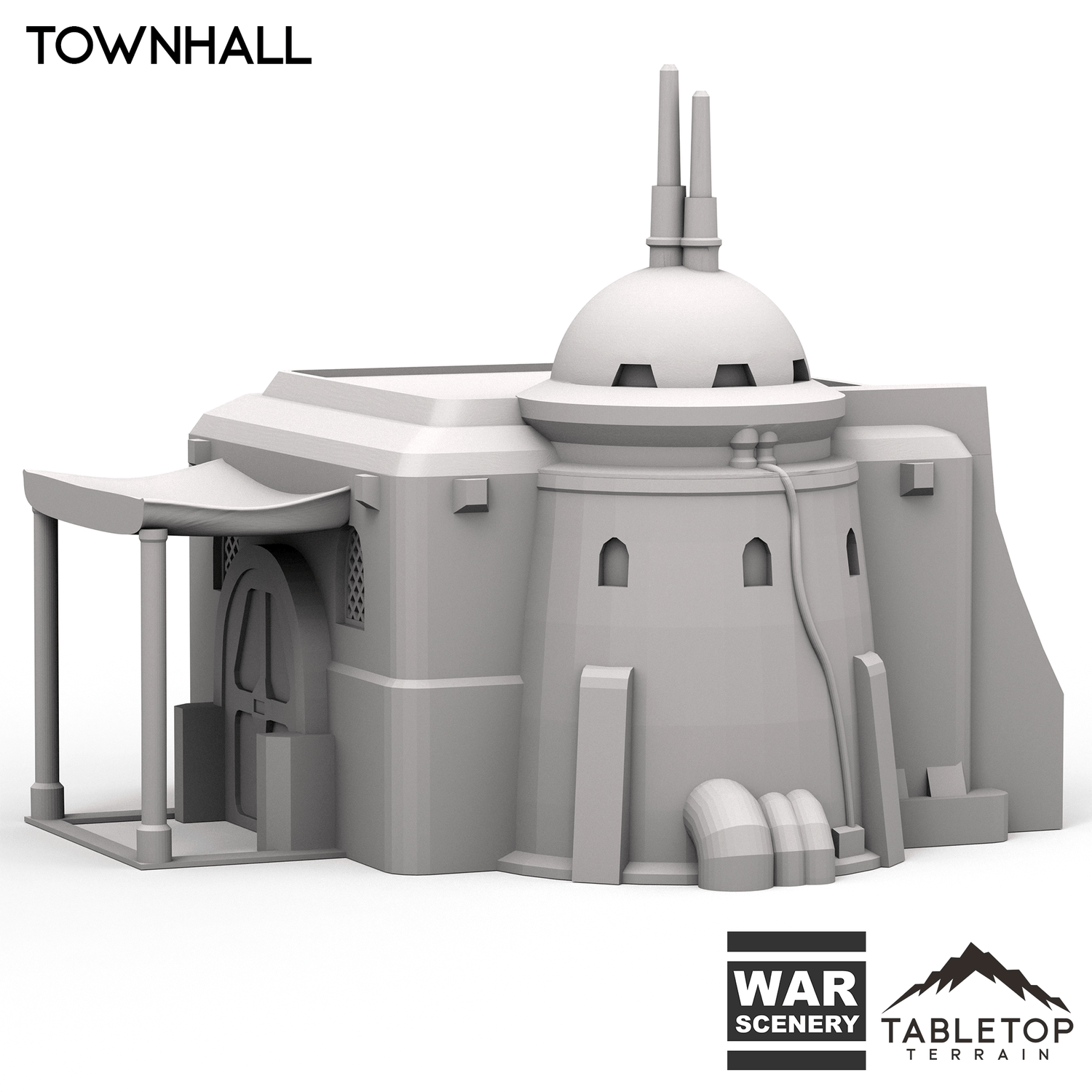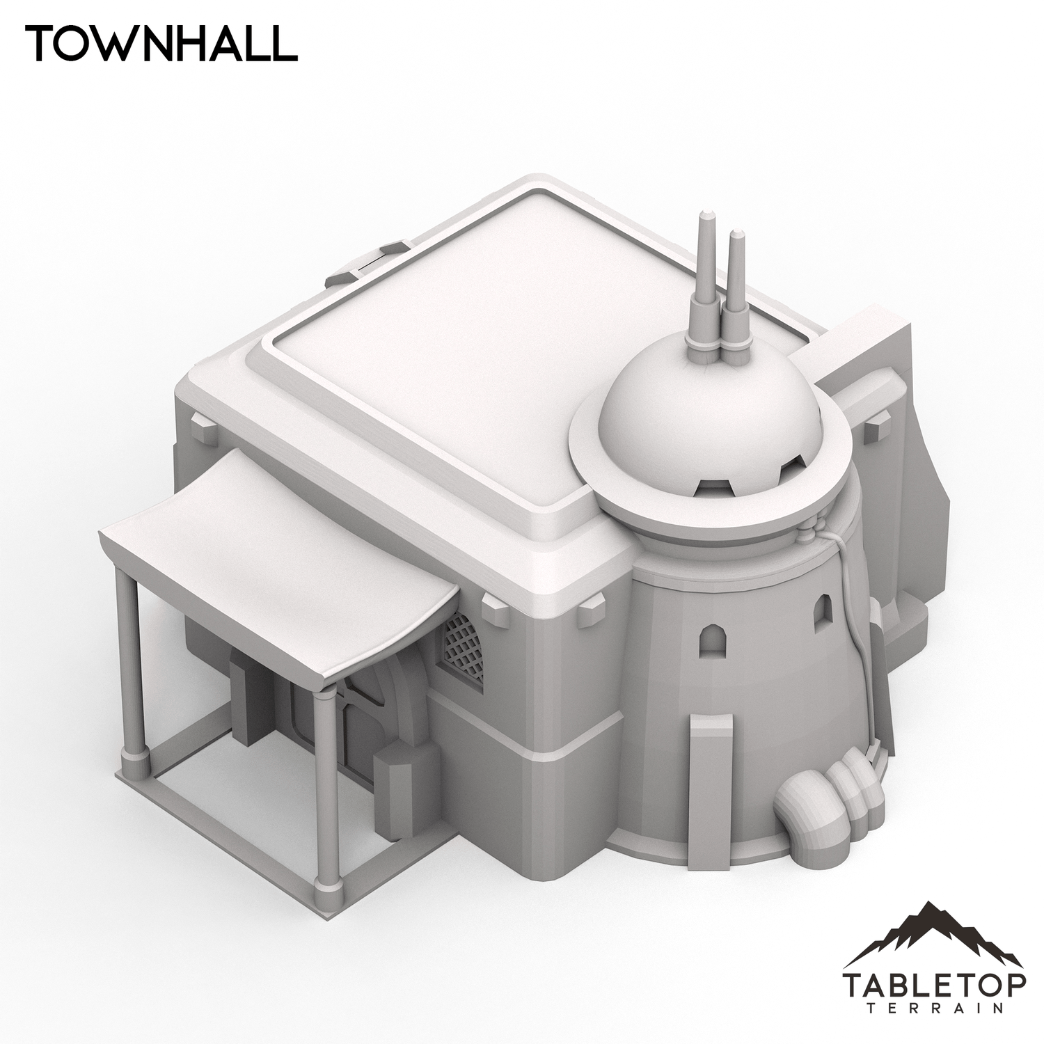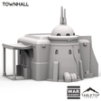 The Townhall has an awning covered patio and an attached tower like structure. The Building is printed in 40mm, 28-35mm (1:47), 20mm, and 15mm scale. We recommend the 40mm scale for Shatterpoint and the 28-35mm (1:47) scale for Legion.