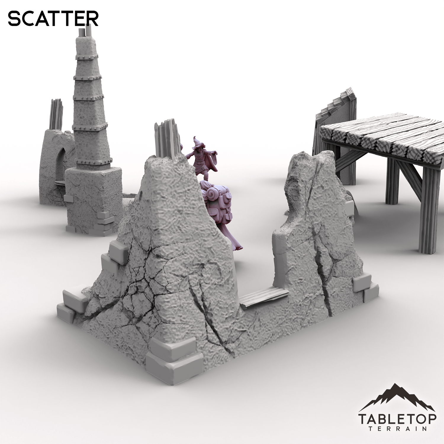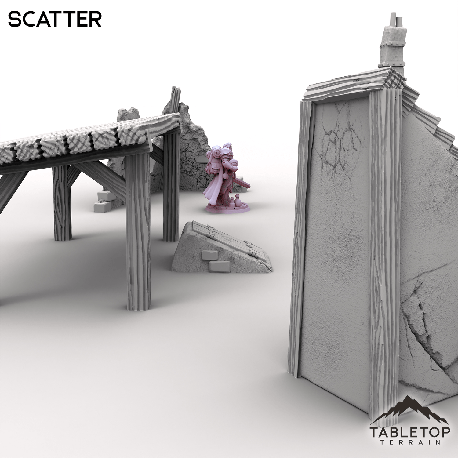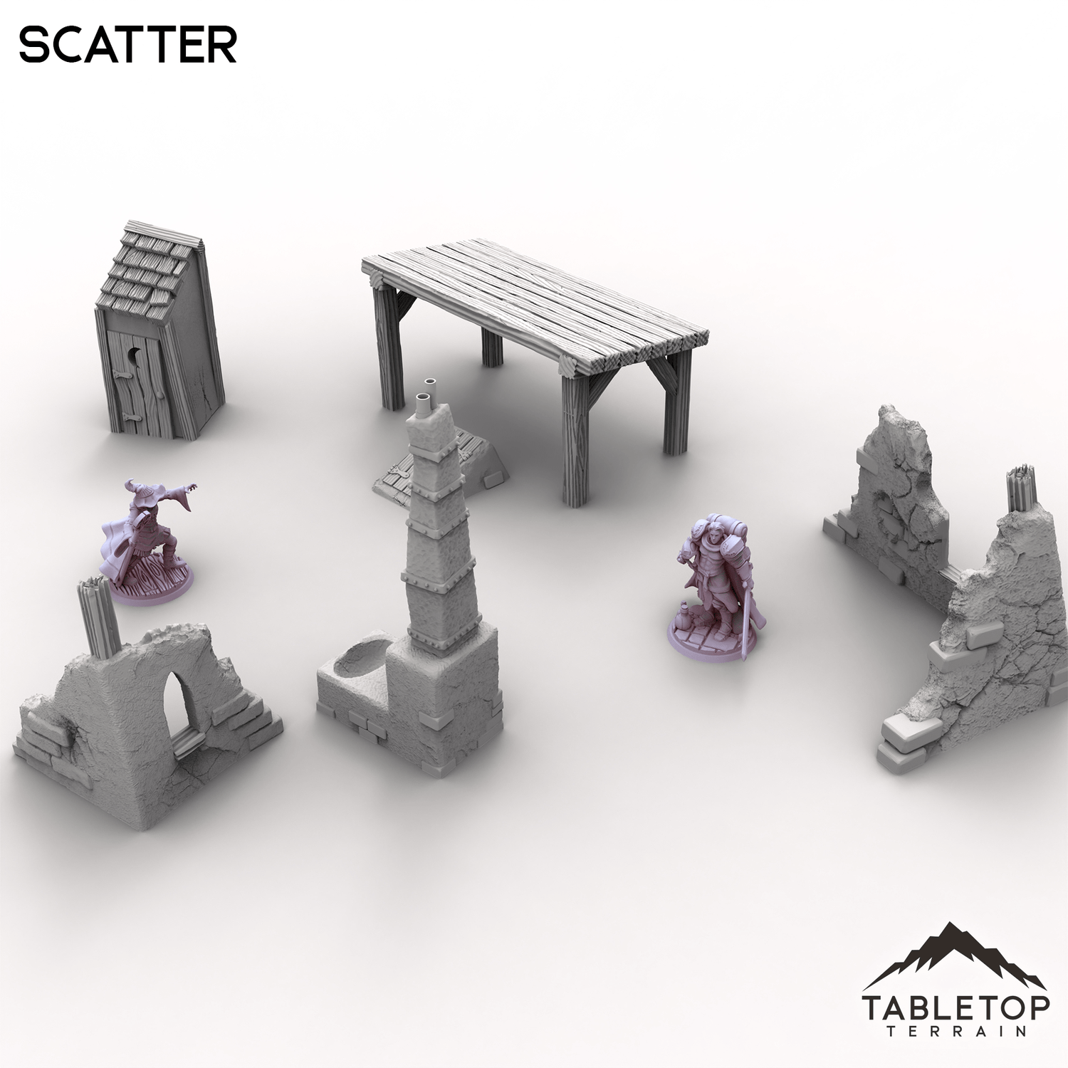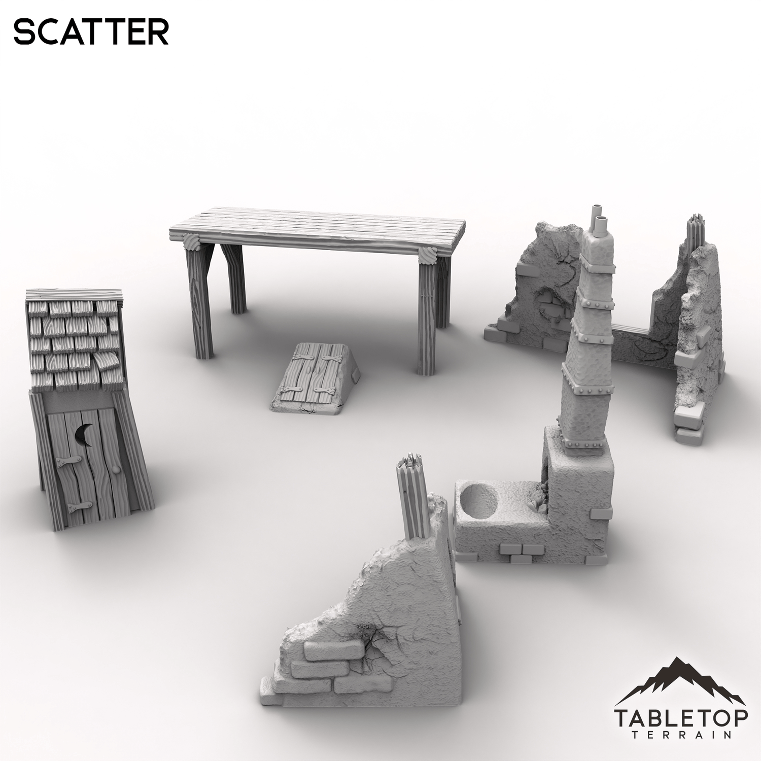 This collection of Scatter terrain is perfect for filling out the Vexed Village set. Includes a wonky outhouse, crooked forge, a heavy cellar door half-buried and chunks of ruined buildings. Whether scattered across a lonely path or clustered behind a haunted home, these bits of debris add a realistic feel to the Vexed Village.
